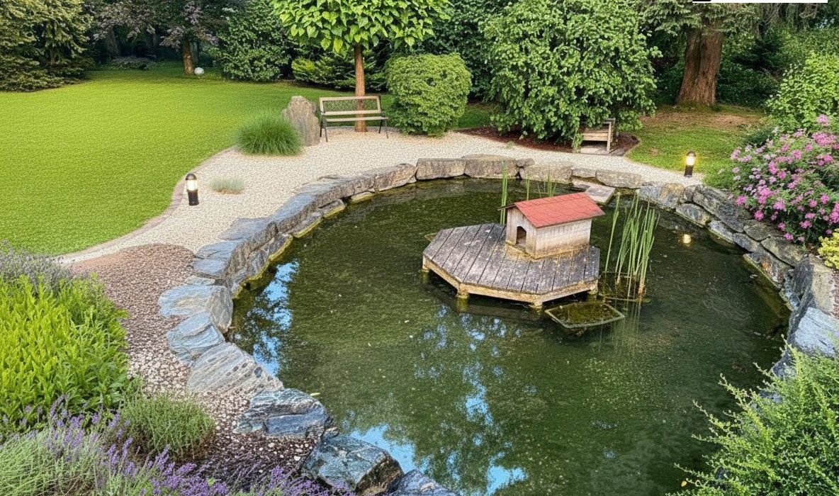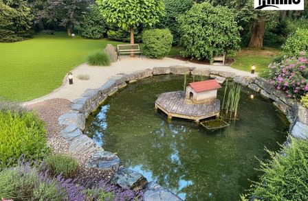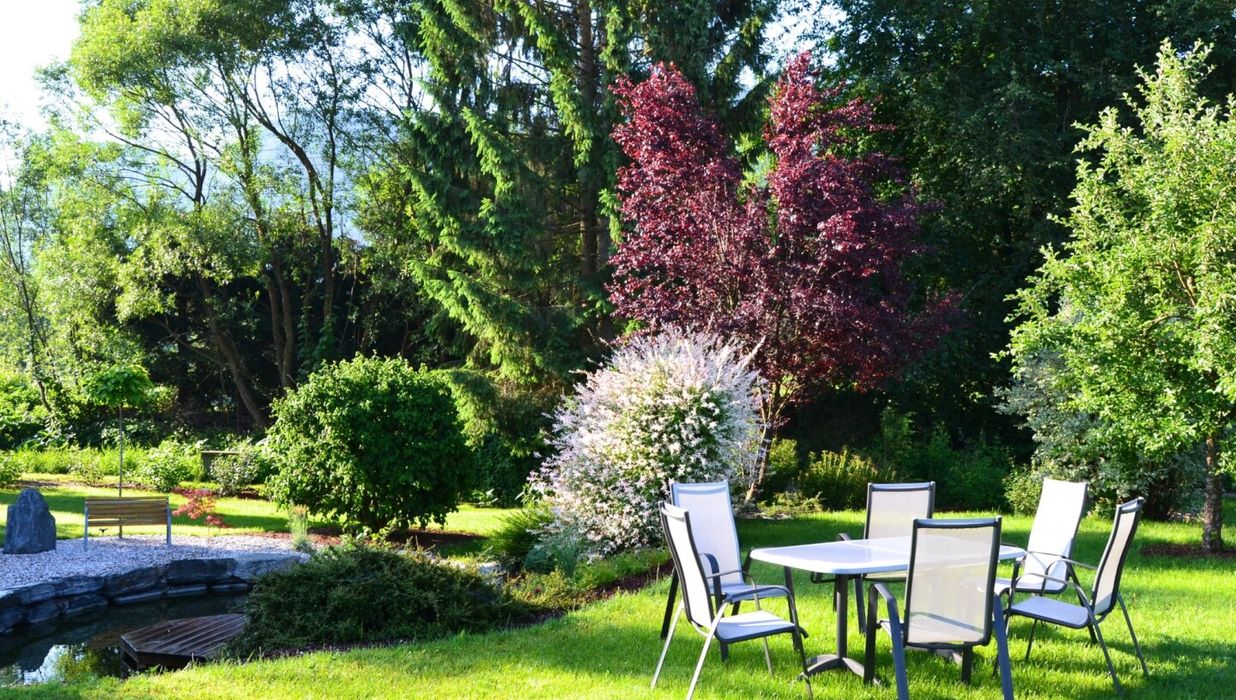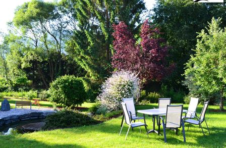 mit altem Baumbestand, liebevoll angelegten Grünflächen, einem kleinen Teich sowie einem natürlichen Bachlauf vermittelt ein Gefühl von Ruhe und Großzügigkeit.