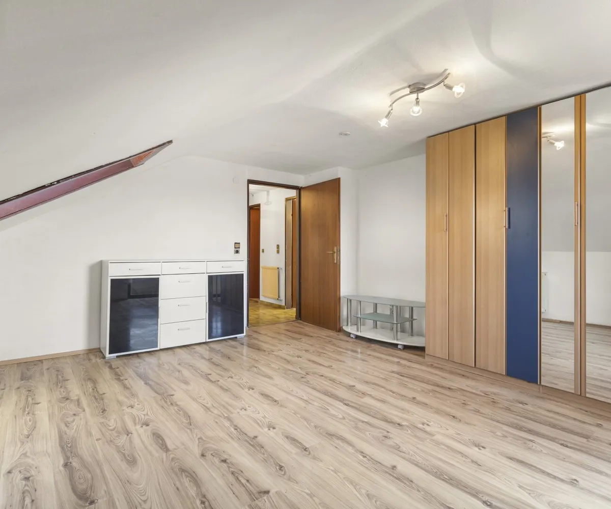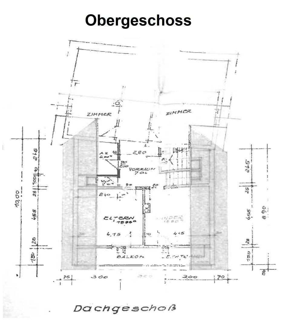OG im Zubau: Vorraum ca. 5,04m², eine Garderobe ca. 2,01m², ein WC ca. 1,15 m², ein Bad ca. 2,15m², ein Elternschlafzimmer ca. 19,05m², ein Wohnzimmer ca. 24,05m², eine Küche ca. 8,00m² und ein Balkon ca. 8,05m².