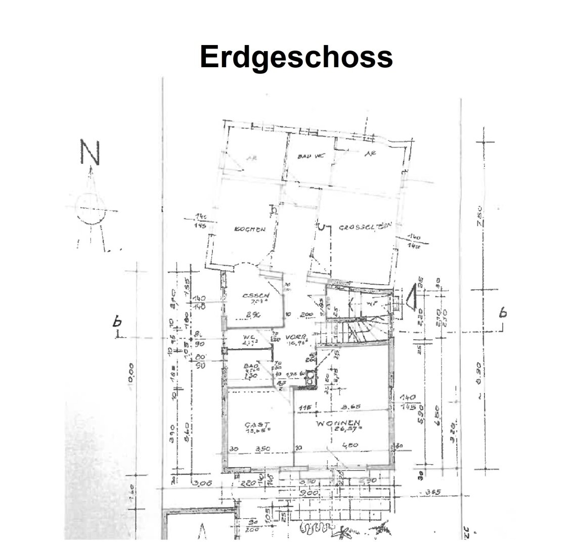 EG im Altbau: Vorraum 5,00m², ein Wohnzimmer ca. 16,07m², eine Küche ca. 7,00m², ein Bad mit WC ca. 6,05m² und eine Abstellkammer.