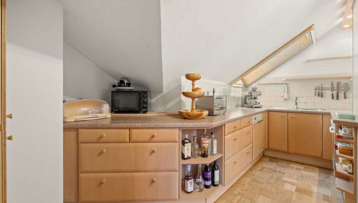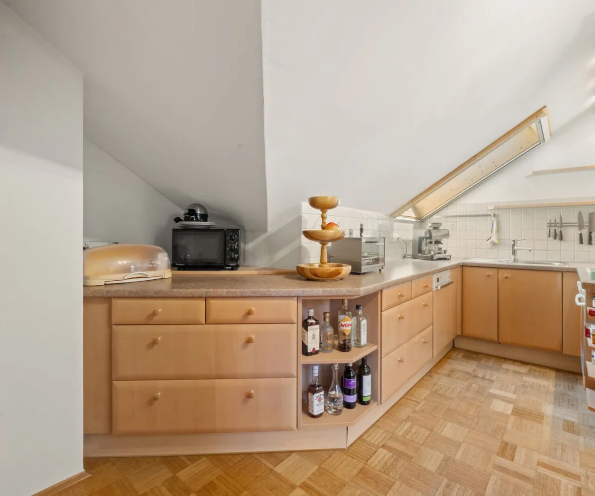 Dachgeschoss: Schöne Einbauküche mit Geräten und Einbaumöbeln.