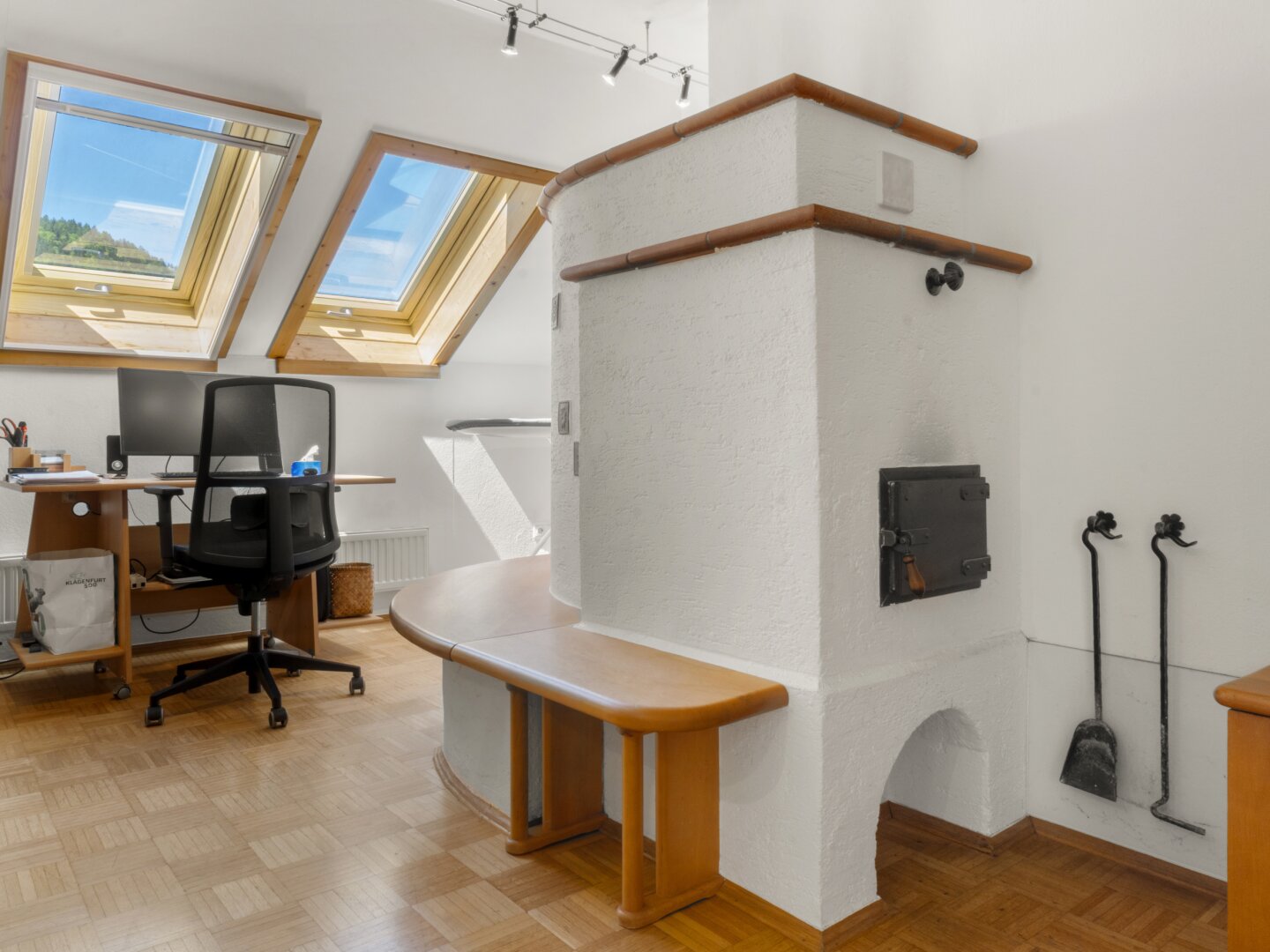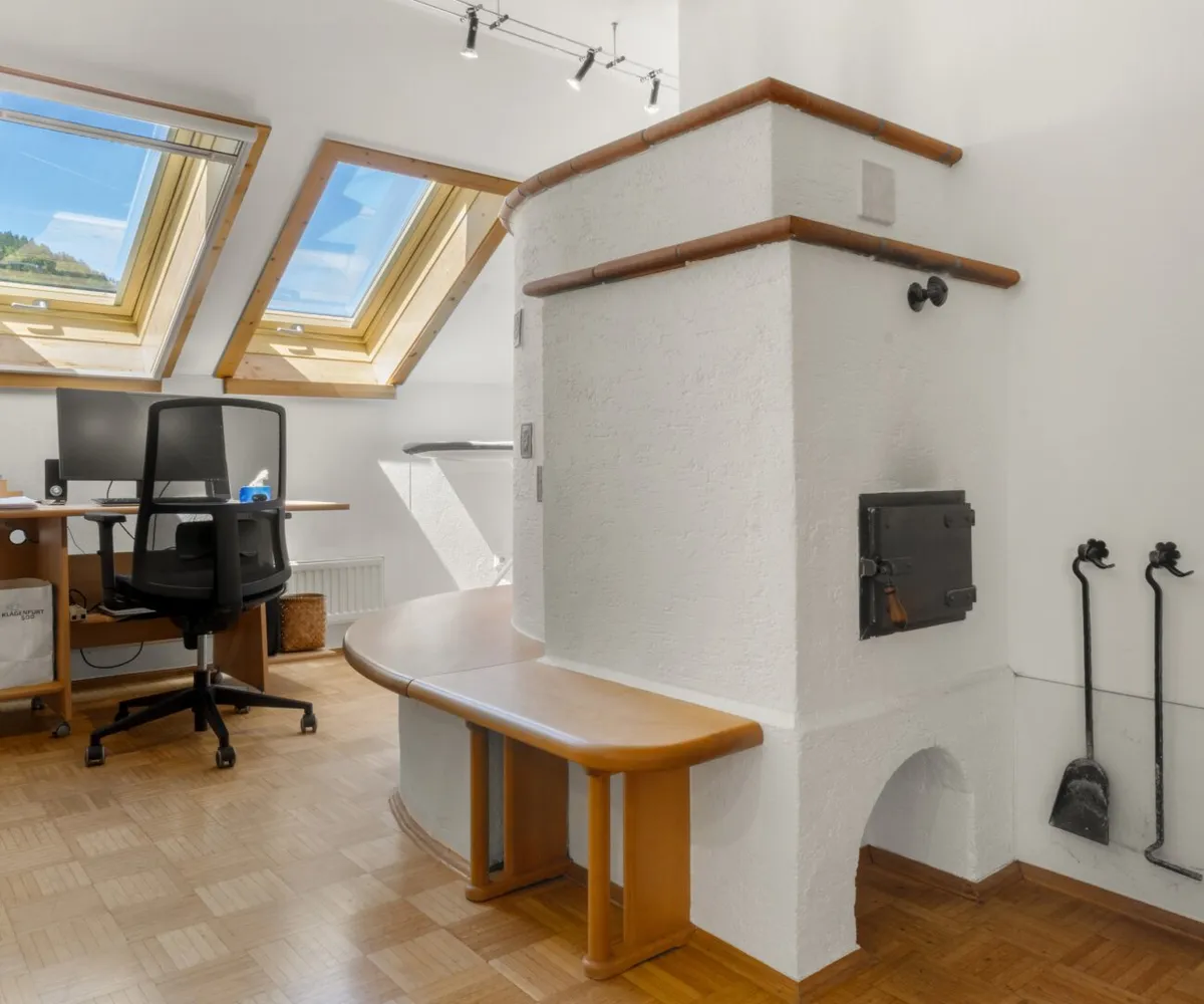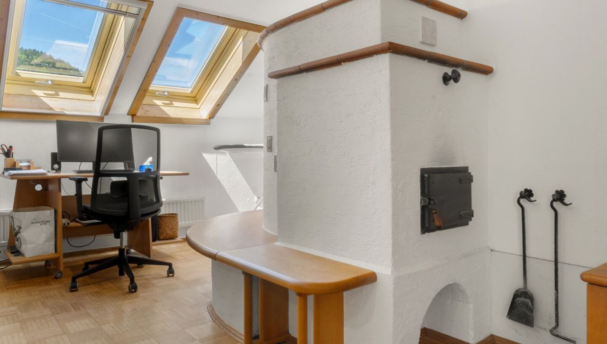 Heizung: WOLF ÖL-Zentralheizng mit innenliegender Luftwärmepumpe für Warmwasser und zusätzlich Kachelofen in der Dachgeschosswohnung.