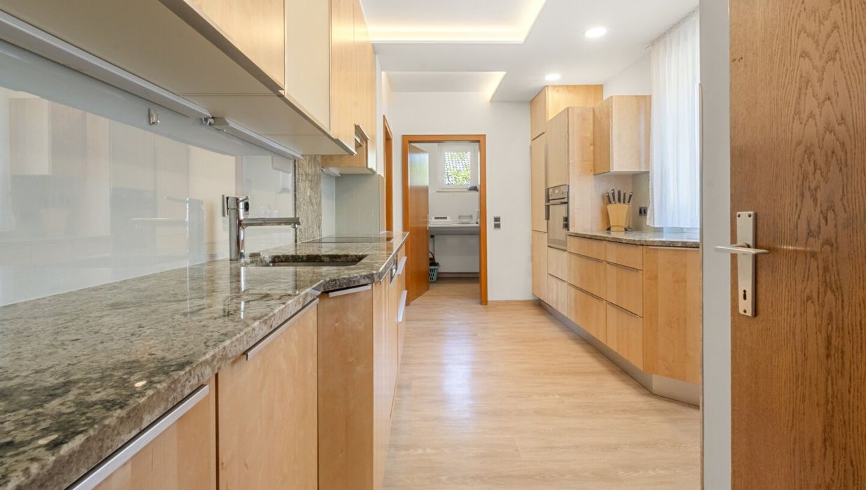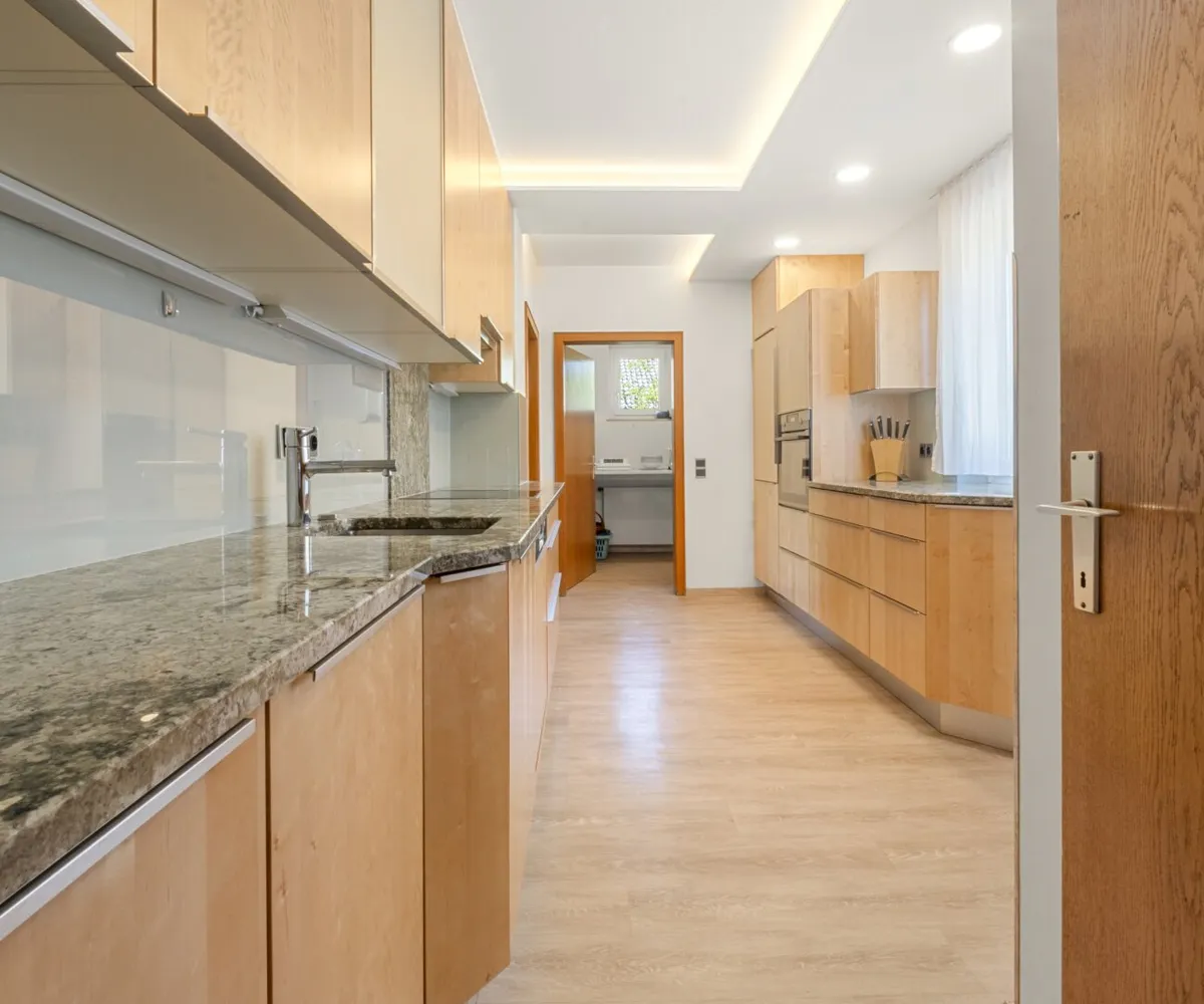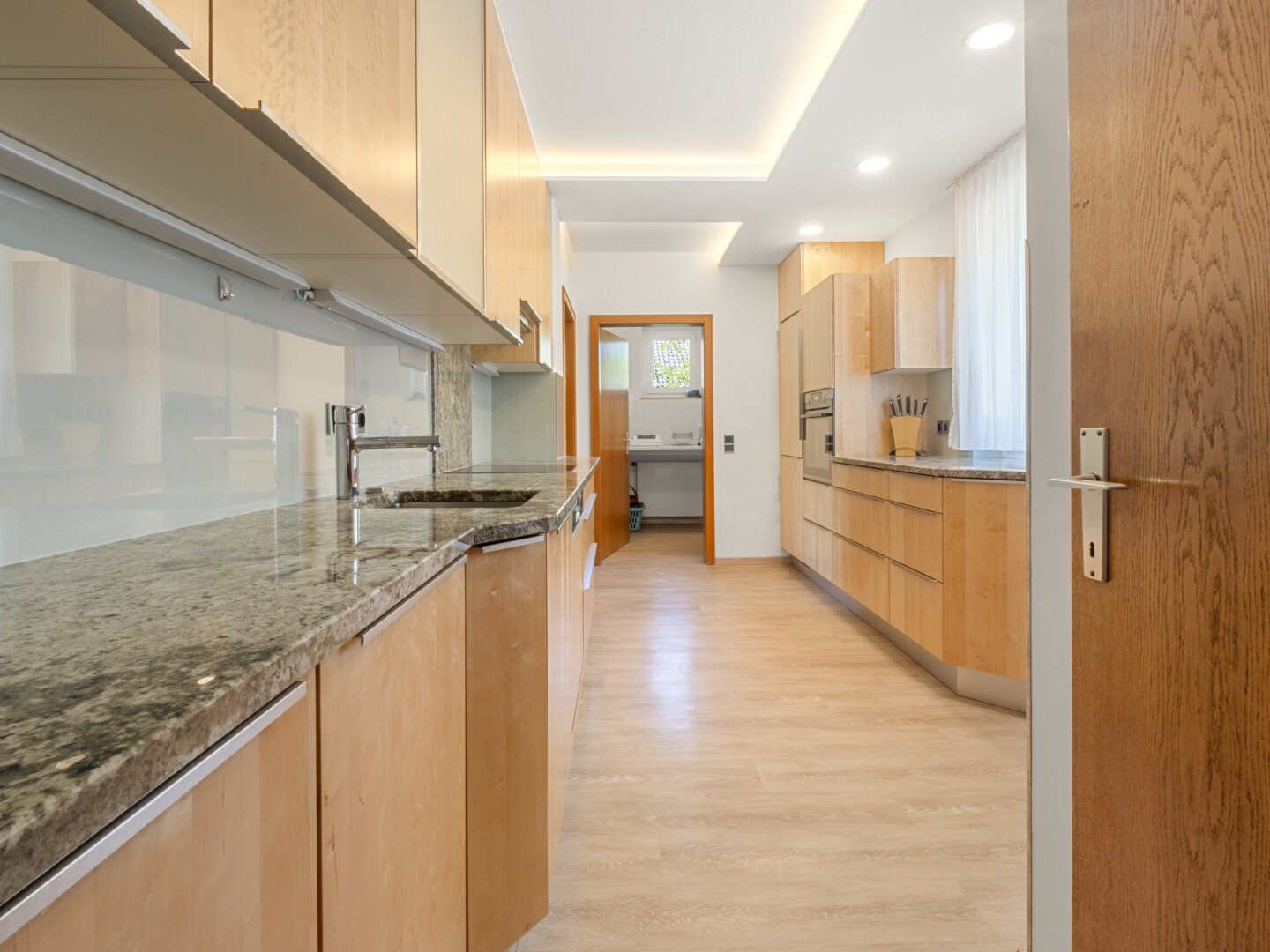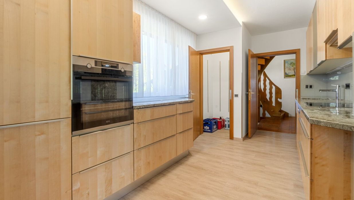 Erdgeschoss: Designereinbauküche mit Bosch-Geräten und mit abgehängter Deckenbeleuchtung und Einbaumöbel.