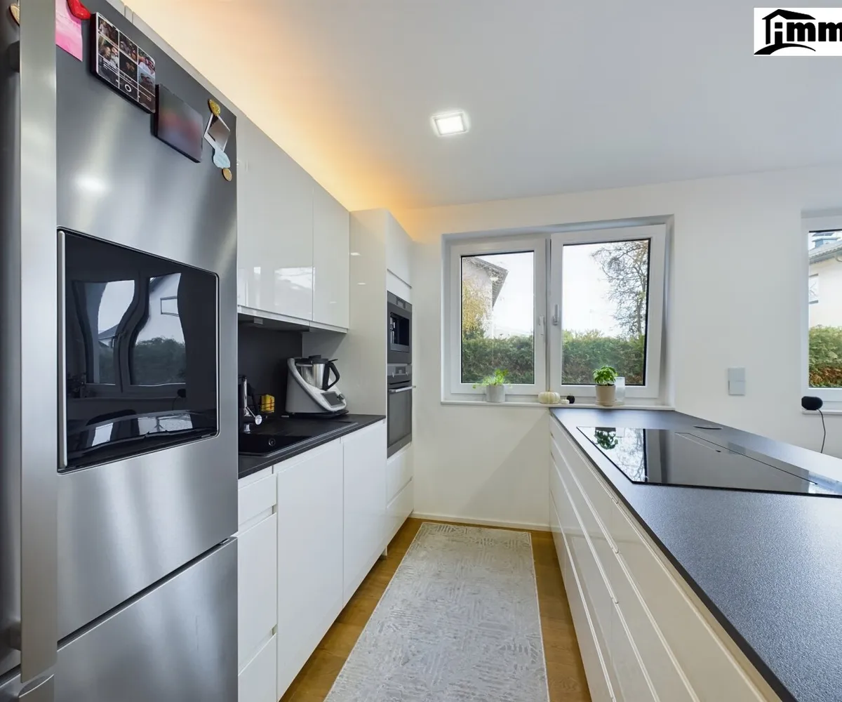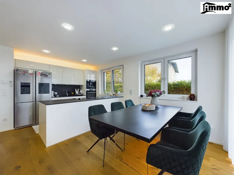 Der einladende Eingangsbereich führt direkt in den offen gestalteten Wohn- und Essbereich. Hier erwarten Sie großzügige, lichtdurchflutete Räume, die eine offene und einladende Atmosphäre schaffen. Die moderne Küche ist ideal in den Wohnraum integriert und bietet durch hochwertige Einbauten und ausreichend Stauraum maximalen Komfort. Dank der Fußbodenheizung genießen Sie eine behagliche Wärme, die besonders an kälteren Tagen für Wohlbefinden sorgt. Der warmluftführende Kamin der Marke Hoxter lädt dazu ein, gemütliche Abende am prasselnden Feuer zu verbringen.