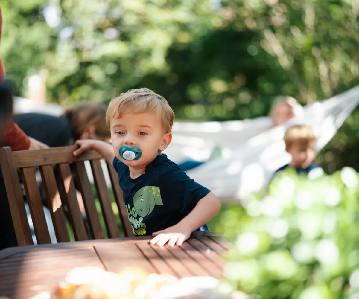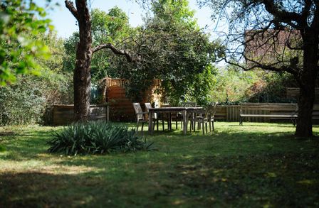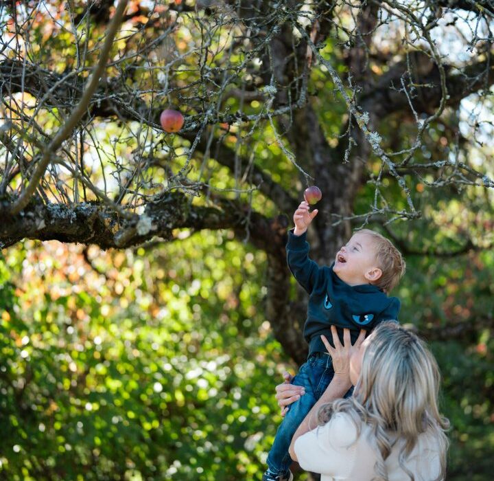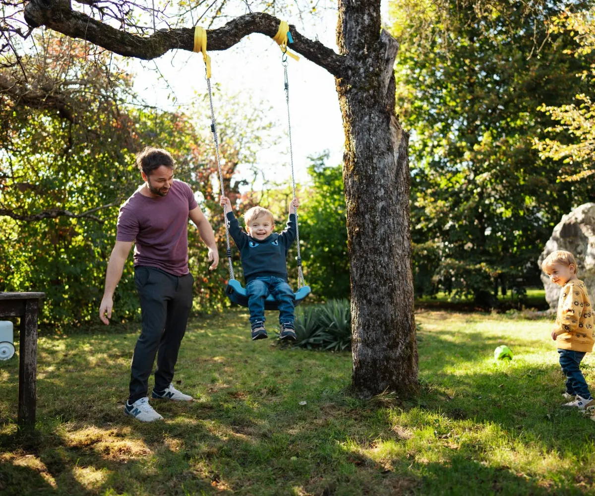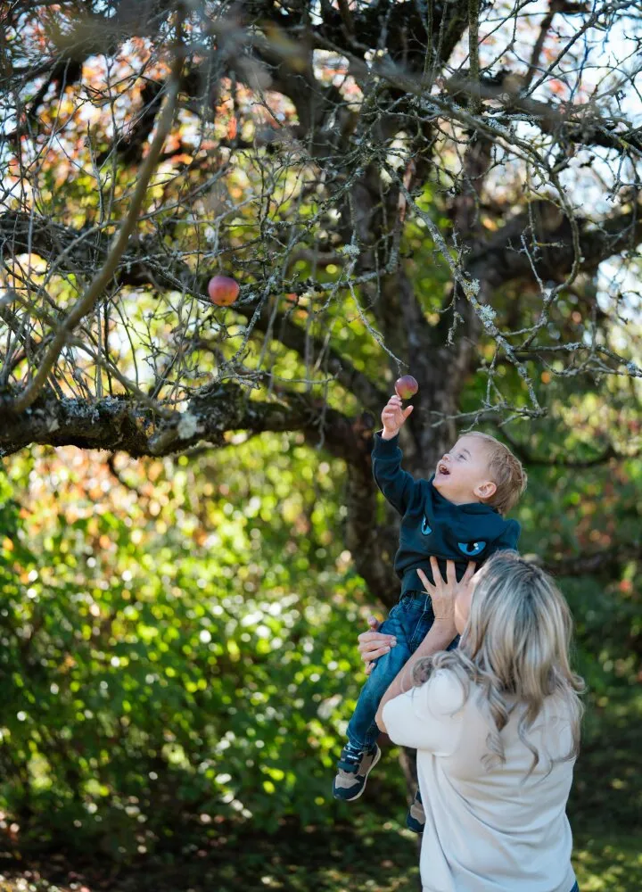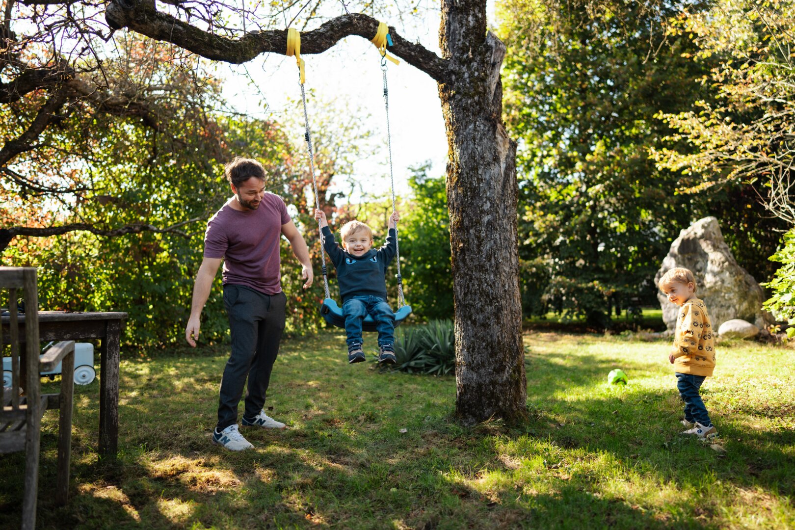 Die überdachte Terrasse erweitert den Raum und lässt das Zuhause nahtlos ins Grüne übergehen. Stufen aus Klinkerstein führen in den Garten. Und der endet nicht etwa an den mächtigen alten Obst-und Nadelbäumen – dahinter versteckt überraschen noch mehr Lieblingsplätze am eigenen Grundstück. Umgeben von naturbelassenem Flair wirbeln die Kinder übermütig umher. Jetzt wird´s wild: Zeit zum Fußball spielen und Schaukeln am Apfelbaum. Und der Blick in Richtung Haus: Malerisch. Wildes Grün umrahmt die Sicht. Und da kommt auch Mama, sie bringt Saft und Süßes!