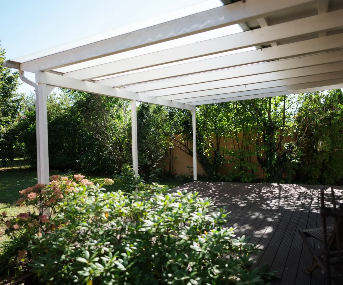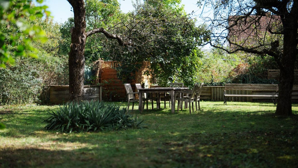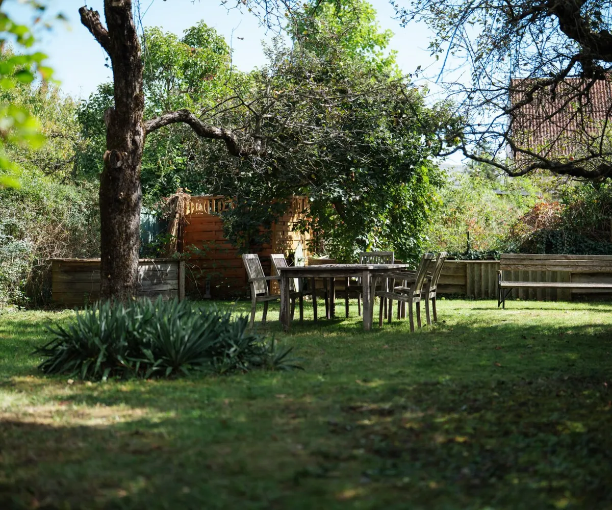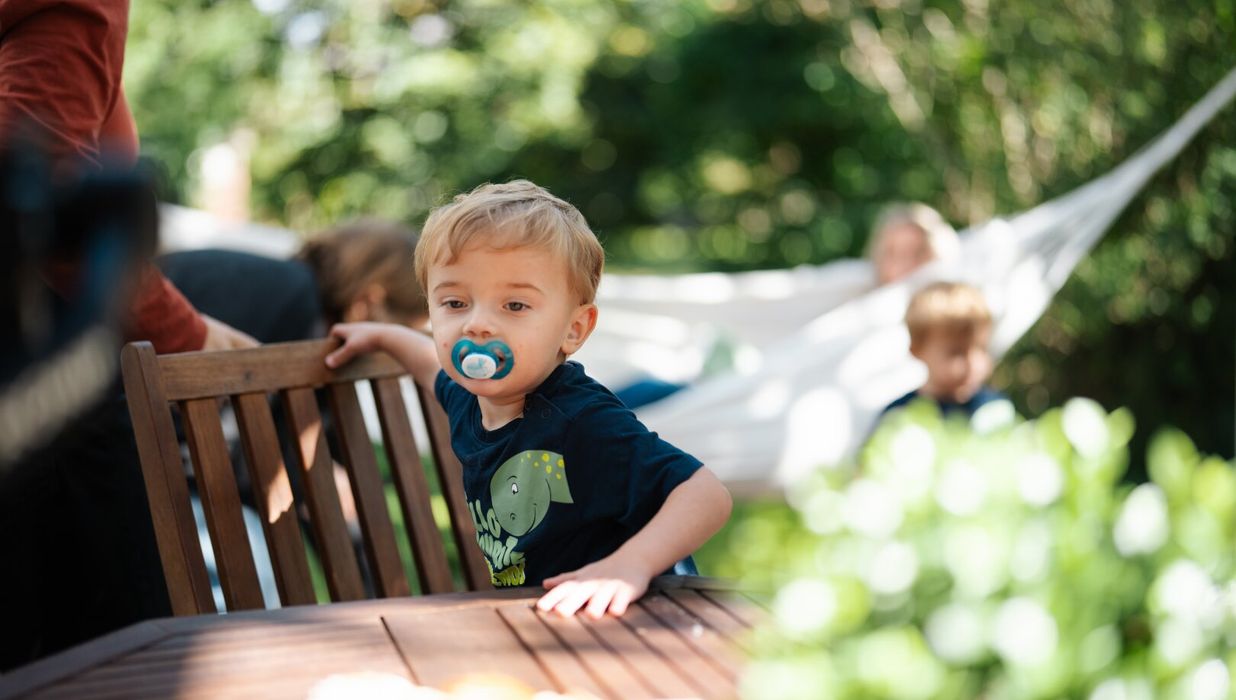 Die überdachte Terrasse erweitert den Raum und lässt das Zuhause nahtlos ins Grüne übergehen. Stufen aus Klinkerstein führen in den Garten. Und der endet nicht etwa an den mächtigen alten Obst-und Nadelbäumen – dahinter versteckt überraschen noch mehr Lieblingsplätze am eigenen Grundstück. Umgeben von naturbelassenem Flair wirbeln die Kinder übermütig umher. Jetzt wird´s wild: Zeit zum Fußball spielen und Schaukeln am Apfelbaum. Und der Blick in Richtung Haus: Malerisch. Wildes Grün umrahmt die Sicht. Und da kommt auch Mama, sie bringt Saft und Süßes!