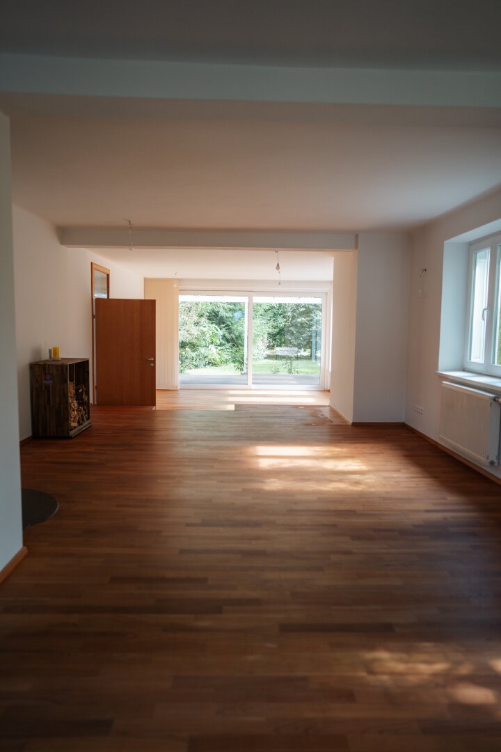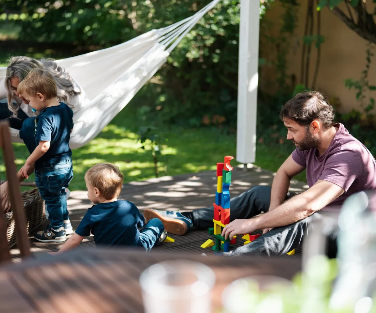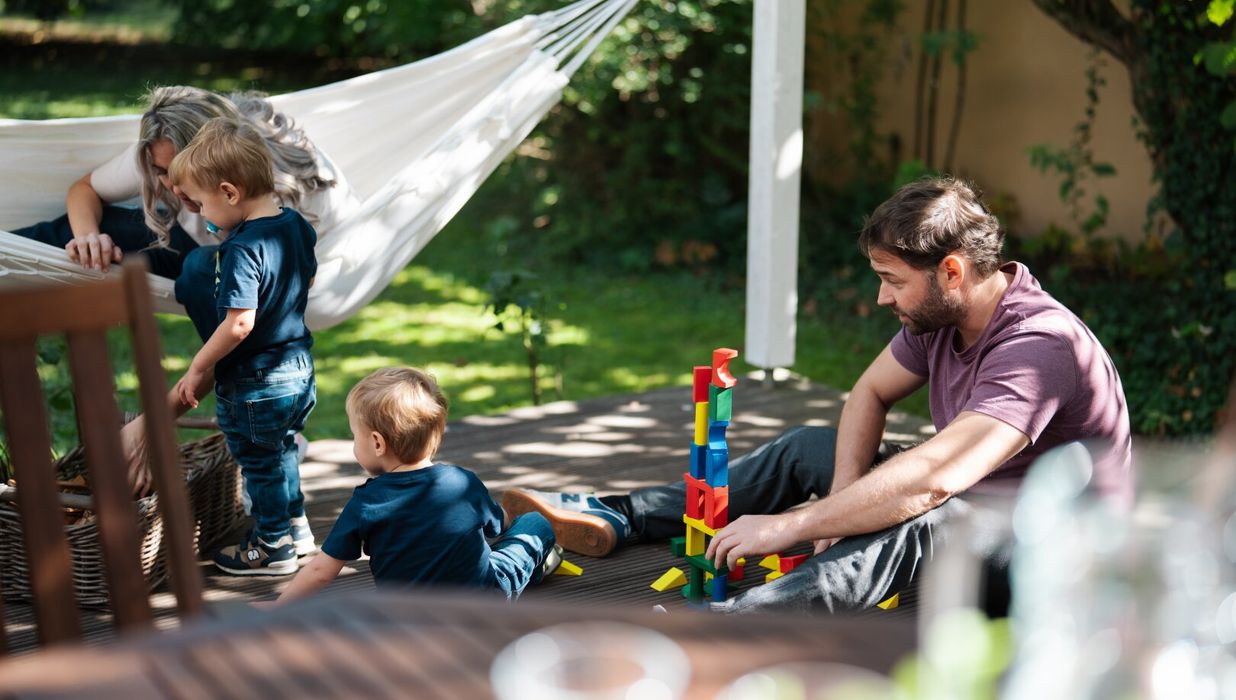 Lebendiges Licht strömt durch bodentiefe Fester. Eindringliches Grün umrahmt den Wohnraum von allen Seiten – als würde es Groß & Klein nach draußen locken. Schiebetüren stehen offen, Grenzen verschwimmen. Für Hängematten-Feelings, für Spiel & Spaß. Der Garten wird zur Bühne für das Familienleben. Drinnen & Draußen. Alles ist eins.