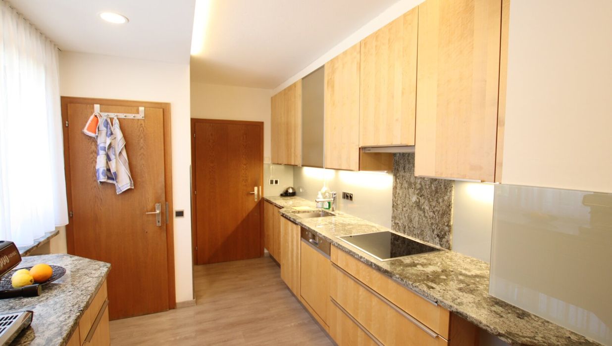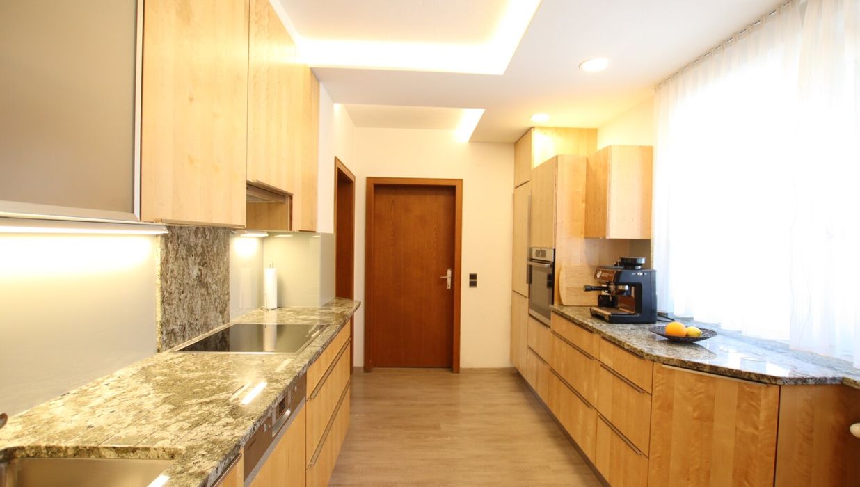 Erdgeschoss: Designereinbauküche mit Bosch-Geräten und mit abgehängter Deckenbeleuchtung und Einbaumöbel.