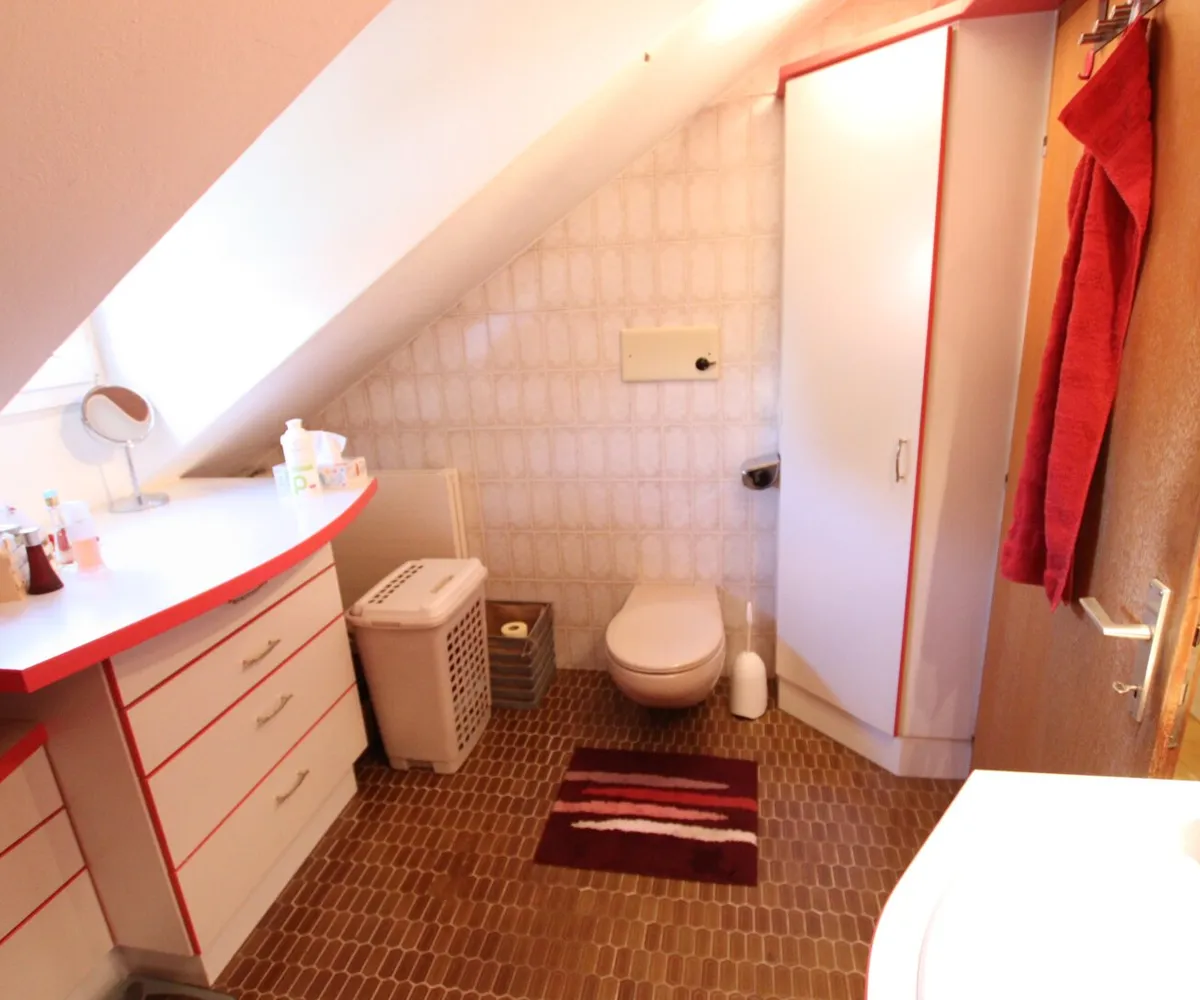 Heizung: WOLF ÖL-Zentralheizng mit innenliegender Luftwärmepumpe für Warmwasser und zusätzlich Kachelofen in der Dachgeschosswohnung.