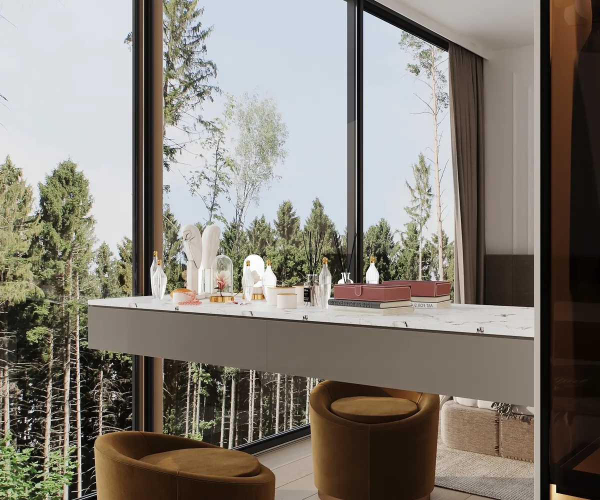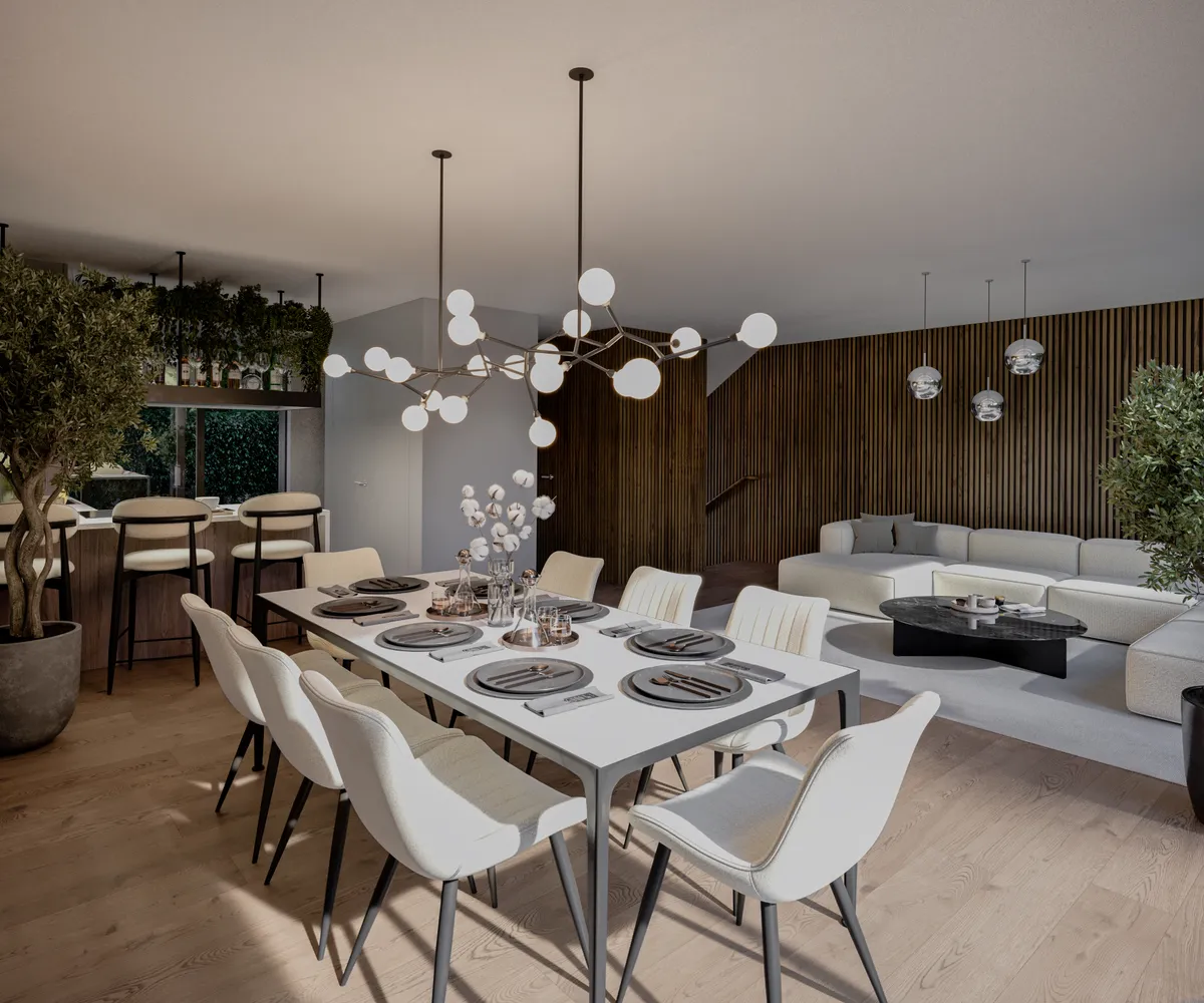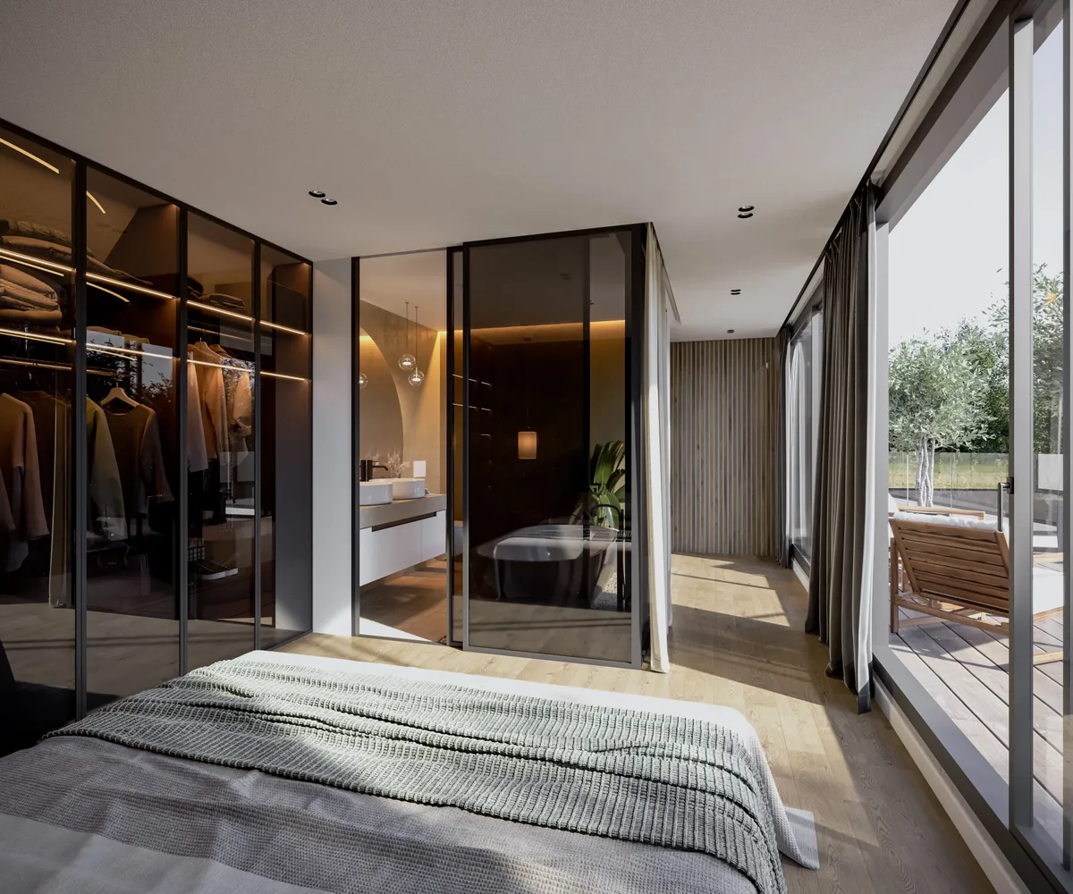 Die Wohnräume präsentieren sich lichtdurchflutet und großzügig – dank großflächiger, intelligent platzierter Fensterfronten, die nicht nur maximales Tageslicht ermöglichen, sondern zugleich ein hohes Maß an Privatsphäre bewahren.