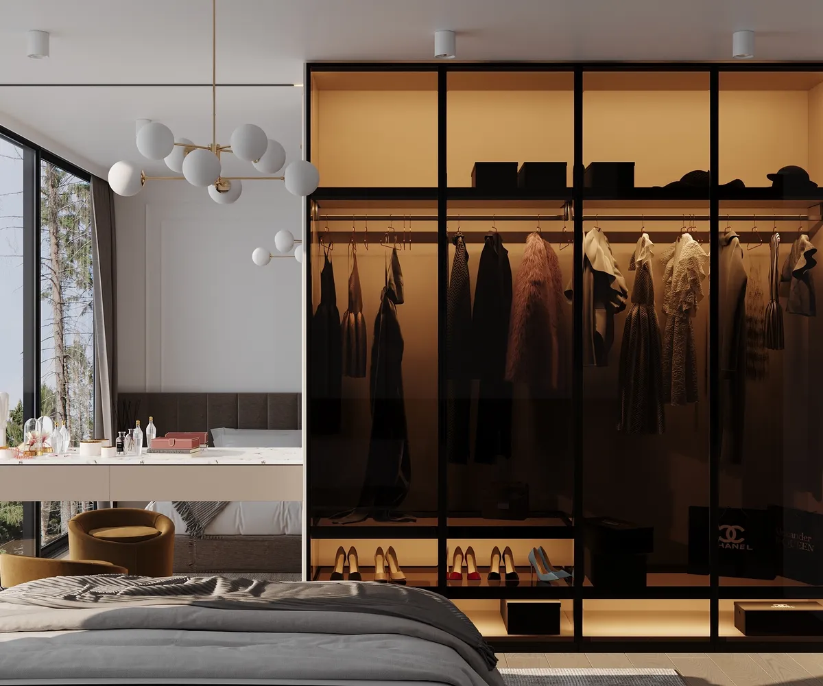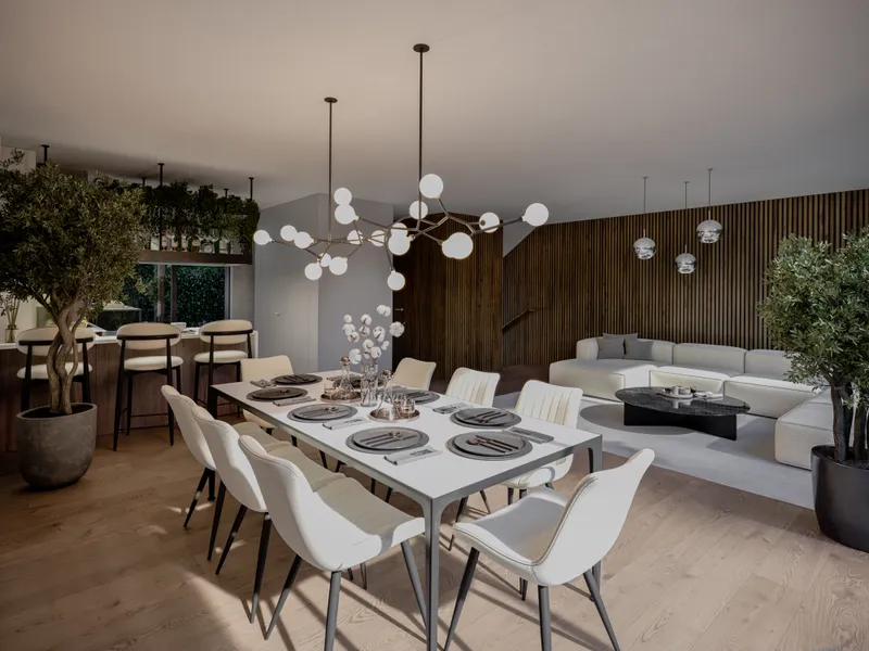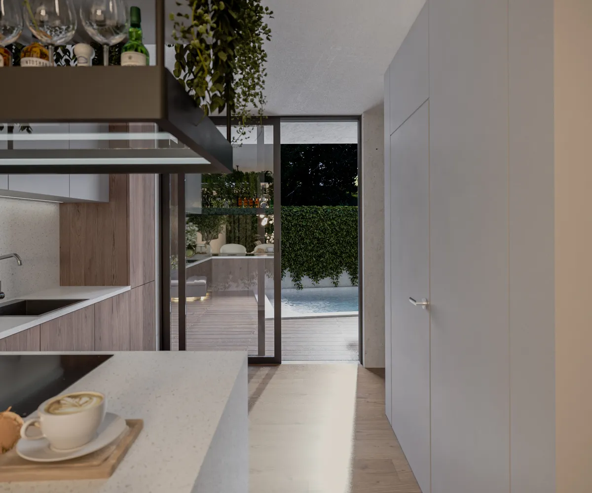 Die Wohnräume präsentieren sich lichtdurchflutet und großzügig – dank großflächiger, intelligent platzierter Fensterfronten, die nicht nur maximales Tageslicht ermöglichen, sondern zugleich ein hohes Maß an Privatsphäre bewahren.