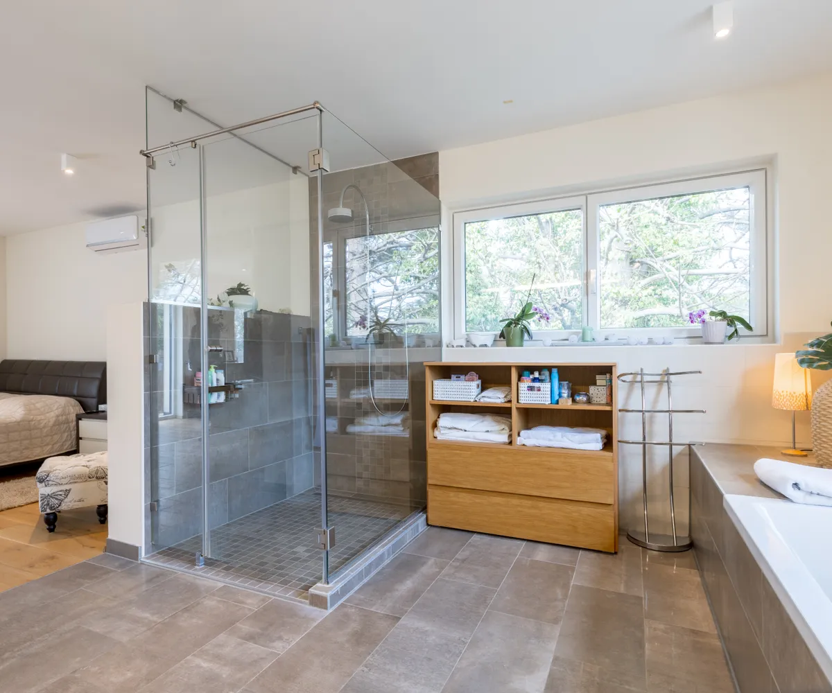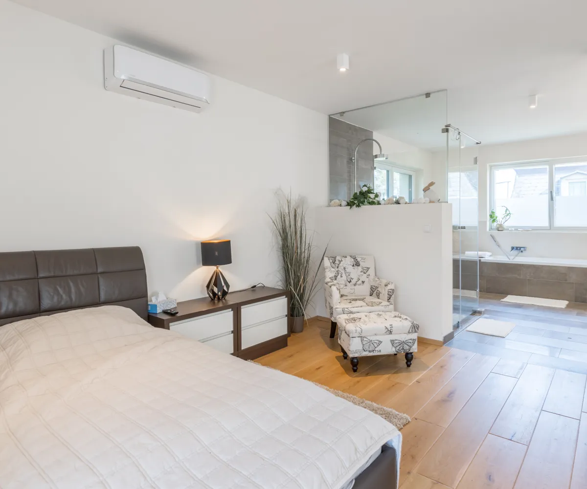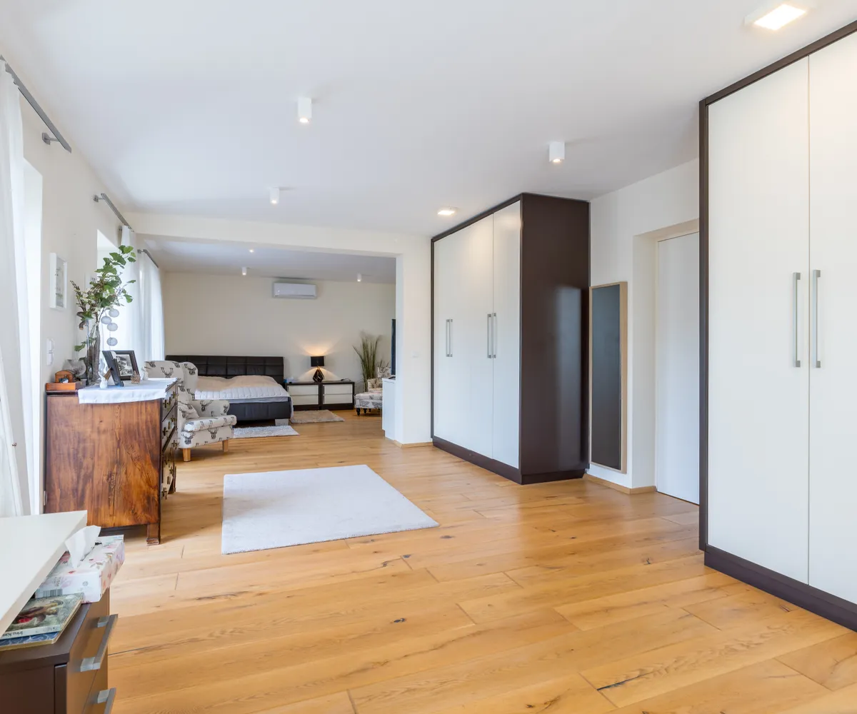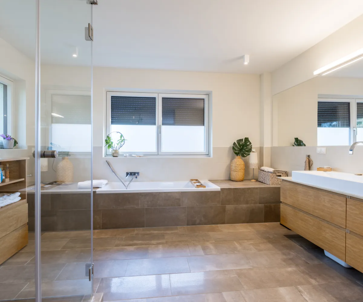 Sehr einladend ist auch die breite Holztreppe in das Obergeschoß. Im Obergeschoß angelangt, kommt man in den großzügig gestalteten Master-bedroom mit eigener Terrasse, Garderobeschränken, eigener Toilette und einer eigenen exklusiv ausgeführten Badezimmeroase, ausgestattet mit einer großen Dusche, einer Badewanne und einem Doppelwaschbecken. Auch im Master-bedroom spiegelt sich die Offenheit und Großzügigkeit wider. Große Glaselemente lassen auch diese Räume mit Tageslicht durchfluten und gestalten den Master-bedroom hell und freundlich.