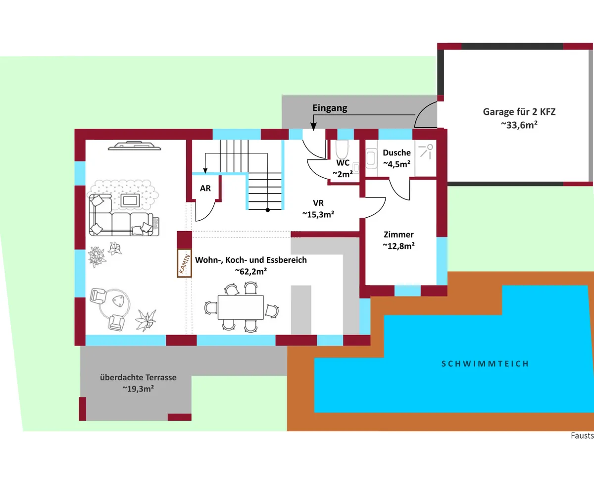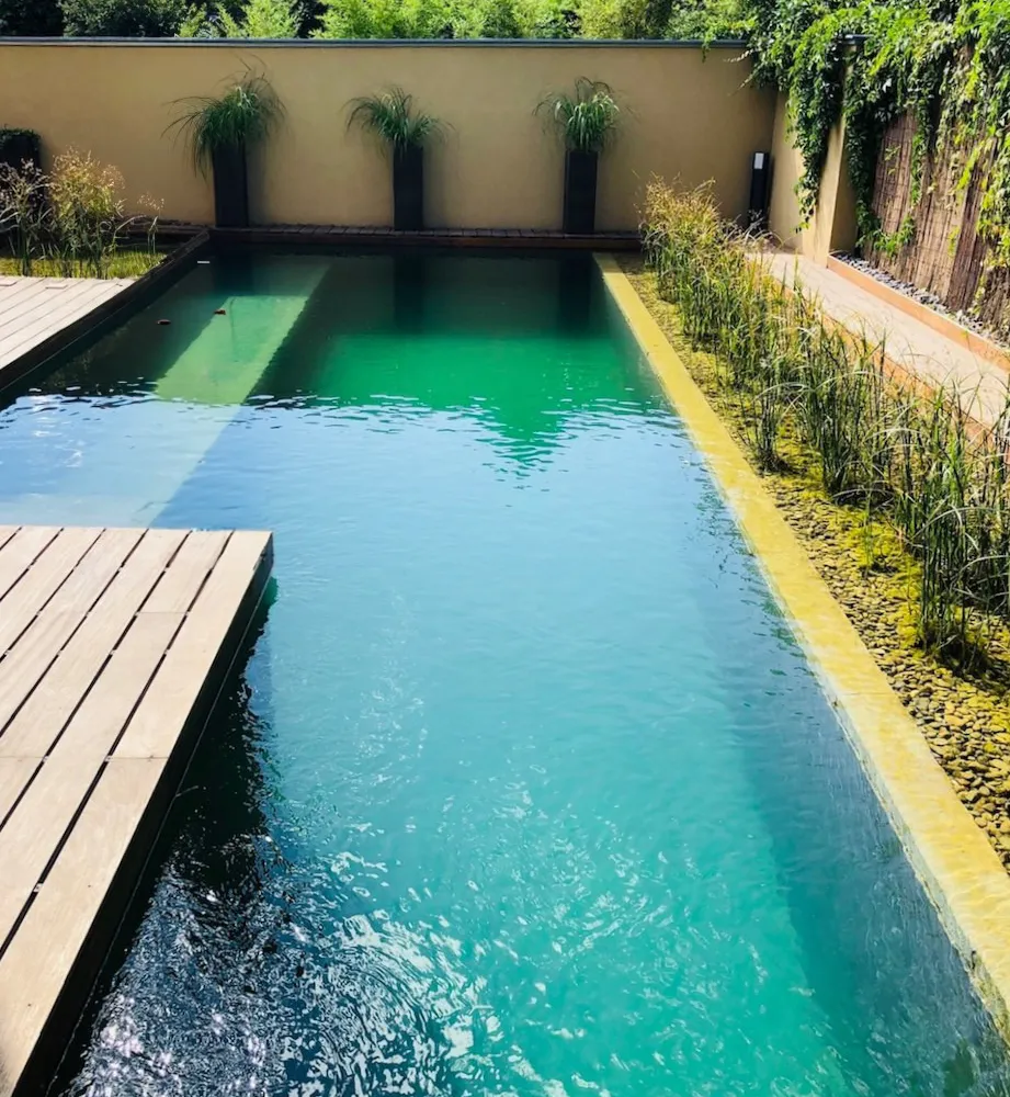 Ein weiteres Highlight ist sicherlich auch der wunderschön gestaltete Naturpoolbereich . Fast wie selbstverständlich, kann der Pool abends auch beleuchtet werden und erzeugt in Verbindung mit der Terrasse eine sehr harmonische Atmosphäre . Die hohe Mauer zur wenig befahrenen Einbahngasse schützt die Intimität. Im Gartenbereich ist eine automatische Bewässerungsanlage installiert.