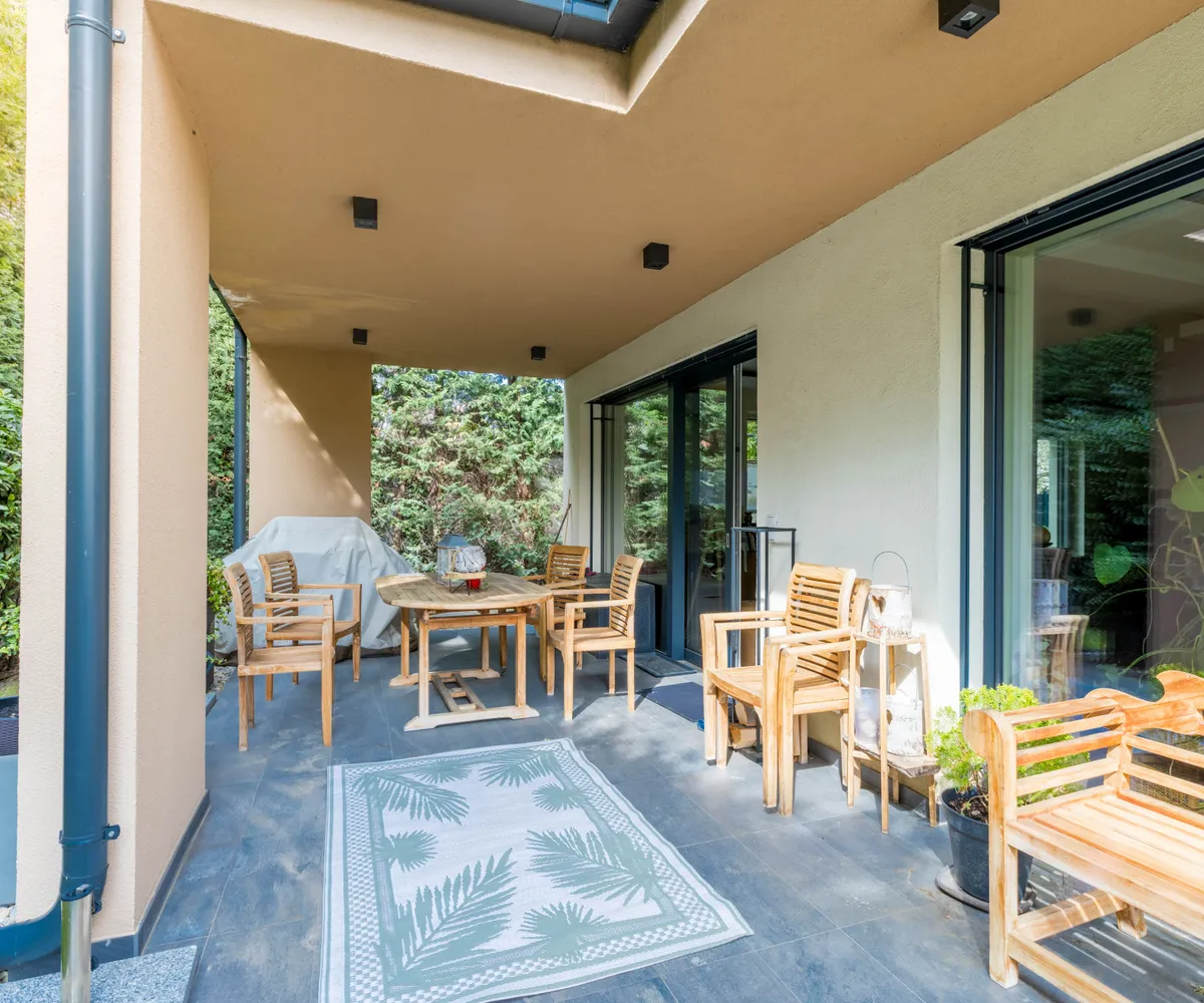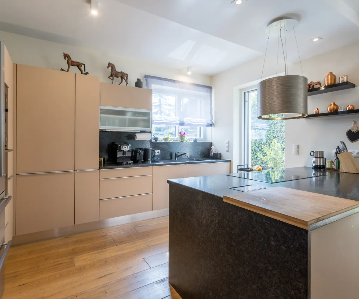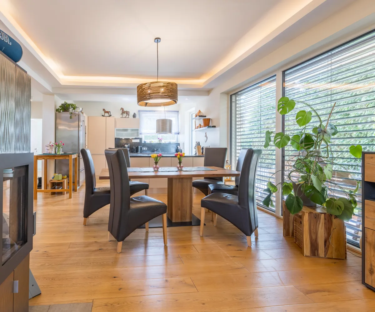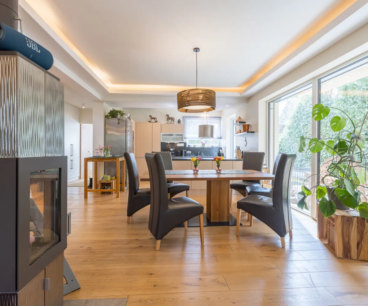 Wohlfühlambiente genießt man im großzügigen Wohnbereich mit offener Küche mit Kochinsel und Essplatz . Der zentrale Holzkaminofen ist nicht nur ein schöner und angenehmer Blickfang, zusätzlich liefert er an Übergangstagen und romantischen Abenden wohlige Wärme. Direkt vom Wohn-Essbereich gelangt man auf die wind- und wettergeschützte, teilüberdachte Terrasse.
