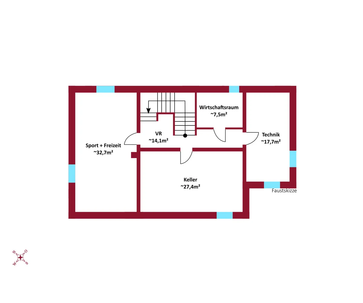 Große Kellerräume, insgesamt misst das Kellergeschoß ca. 100m², bieten Möglichkeiten für Stauraum und Lagerflächen bzw. auch für Fitness- und Hobbyräume. Lichteinfall und Lüftungsmöglichkeiten sind durch die Kellerschachtfenster gegeben.