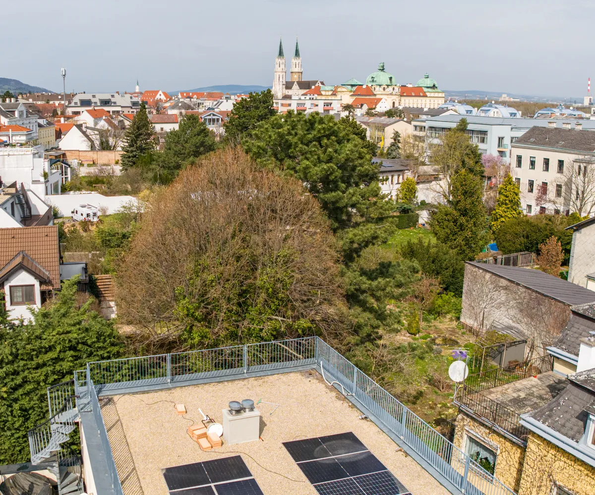 Über die Terrasse im Obergeschoß führt eine Wendeltreppe hinauf auf das Flachdach zur ca. 100m² großen Dachterrasse mit direktem Blick auf das Stift und Rundum-Fernblick. Die hier derzeit provisorisch angebrachten Solarpaneele können auch anders angeordnet werden, um in weiterer Folge die große Dachterrasse (ca. 100m² Gesamtfläche) mit dem fantastischem Stadt- und Fernblick vollständig nutzen zu können. Hier ist noch jede Menge Gestaltungsfreiraum vorhanden.