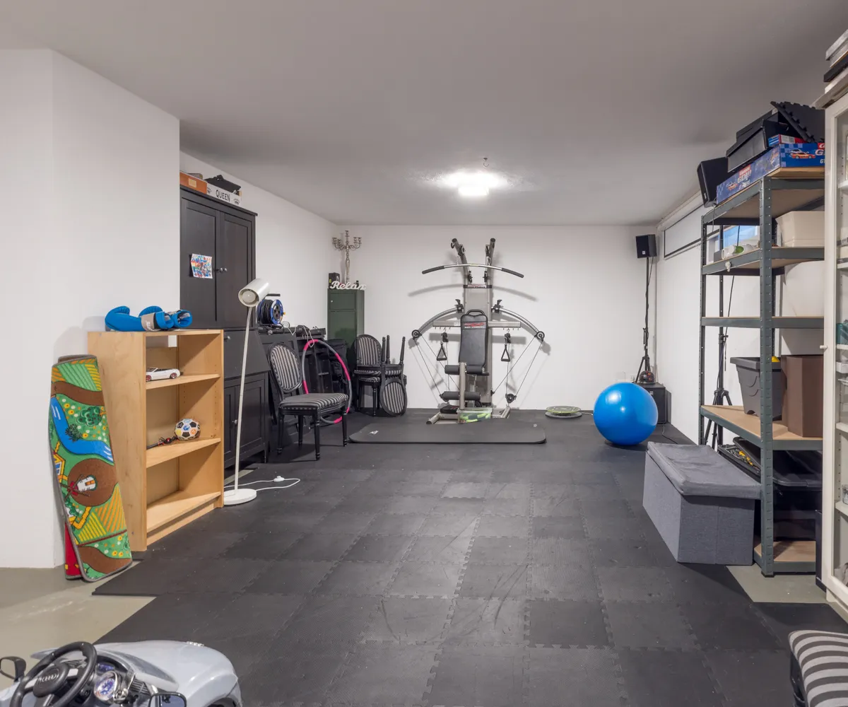 Die große Garage bietet Platz für zwei PKW's und zusätzlich auch für Fahrräder und Gartengeräte etc.