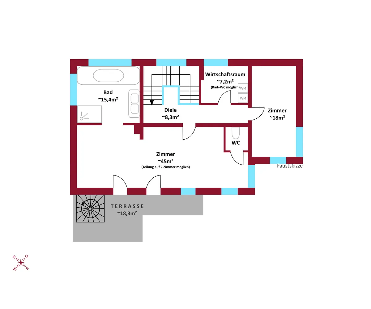 Im Obergeschoß befindet sich ein weiteres großes Zimmer mit ca. 18m², ebenso die Vorbereitung für ein weiteres Badezimmer mit Toilette.