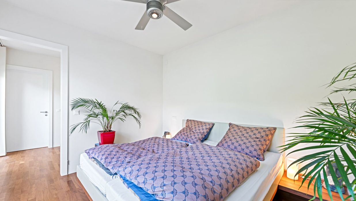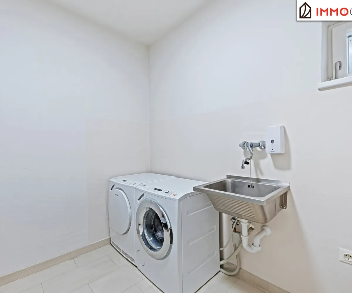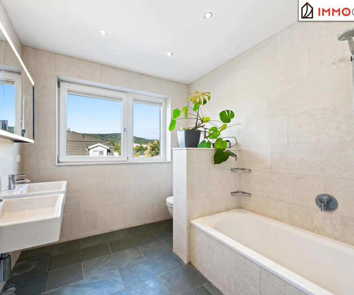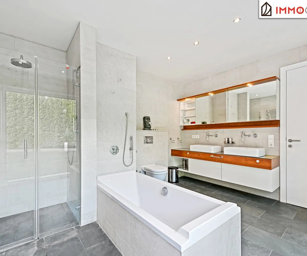 The middle floor is dedicated to private relaxation. A well-thought-out „parent‘s unit“ connects the bedroom, a walk-in closet, and a luxurious en-suite bathroom to form a harmonious whole without having to cross a corridor. From here, you have a short path to the heated saltwater pool – a jump into the cool water before breakfast becomes a daily ritual. A light-flooded study with direct terrace access offers the ideal retreat for concentrated work from home. Two further spacious rooms with a separate, equally high-quality bathroom form the perfect area for children or guests. A practical utility room with space for a washing machine and dryer rounds off this floor and saves you from carrying laundry over several floors. All sanitary rooms shine with fittings from Dornbracht and an exquisite choice of materials of dark natural slate and ceiling-high Danube limestone.