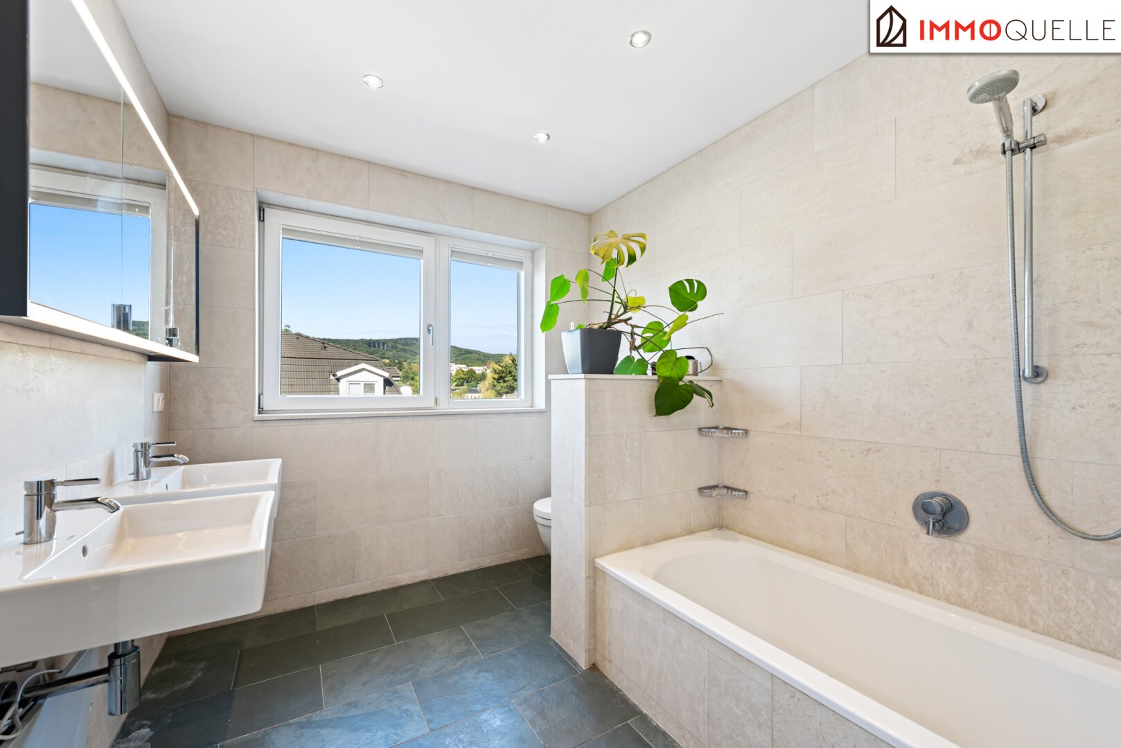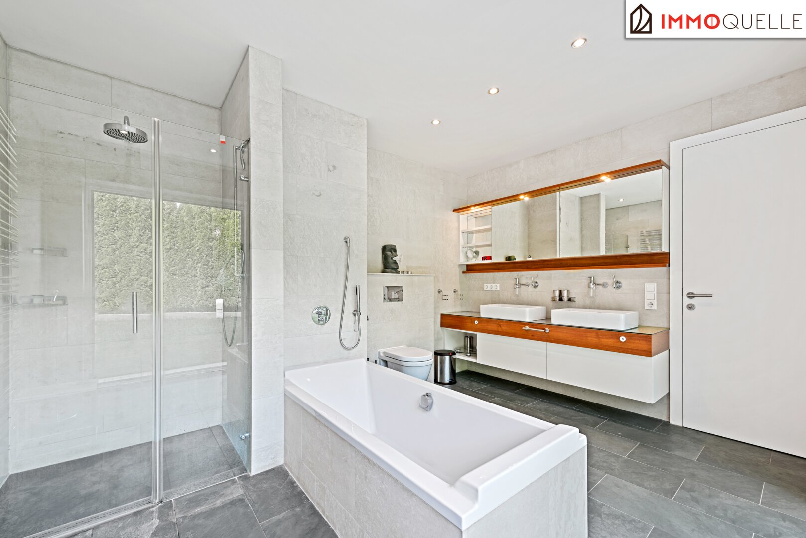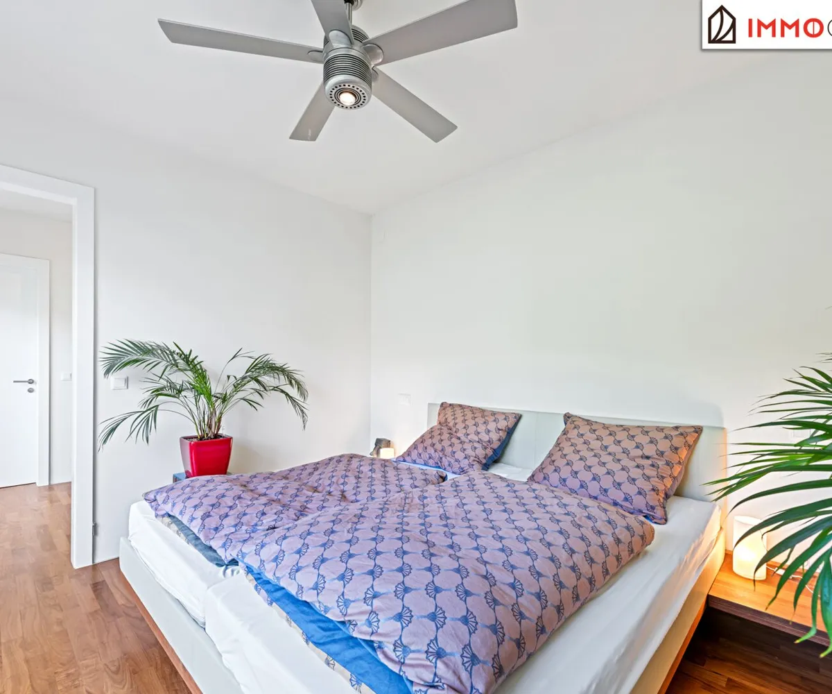 The middle floor is dedicated to private relaxation. A well-thought-out „parent‘s unit“ connects the bedroom, a walk-in closet, and a luxurious en-suite bathroom to form a harmonious whole without having to cross a corridor. From here, you have a short path to the heated saltwater pool – a jump into the cool water before breakfast becomes a daily ritual. A light-flooded study with direct terrace access offers the ideal retreat for concentrated work from home. Two further spacious rooms with a separate, equally high-quality bathroom form the perfect area for children or guests. A practical utility room with space for a washing machine and dryer rounds off this floor and saves you from carrying laundry over several floors. All sanitary rooms shine with fittings from Dornbracht and an exquisite choice of materials of dark natural slate and ceiling-high Danube limestone.