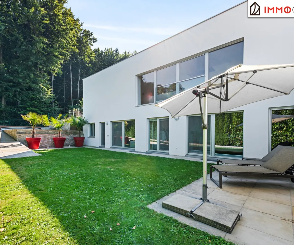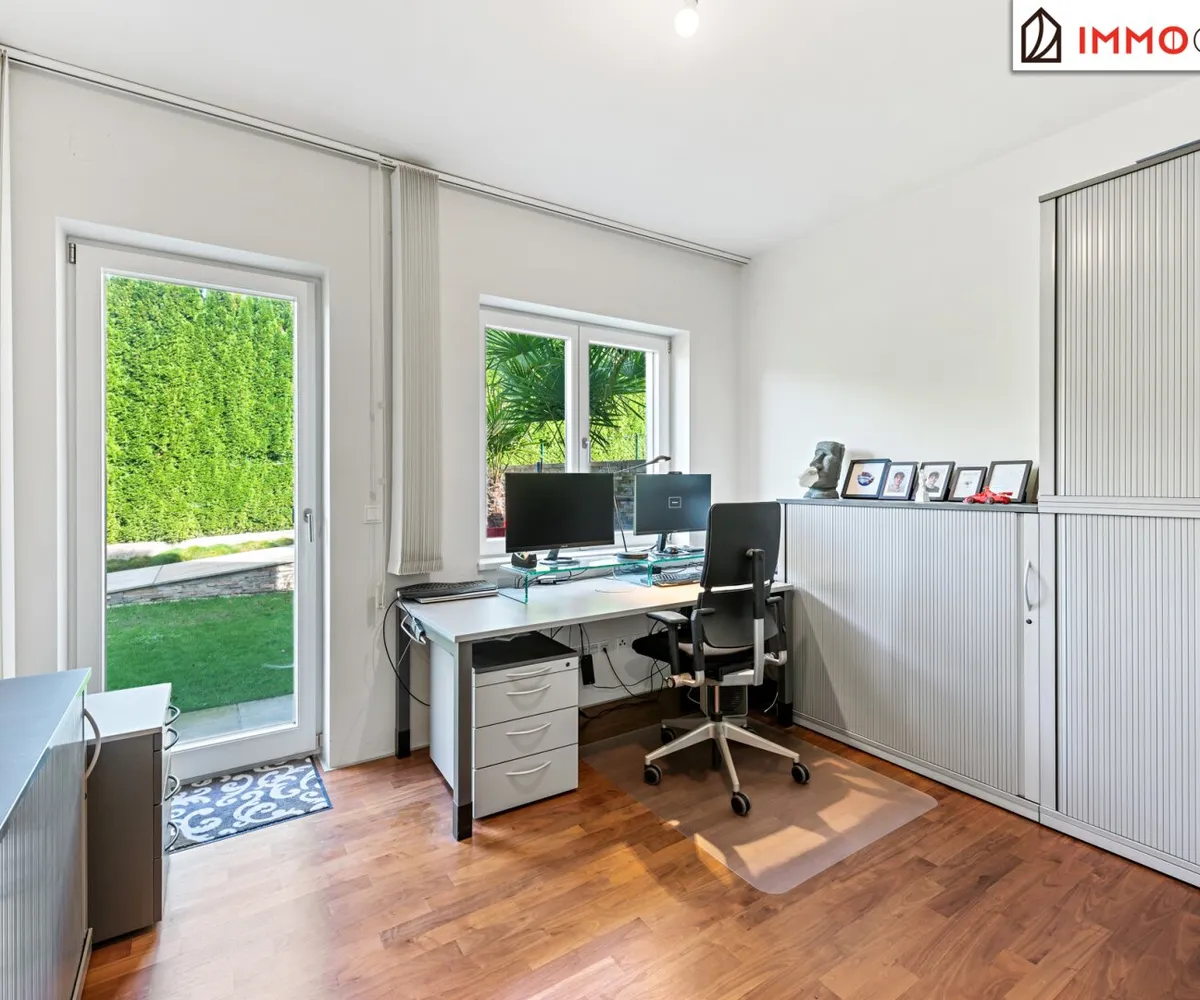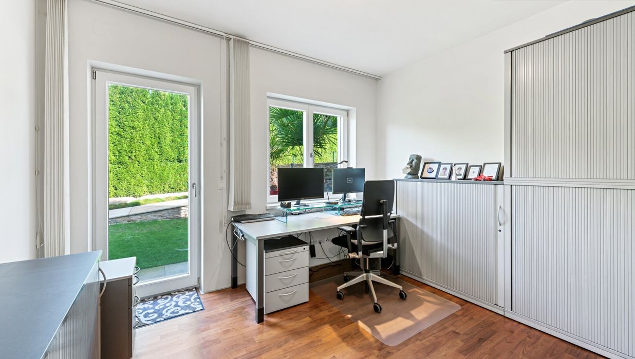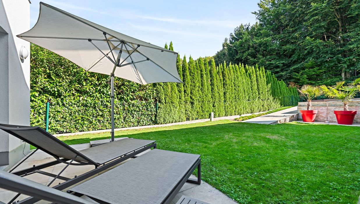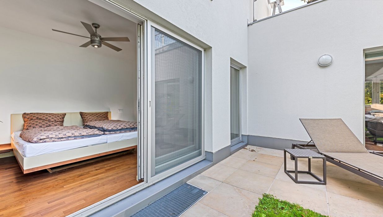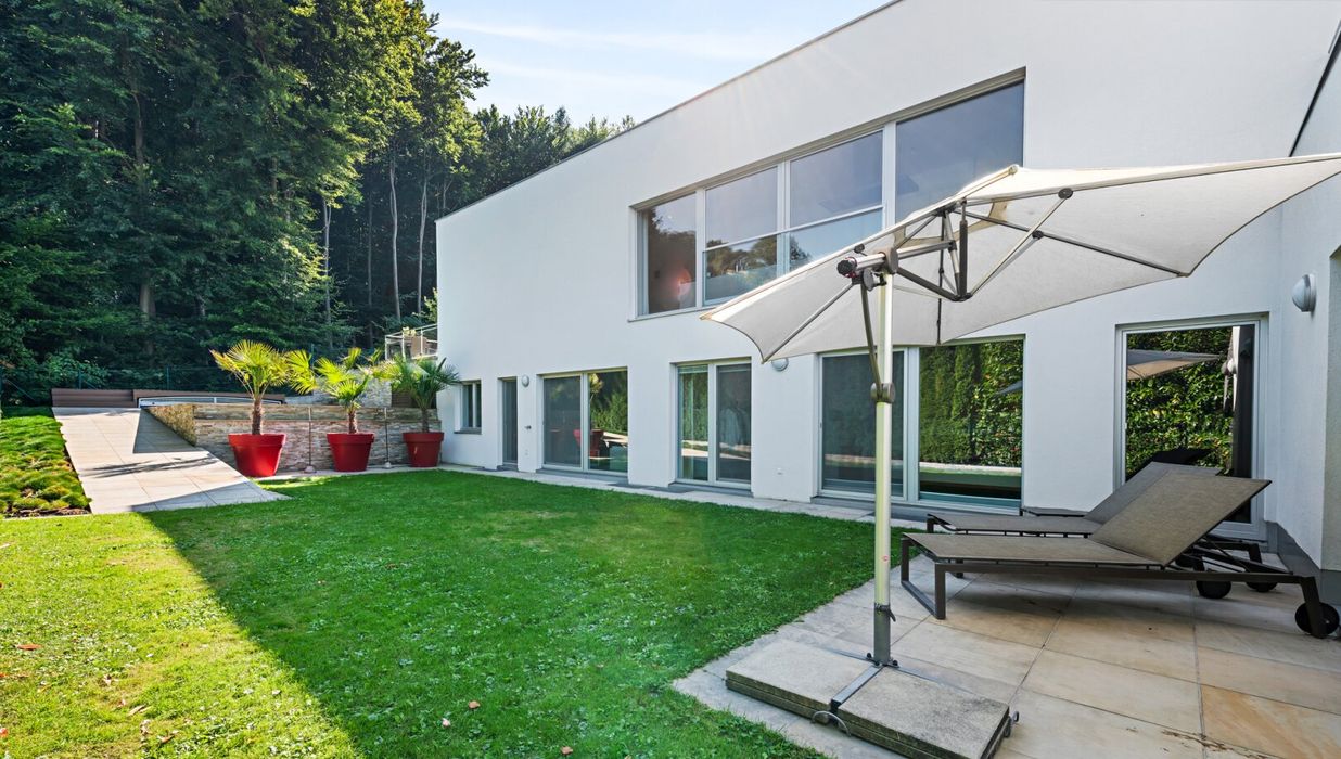 The property borders directly on the forest and thus offers absolute privacy and a priceless recreational value. The garden was deliberately designed to be low-maintenance, with two robotic mowers and an automatic irrigation system. The highlight in the outdoor area is the 3x7 meter heated saltwater pool with a counter-current system, surrounded by an elegant sun terrace made of natural sandstone. Three large palm trees give the garden a Mediterranean flair, while various terraces around the house offer the perfect spot in the sun or shade at any time of day.