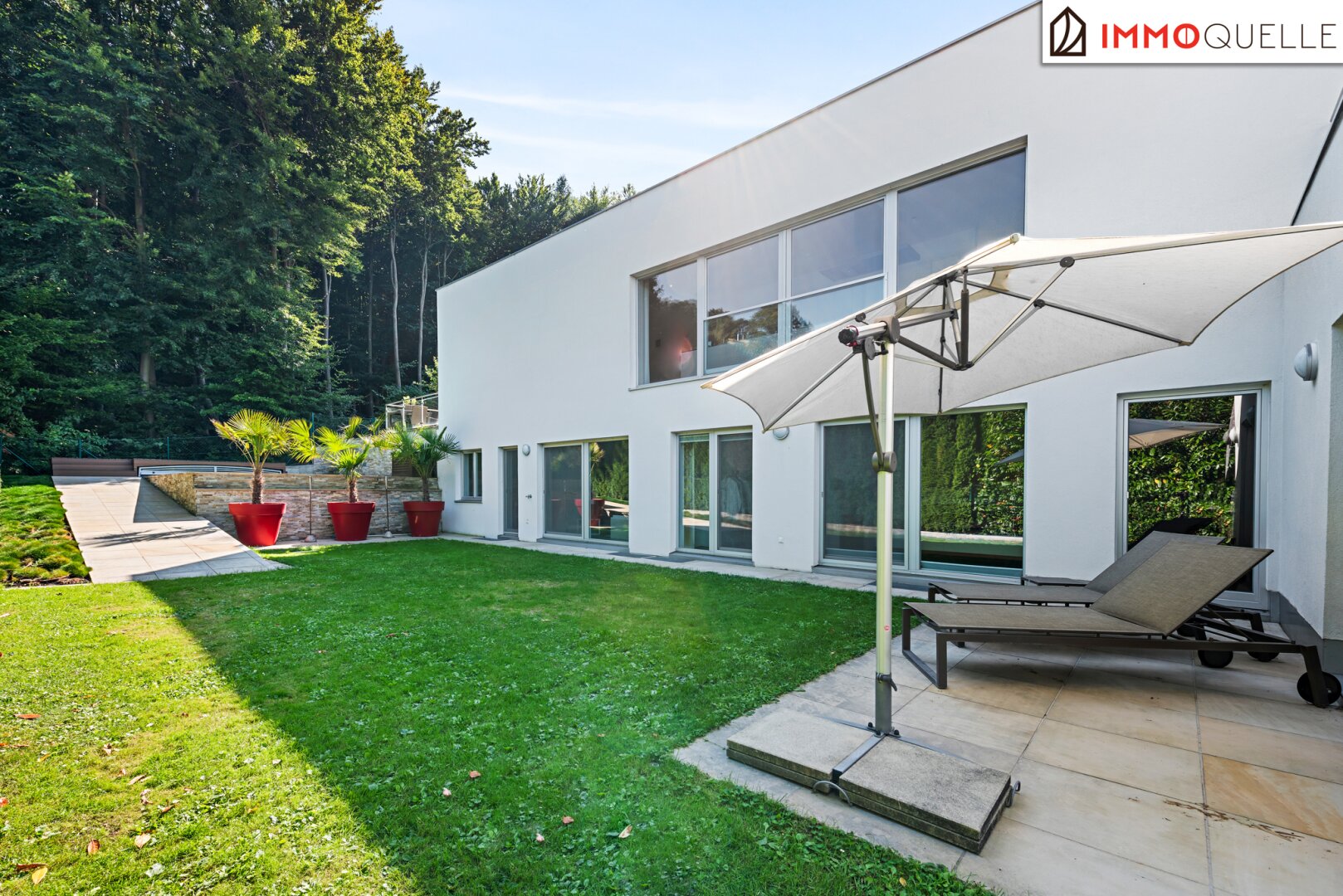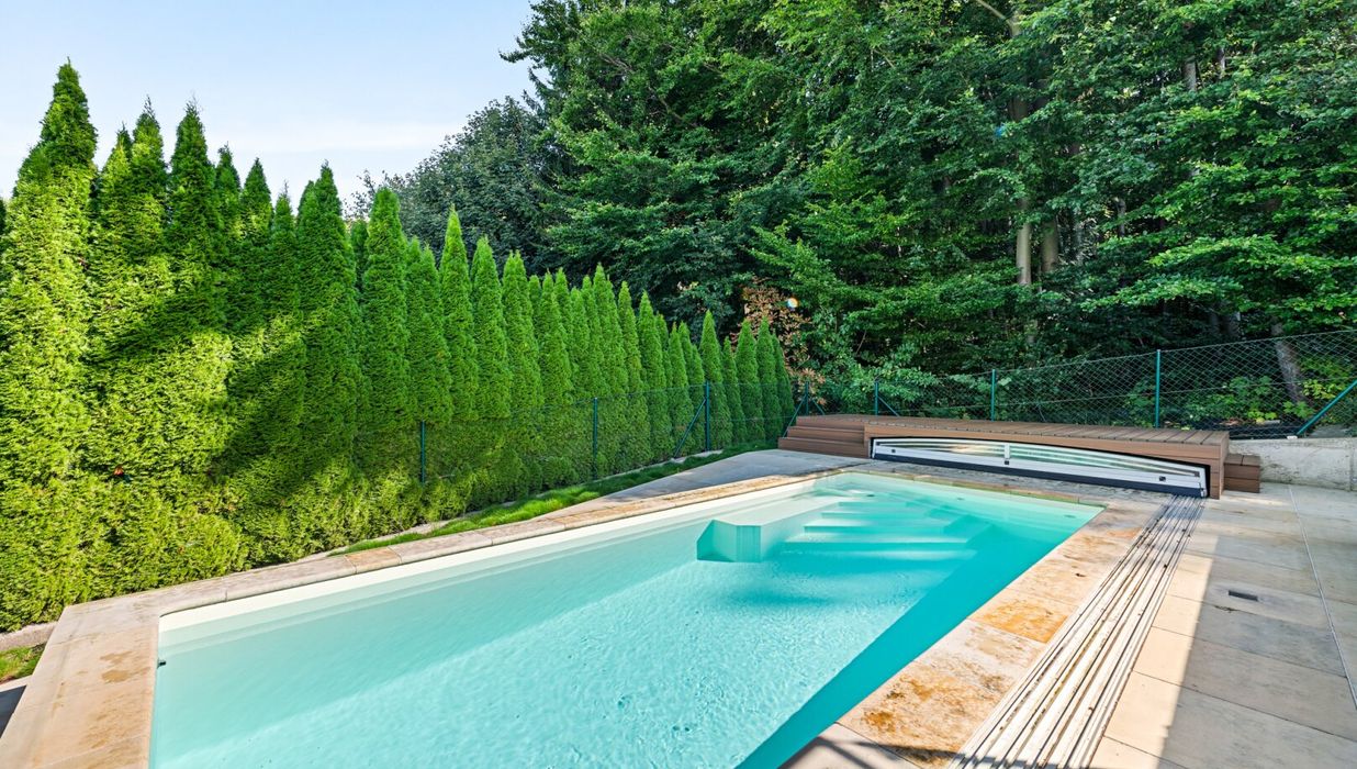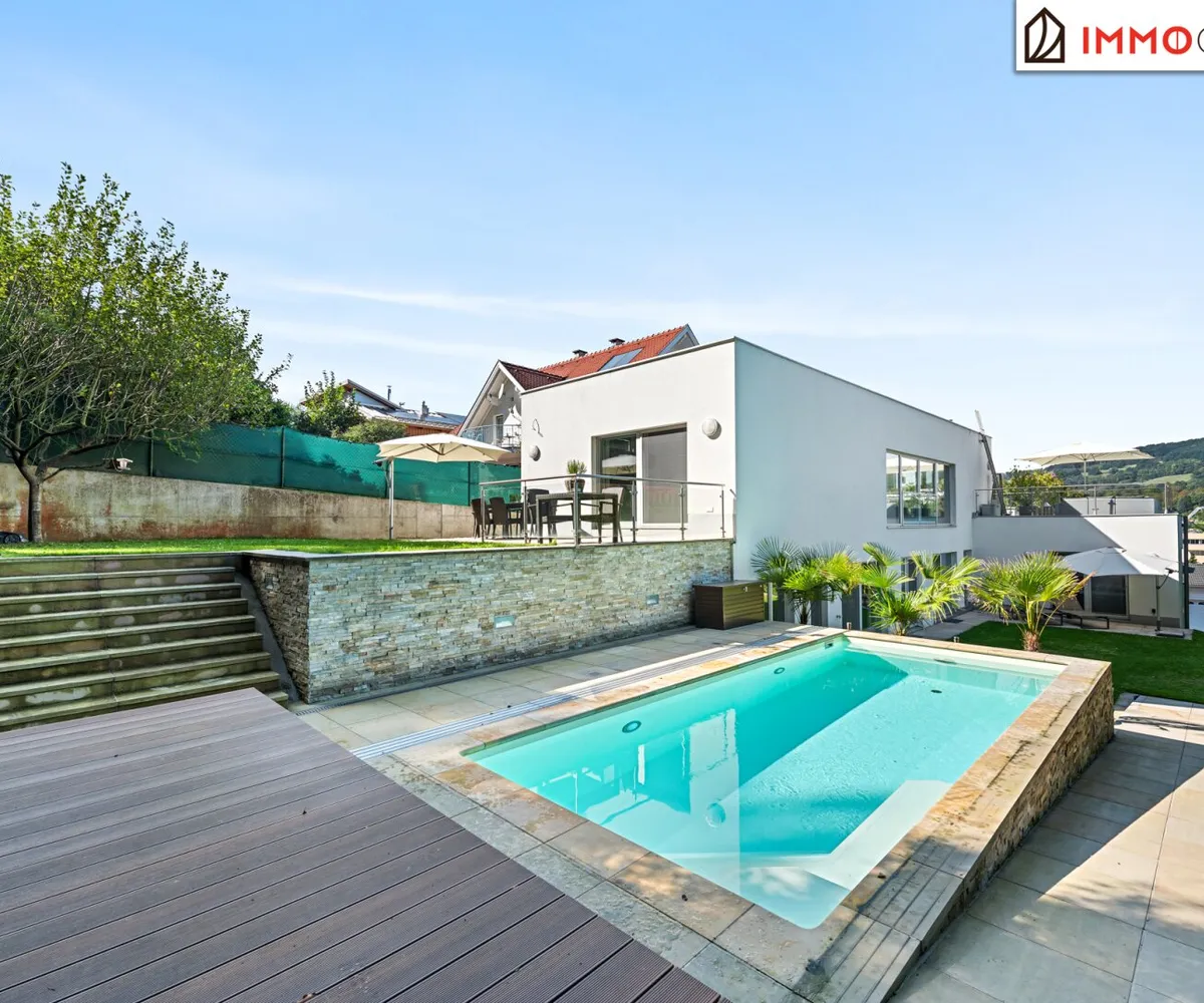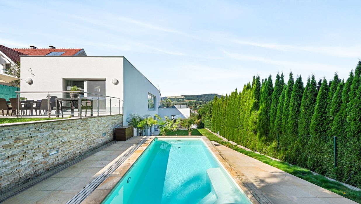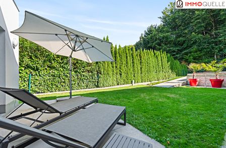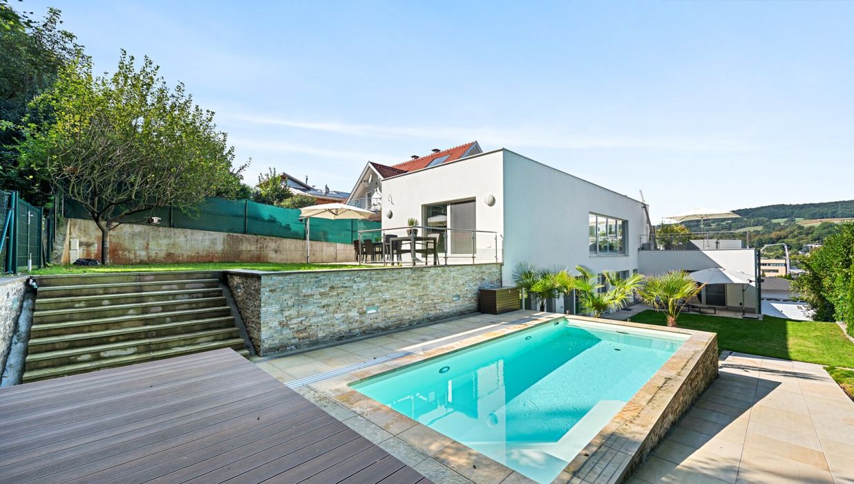Die Liegenschaft grenzt direkt an den Wald und bietet somit eine absolute Privatsphäre und einen unbezahlbaren Erholungswert. Der Garten wurde bewusst wartungsarm gestaltet, mit zwei Mährobotern und einer automatischen Bewässerungsanlage. Das Highlight im Außenbereich ist der 3x7 Meter große beheizte Salzwasser-Pool mit Gegenstromanlage, umgeben von einer eleganten Sonnenterrasse aus Natur-Sandstein. Drei große Palmen verleihen dem Garten ein mediterranes Flair, während diverse Terrassen rund um das Haus zu jeder Tageszeit den perfekten Platz an der Sonne oder im Schatten bieten.