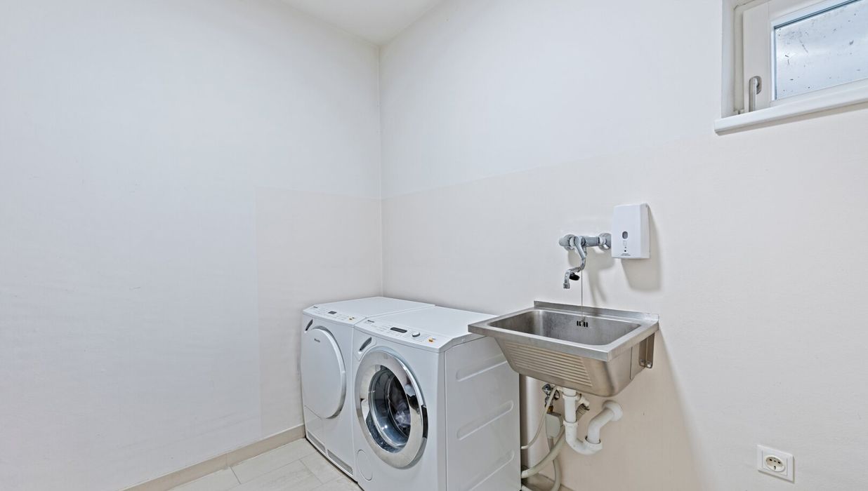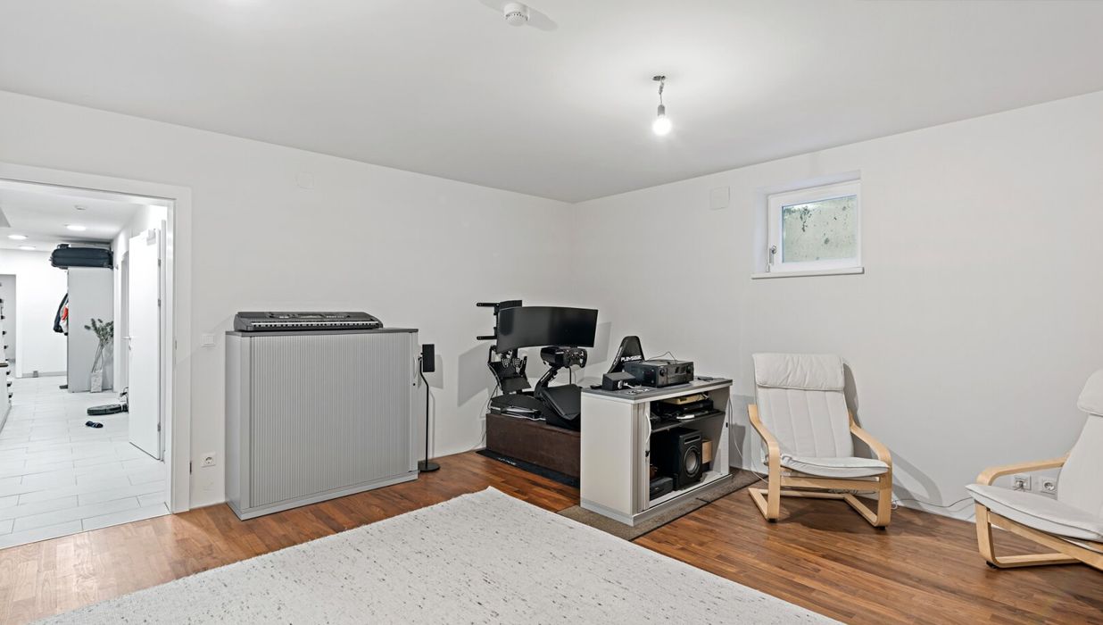 The basement surprises with a versatility that goes far beyond the usual. In addition to a heated workshop and a double garage with a high-voltage connection for electric vehicles, there is a fully equipped home cinema or music room and a fitness room. Both rooms are also fitted with walnut parquet flooring and underfloor heating and offer the possibility of being converted into a private sauna and wellness area with little effort.