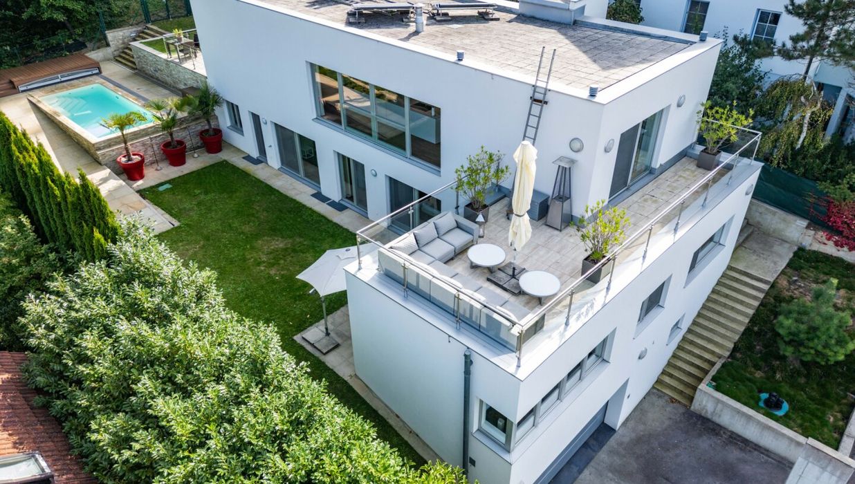 Your exclusive family home with heated saltwater pool, Bulthaup designer kitchen and unobstructed panoramic view on the edge of the Vienna Woods