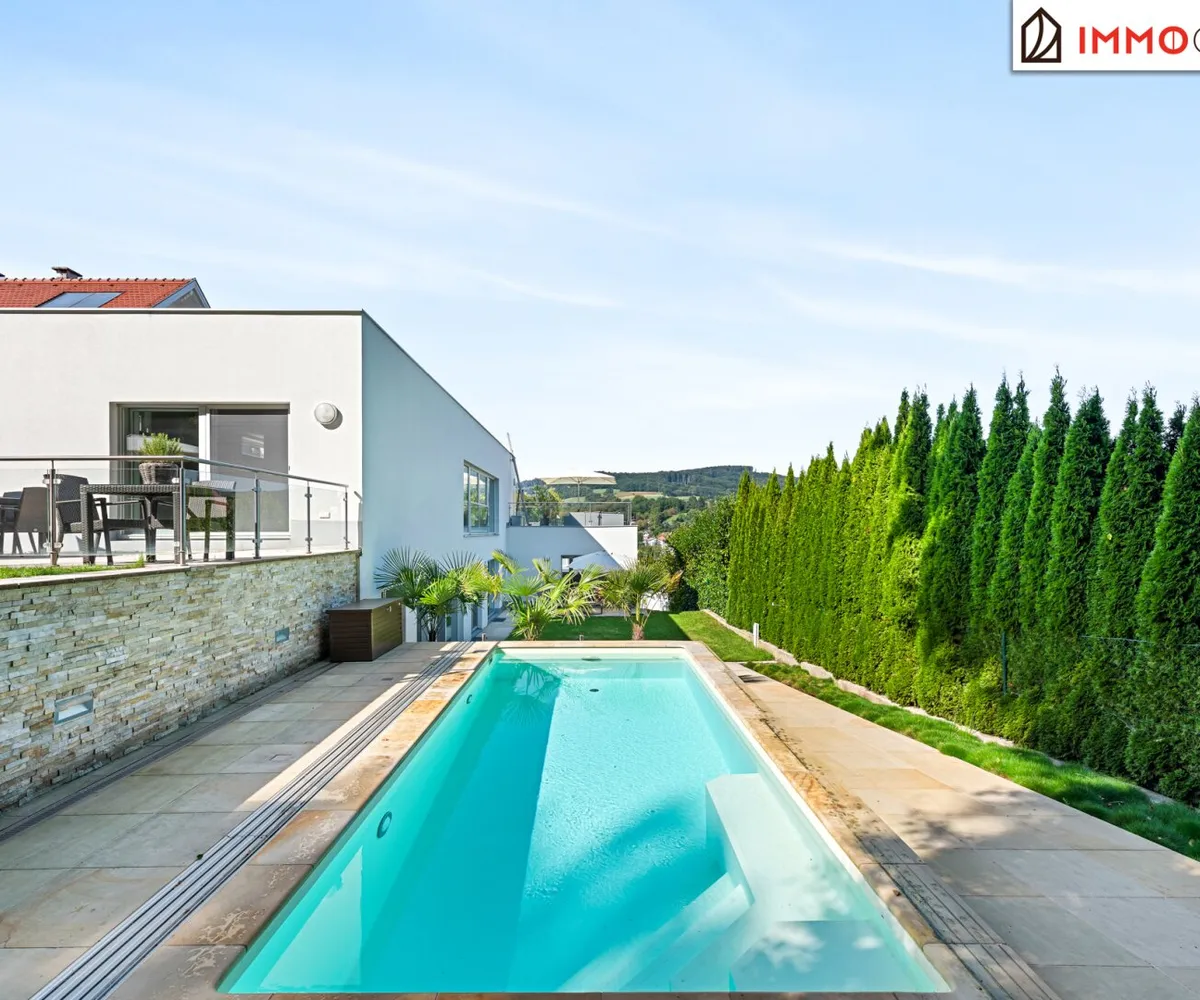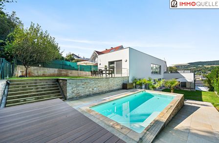Architektenvilla mit beheiztem Salzwasserpool, Bulthaup Designküche und unverbaubarem Fernblick am Rande des Wienerwaldes