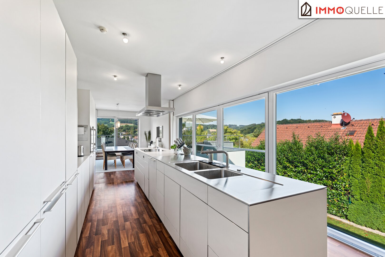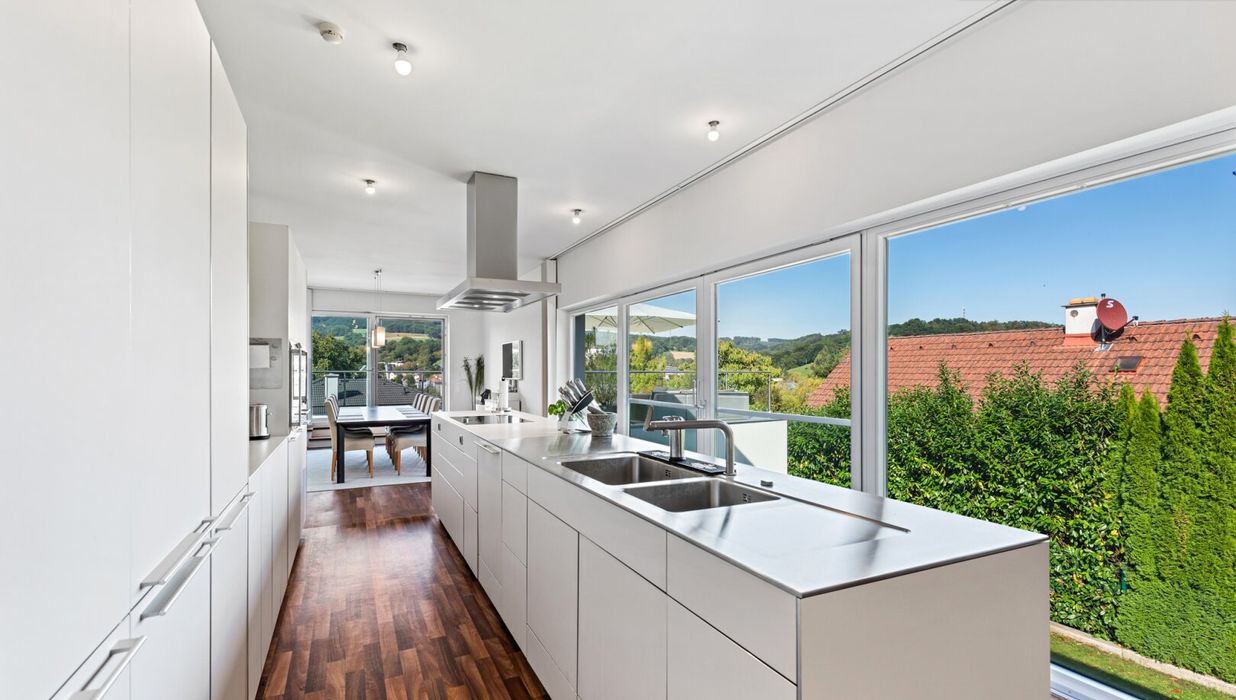 Die maßgeschneiderte, 5 Meter lange Bulthaup Designküche in elegantem Beige und Edelstahl ist der Traum eines jeden Gourmets. Ausgestattet mit hochwertigsten Geräten von Bulthaup, Siemens und Bosch und einem cleveren Design mit flüsterleisem Dunstabzug, macht das Kochen hier täglich Freude. Vom Essbereich, der Platz für eine große Tafel für bis zu 12 Personen bietet, gelangen Sie direkt auf die Kierlingtal-Terrasse. Genießen Sie hier Ihr Frühstück im Angesicht der drei Oleanderbüsche oder den romantischen Sonnenuntergang bei einem Glas Wein. Auf der gegenüberliegenden Seite führt eine zweite Terrasse waldseitig hinaus und eröffnet den direkten Zugang zum beheizten Salzwasser-Pool.