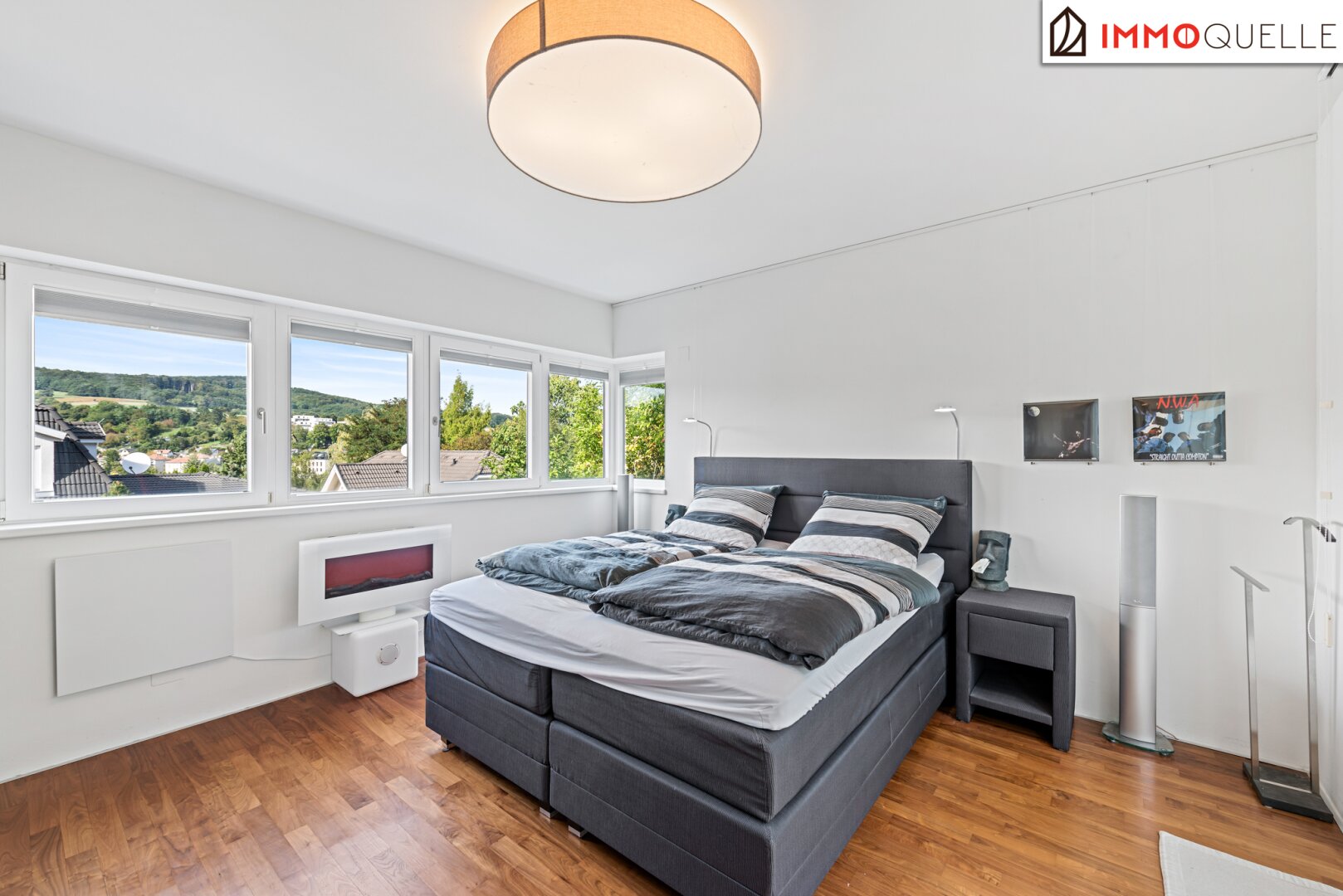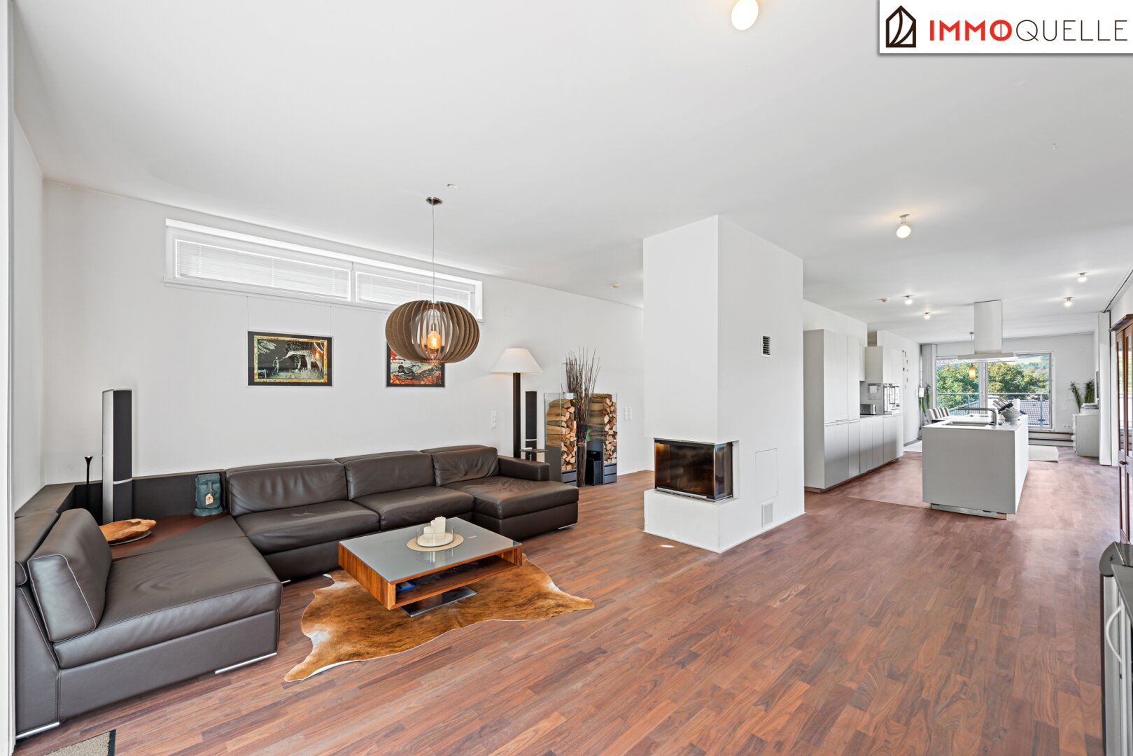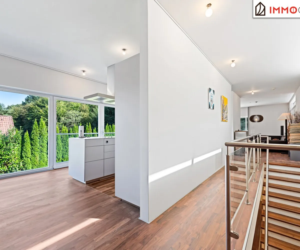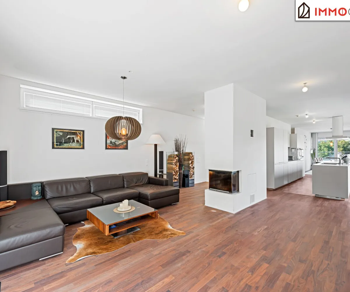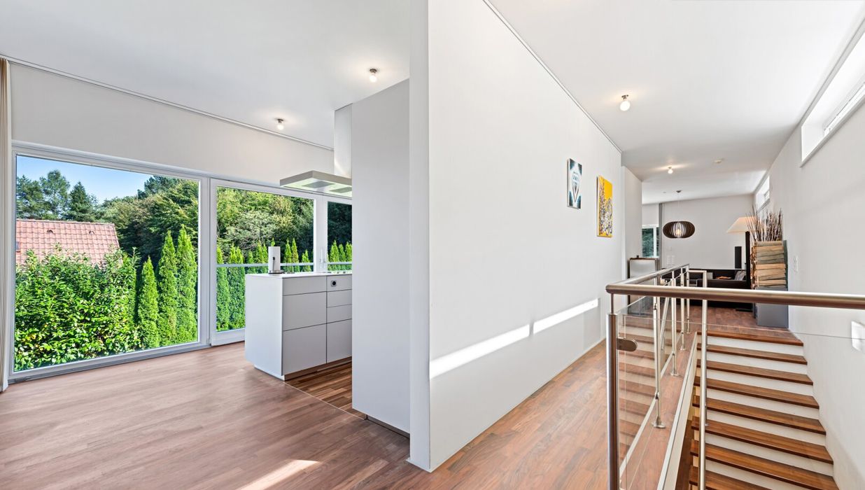 Der moderne und kubische Entwurf des Hauses besticht durch eine intelligente Raumaufteilung, die sowohl repräsentative Offenheit als auch private Rückzugsorte meisterhaft vereint. Das Herzstück bildet die oberste Etage mit einer beeindruckenden Raumhöhe von 2,90 Metern . Hier verschmelzen Wohnen, Essen und Kochen zu einem spektakulären, lichtdurchfluteten Raumkontinuum. Der edle, geölte a merikanische Nussbaum-Parkettboden , der sich durch die meisten Wohnräume zieht, und die durchgehende Fußbodenheizung schaffen eine warme, einladende Atmosphäre. An kühleren Abenden spendet der offene Spartherm-Kamin mit seiner großen Glaskeramikscheibe behagliche Wärme und wird zum zentralen Treffpunkt für die ganze Familie.