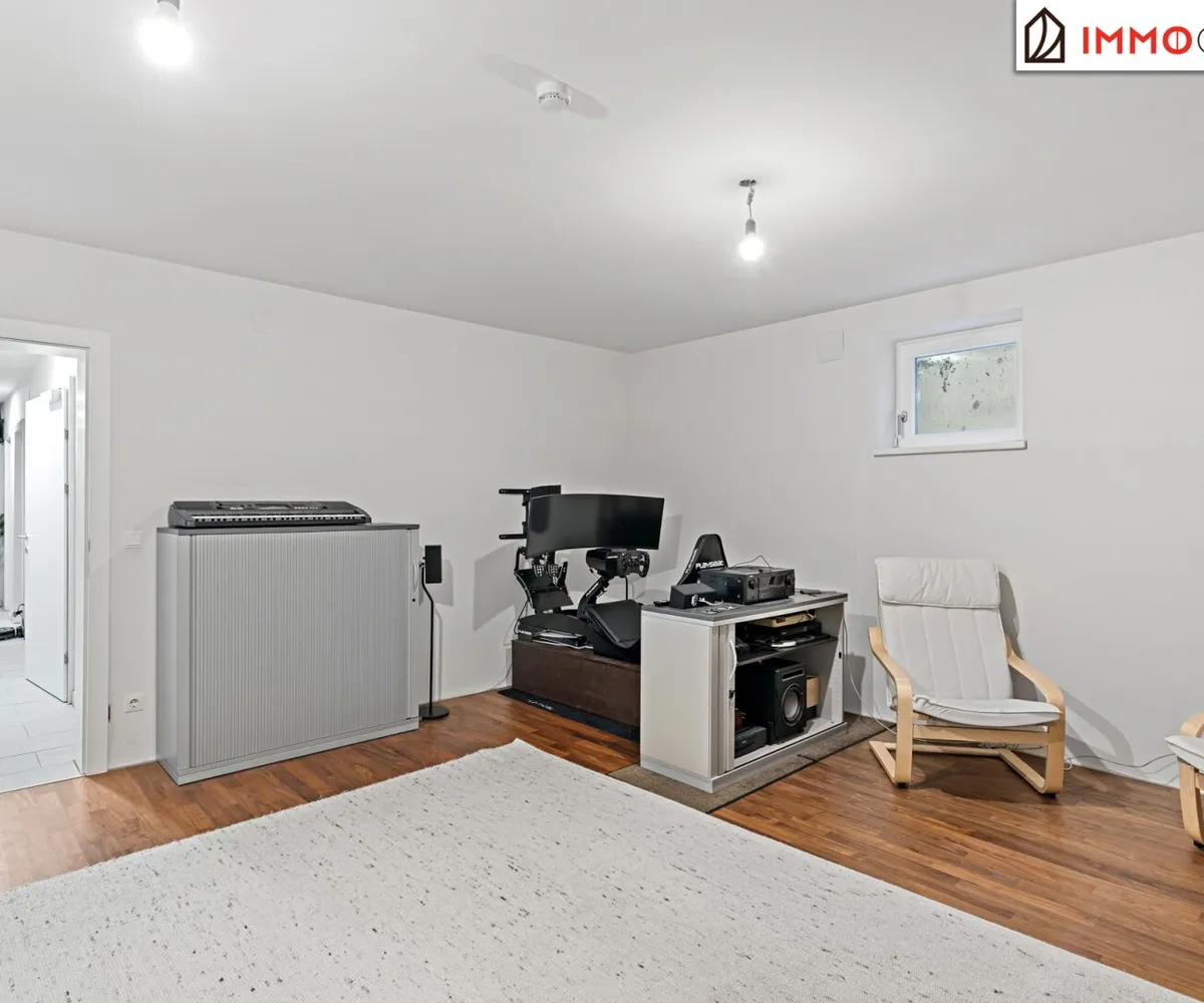 Das Untergeschoss überrascht mit einer Vielseitigkeit, die weit über das Übliche hinausgeht. Neben einer beheizten Werkstatt und einer Doppelgarage mit Kraftstromanschluss für E-Fahrzeuge finden sich hier ein voll ausgestattetes Heimkino bzw. Musikzimmer sowie ein Fitnessraum . Beide Räume sind ebenfalls mit Nussbaum-Parkett und Fußbodenheizung versehen und bieten die Möglichkeit, sie mit geringem Aufwand in eine private Sauna- und Wellnesslandschaft zu verwandeln.
