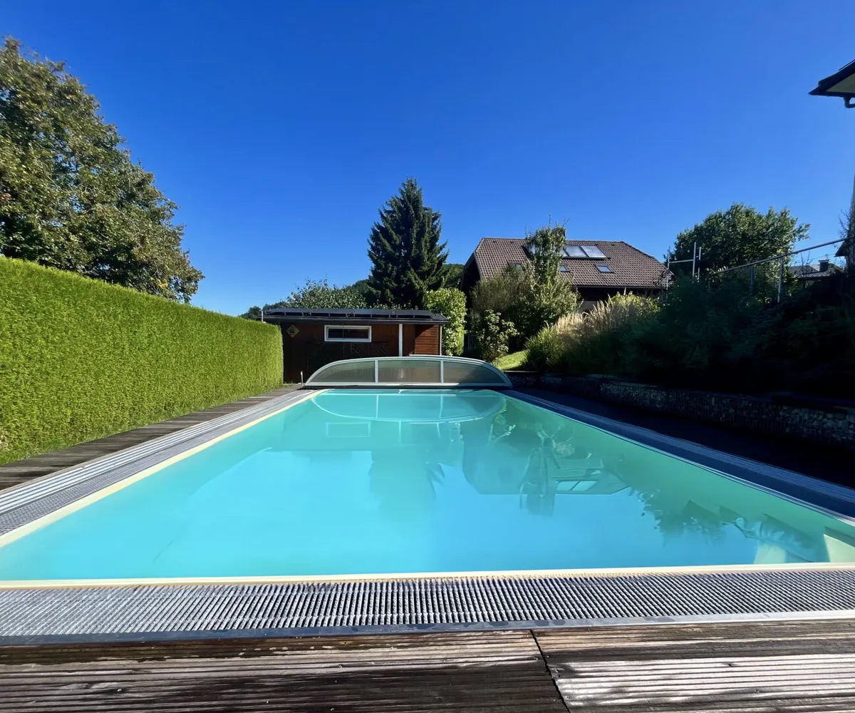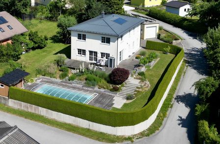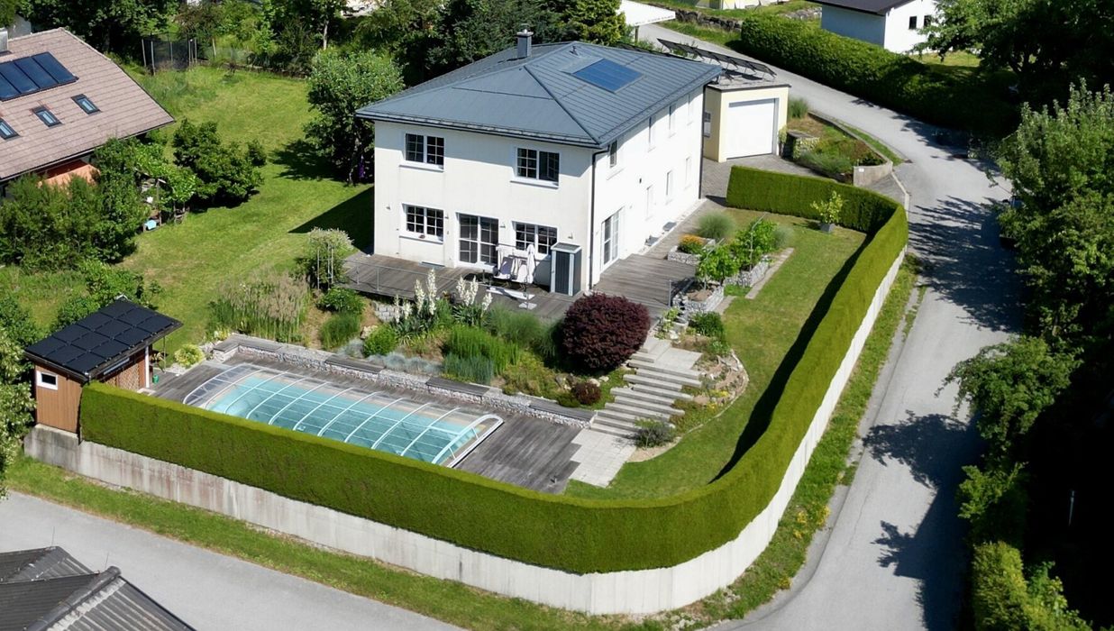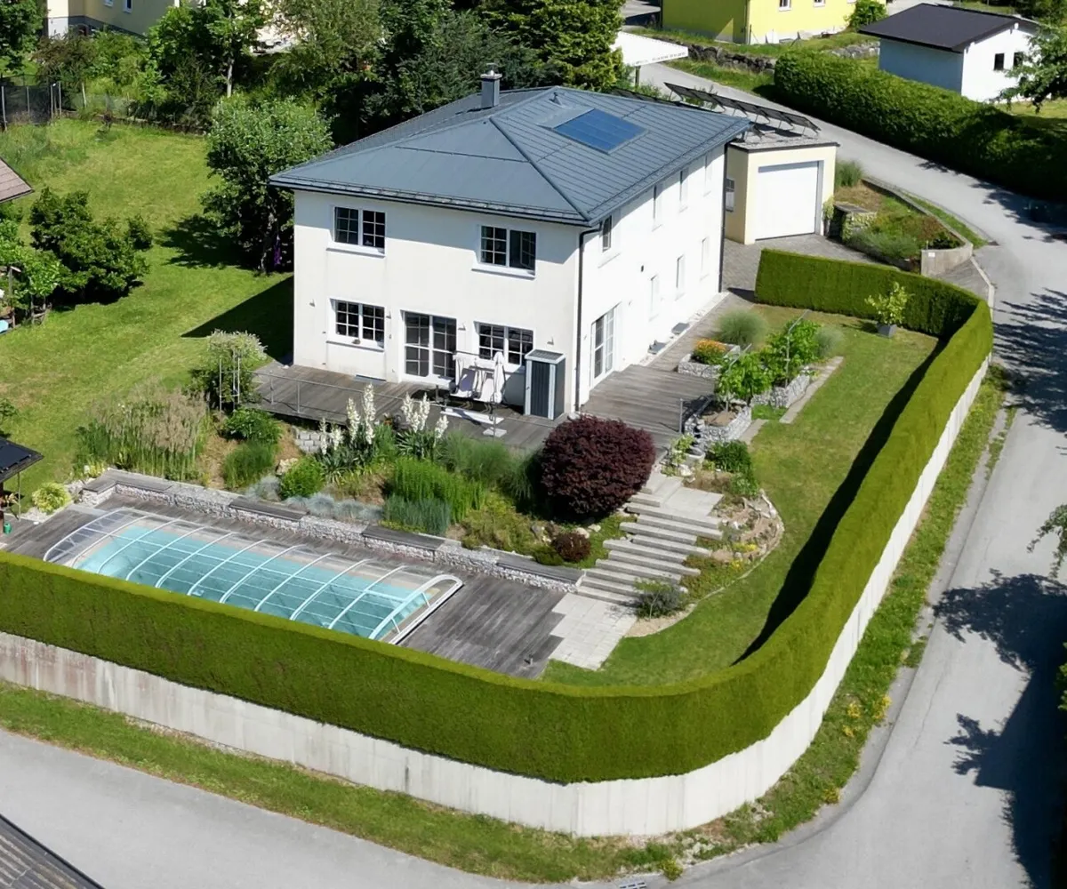 Abgerundet wird das 1.062 m² große Grundstück durch einen gepflegten Garten mit viel Platz zum Entspannen und Genießen. Ein eleganter Pool mit Überdachung verspricht sommerliche Erfischung und kann für kältere Tage durch eine eigene Solaranlage beheizt werden.