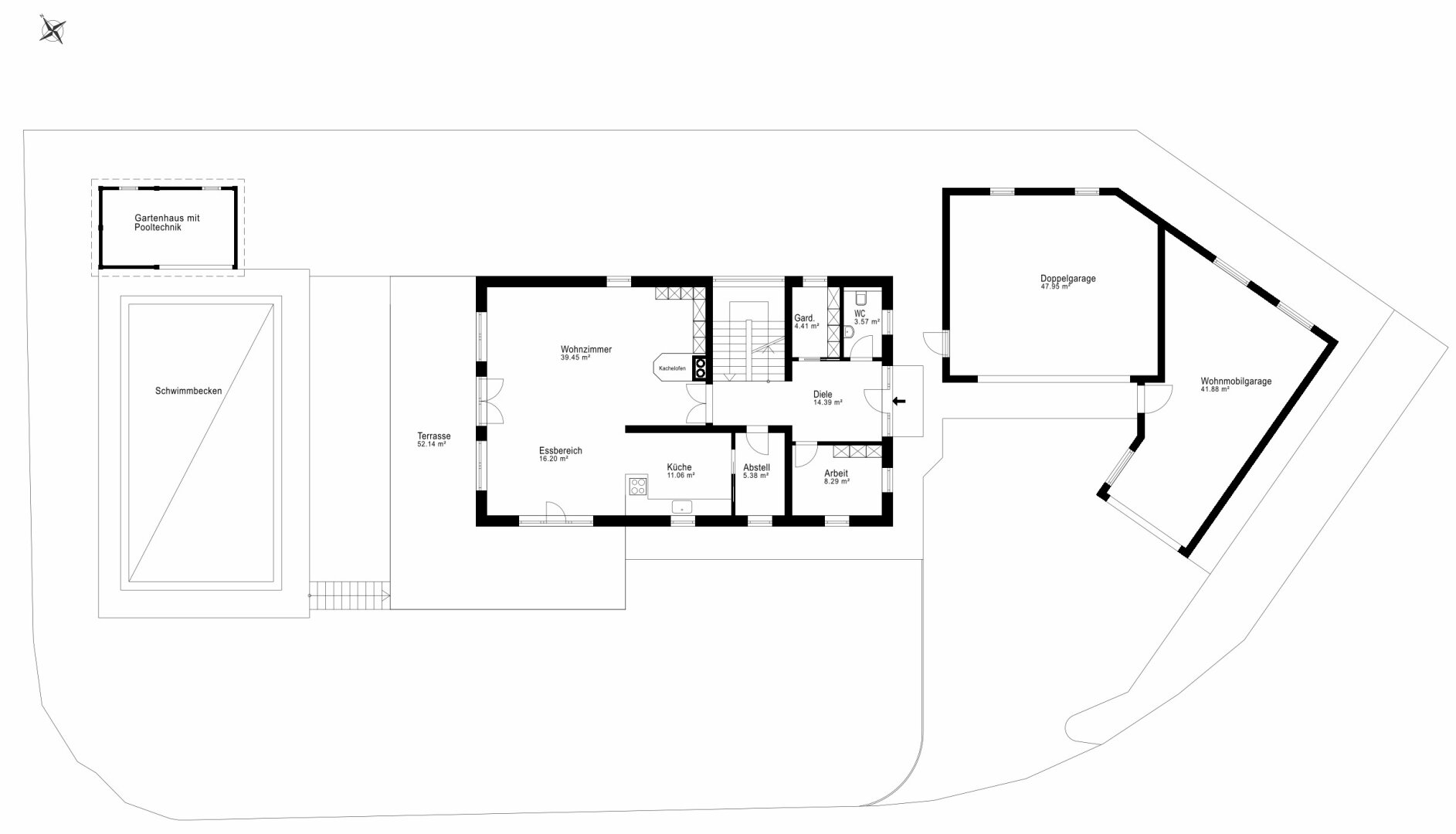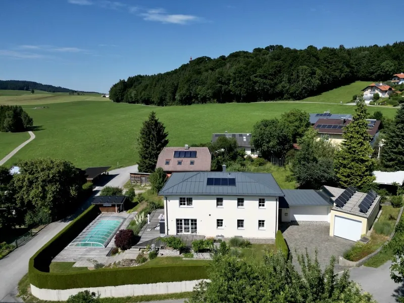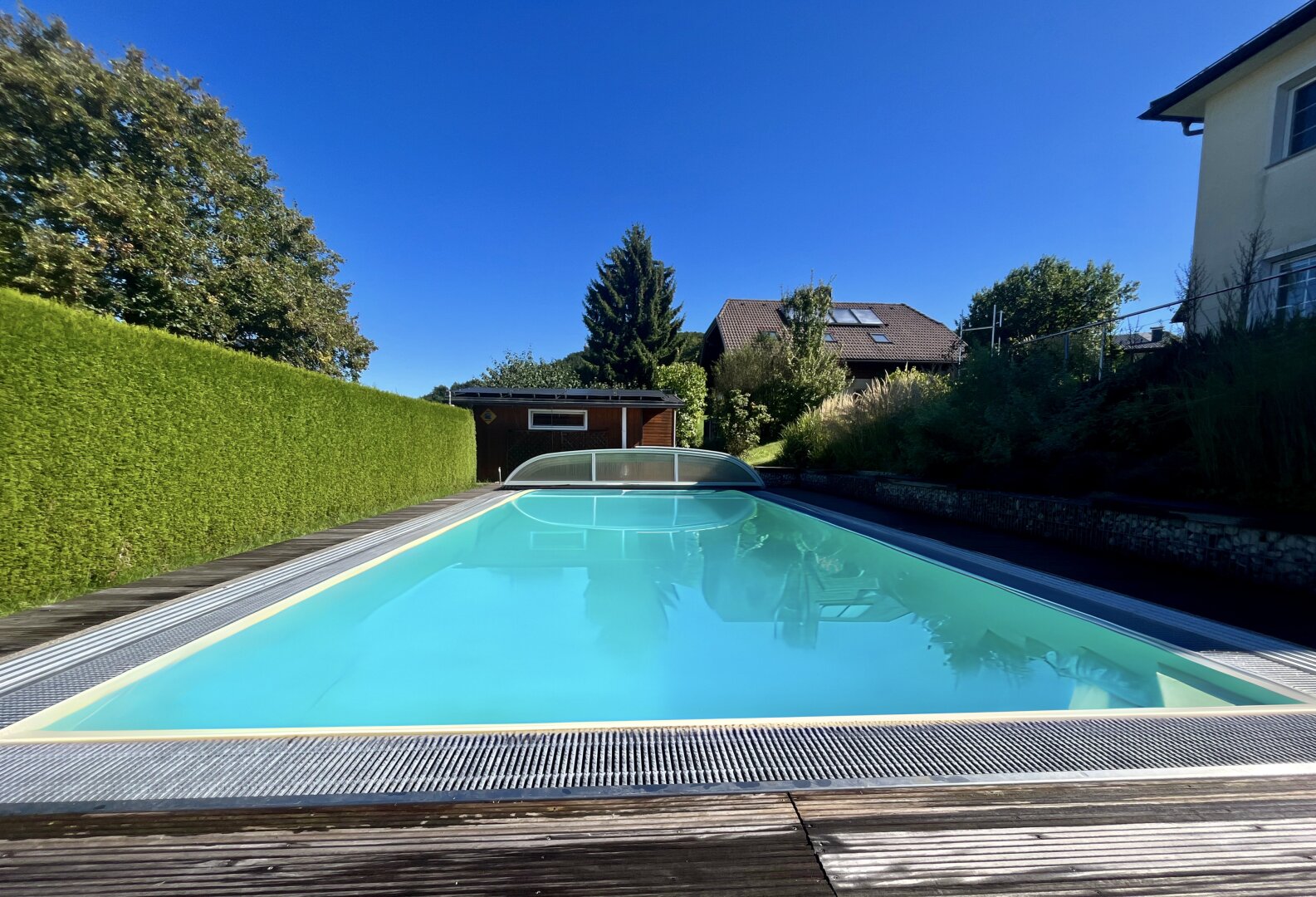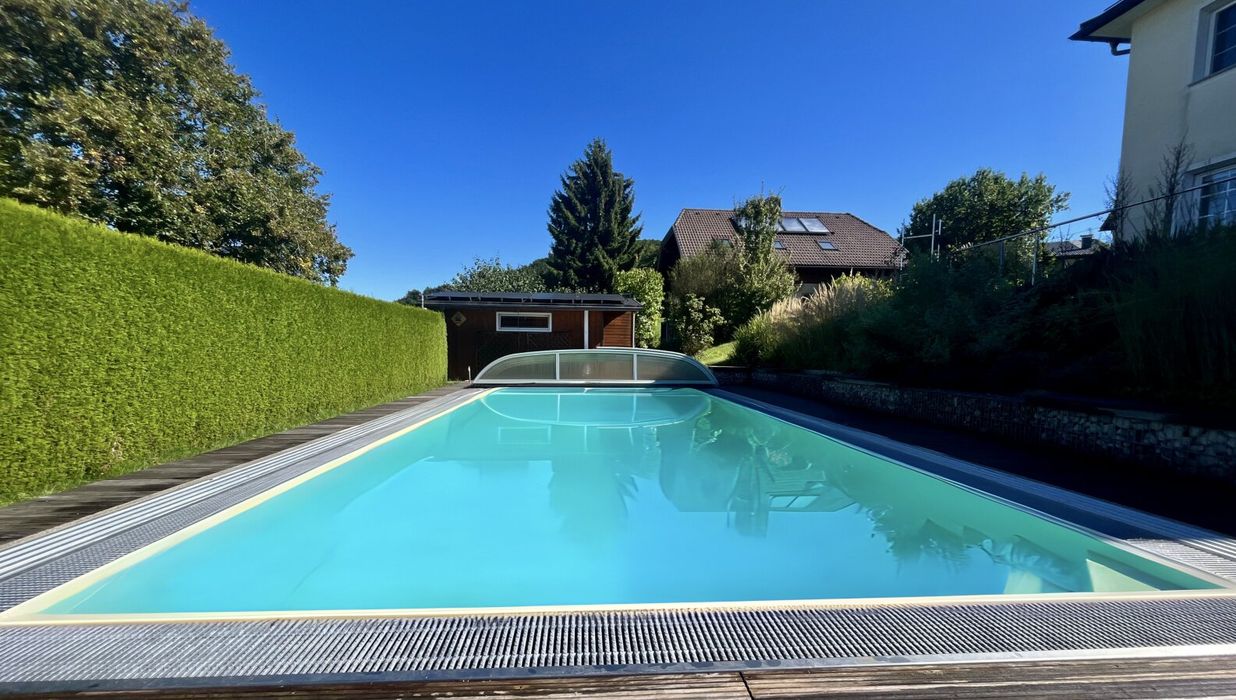 Abgerundet wird das 1.062 m² große Grundstück durch einen gepflegten Garten mit viel Platz zum Entspannen und Genießen. Ein eleganter Pool mit Überdachung verspricht sommerliche Erfischung und kann für kältere Tage durch eine eigene Solaranlage beheizt werden.