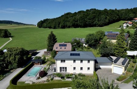 Eine moderne Photovoltaikanlage mit Speicher und eine Solaranlage für Warmwasser sorgen zusätzlich für eine nachhaltige und kostenschonende Versorgung.