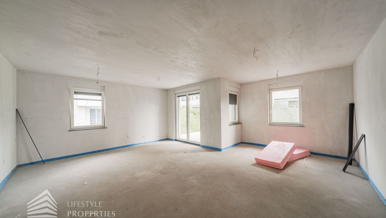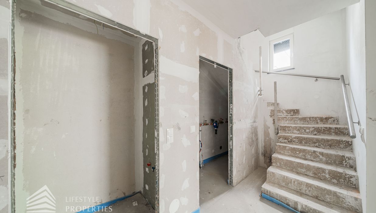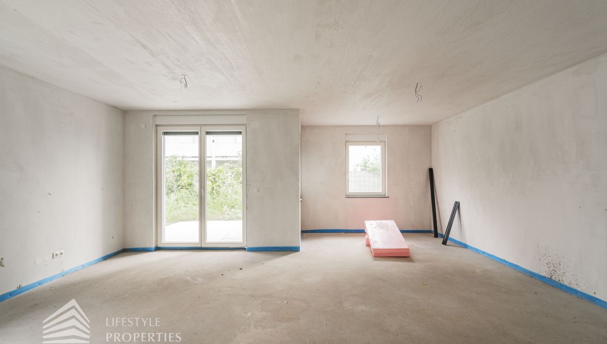 Beim Betreten des Hauses werden Sie in einen großzügigen Eingangsbereich geführt, der den Weg zum Herzstück des Hauses, dem Wohn- und Essbereich, eröffnet. Dieser Bereich bietet ausreichend Platz für Ihre individuellen Einrichtungsideen und wird gänzlich mit Licht durchflutet. Große Fenster eröffnen den Blick auf den eigenen ca. 80 m² großen Garten und schaffen eine harmonische Verbindung zwischen drinnen und draußen. Die angrenzende Terrasse mit ca. 9 m² verlockt dazu, die frische Luft zu genießen, Freunde und Familie zu empfangen oder einfach nur zu entspannen. Auf dieser Ebene finden Sie auch ein äußerst praktisches Gäste-WC, dass den Komfort für Ihre Besucher erhöht, sowie einen zusätzlichen Abstellraum, der Platz für Vorräte und Haushaltsgegenstände bietet.