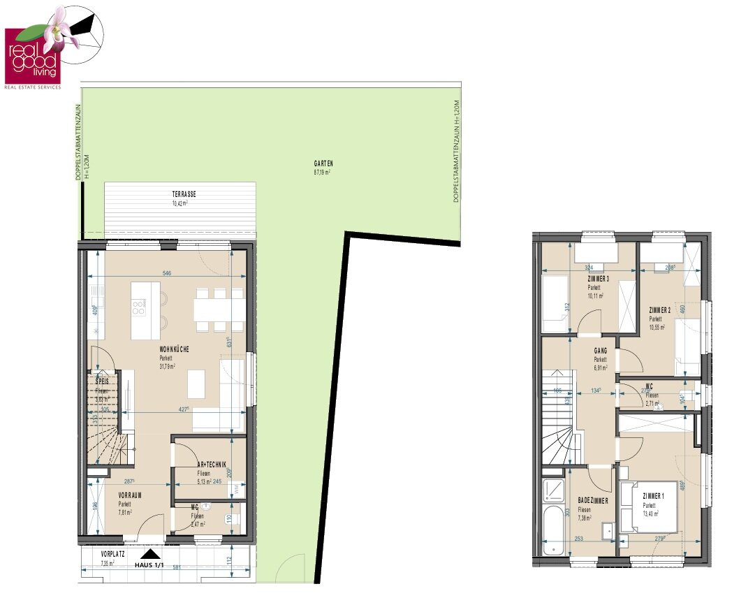 Von der Wohnküche gelangt man direkt auf die ca. 10,42 m² große Terrasse sowie in den ca. 87,19 m² großen Eigengarten .
