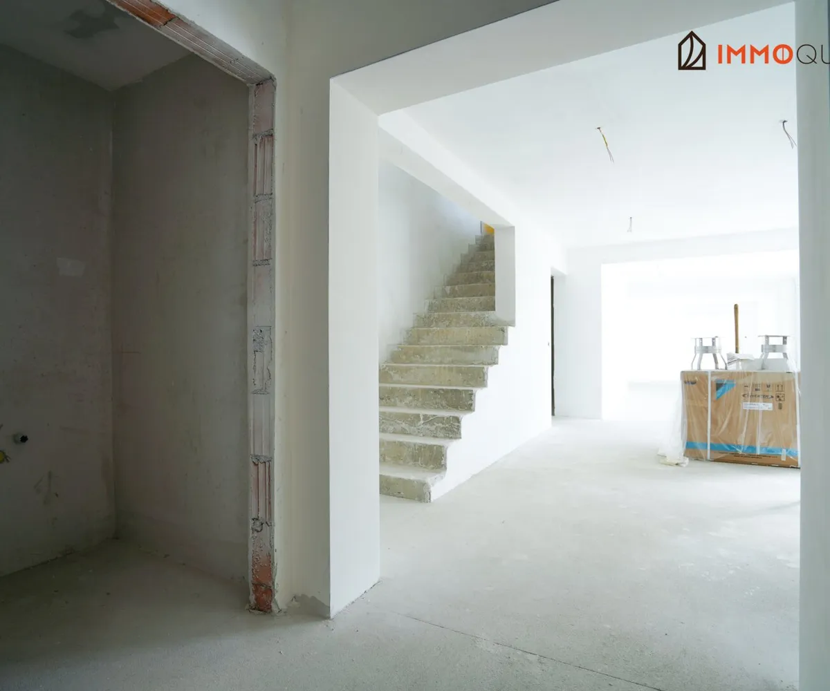 Der Eingangsbereich öffnet sich zu einem weitläufigen Erdgeschoss, das offen gestaltet ist und vielfäl- tige Möglichkeiten für Küche, Essplatz und Wohnzimmer bietet. Große Fensterflächen lassen viel Licht herein und führen hinaus auf die Terrasse – sonnig, geschützt und mit Blick in den Garten, wo der Pool bereits baulich vorbereitet ist.