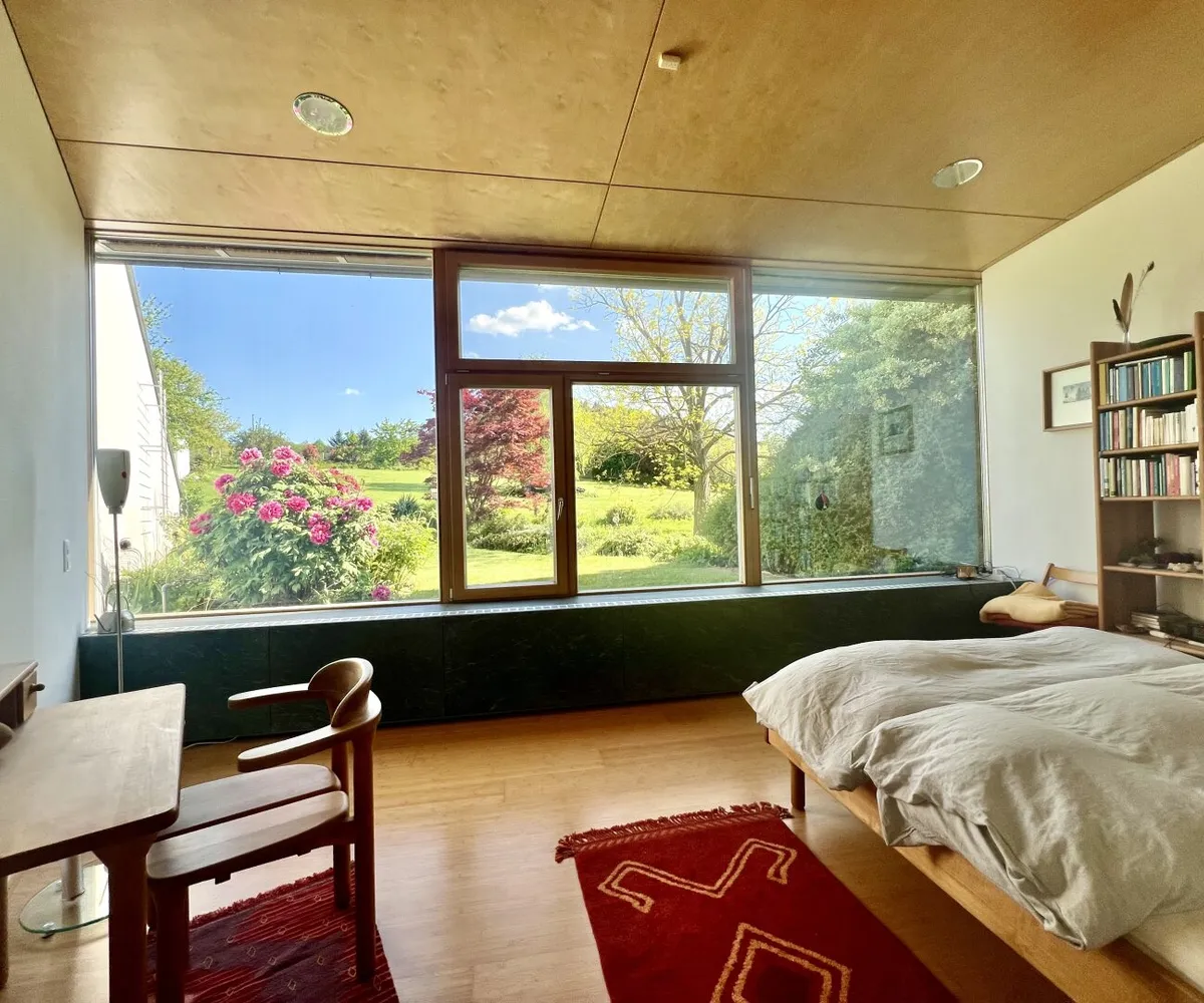 verbindet Form, Funktion und Natur in perfekter Harmonie. Der langgezogene Baukörper öffnet sich großzügig nach Süden hin zur Landschaft, während er sich nach Norden zur Straße hin nahezu vollständig abschottet – ein