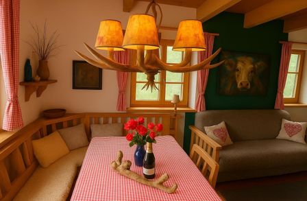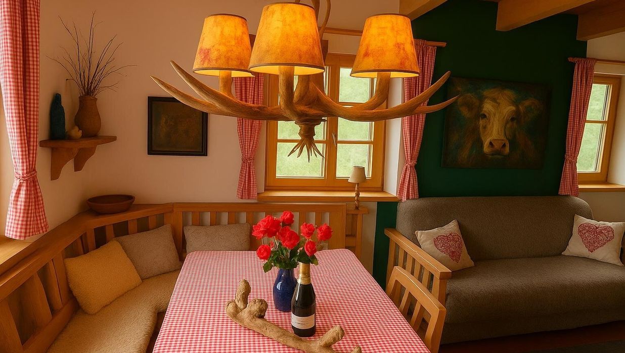 Die Hütte selbst wurde in hochwertiger Holzbauweise vor ca. 20 Jahren errichtet und doppelwandig gedämmt. Auf rund 110 m² Wohnfläche entfaltet sich eine Atmosphäre, die durch natürliche Materialien, warme Oberflächen und eine klare architektonische Handschrift geprägt ist. Im Zentrum steht der gemütliche Wohnbereich, in dem sich Kochen, Essen und Wohnen auf natürliche Weise verbinden. Der traditionelle Holzherd bildet dabei nicht nur eine zuverlässige Wärmequelle, sondern auch den emotionalen Mittelpunkt des Hauses – ein Element, das die ursprüngliche Nutzung als Almhütte spürbar macht und gleichzeitig ein Gefühl von Geborgenheit vermittelt.