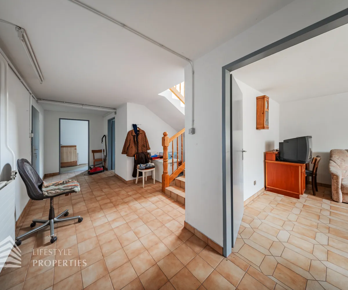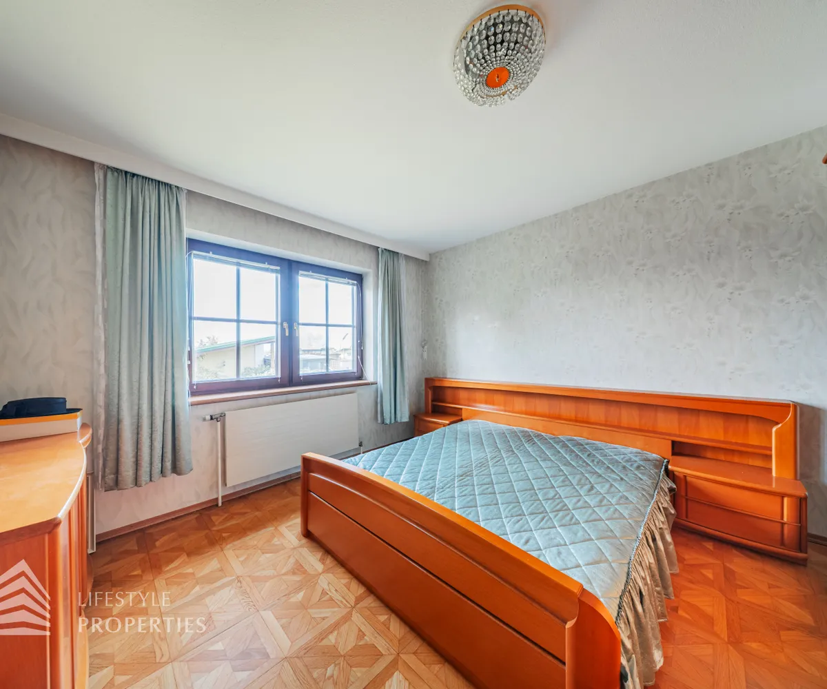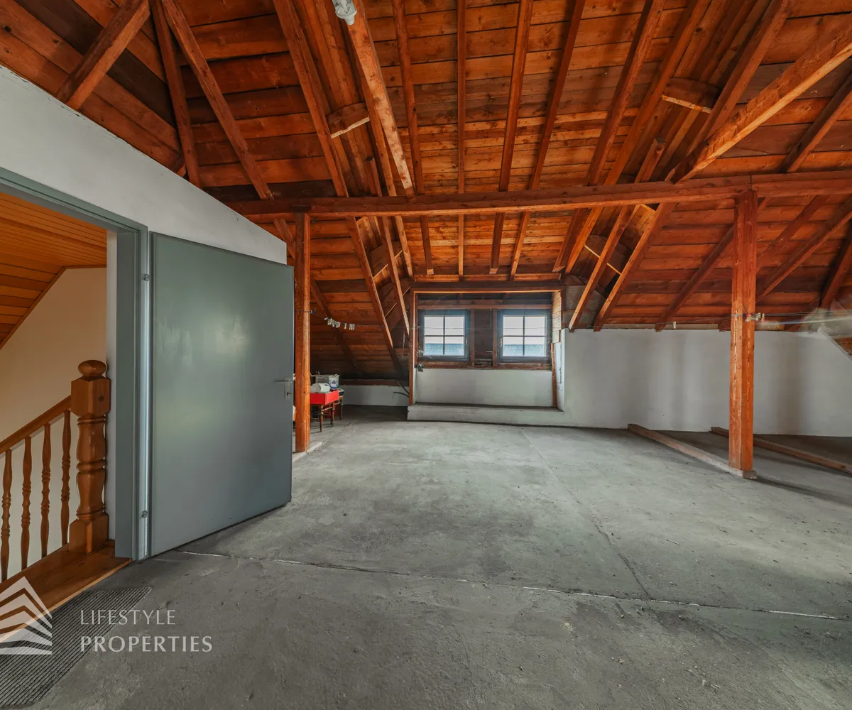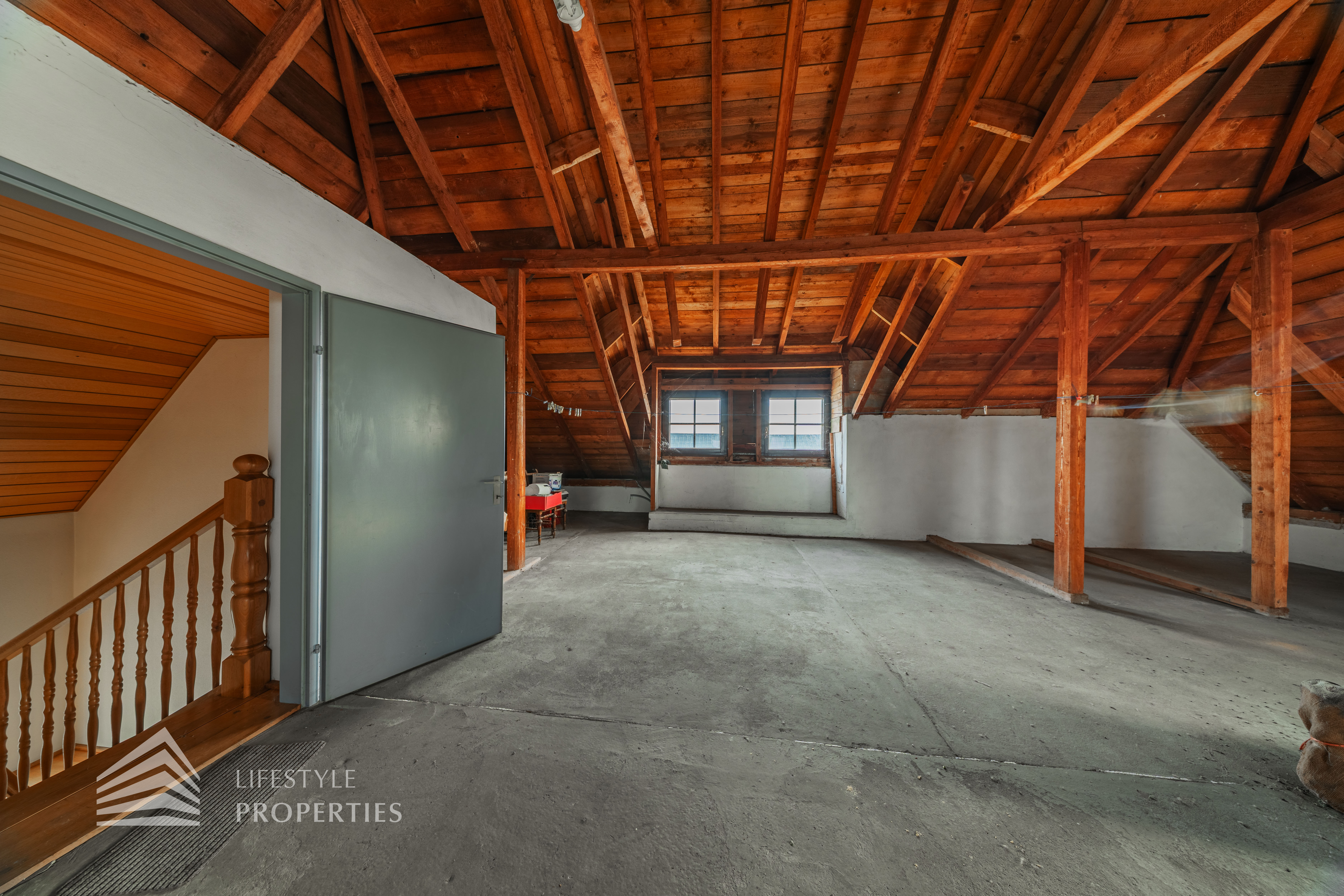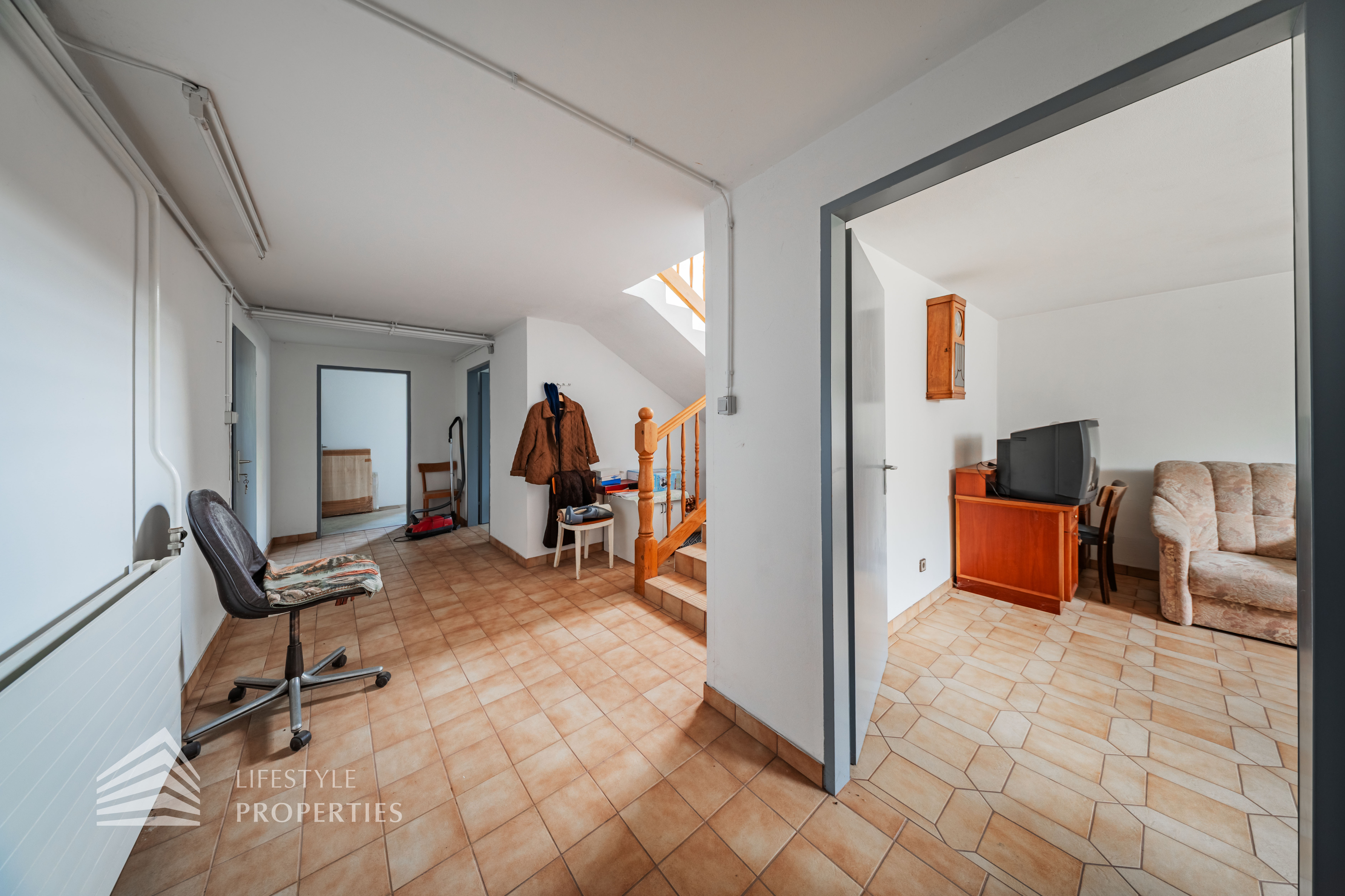 Dieses Einfamilienhaus bietet zahlreiche Vorteile: Sofortiger Einzug ist möglich, das großzügige Grundstück mit Garten schafft Raum für individuelle Nutzung, das Dachgeschoss bietet Ausbaupotenzial, die wind- und regengeschützte Terrasse lädt zum Verweilen ein, die Garage sowie der Stellplatz runden das Angebot ab. Die Liegenschaft verbindet die Vorteile ruhigen Landlebens mit der Nähe zur Hauptstadt und ist ideal für Familien oder Käufer, die ein individuell gestaltbares Zuhause suchen.