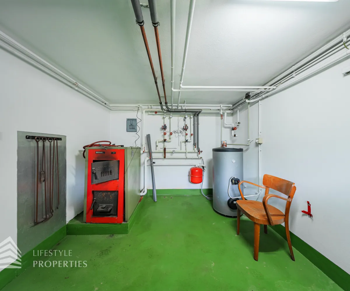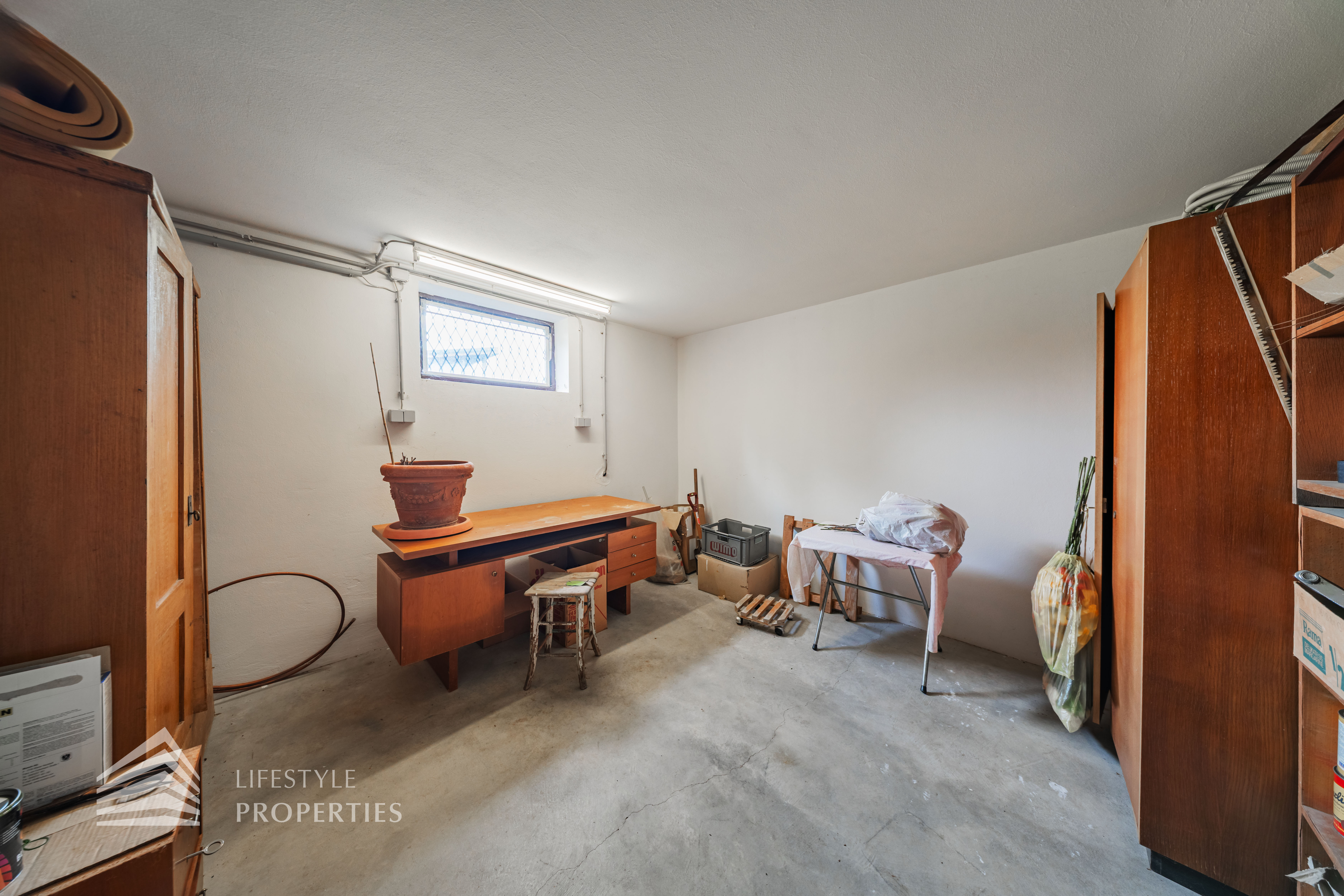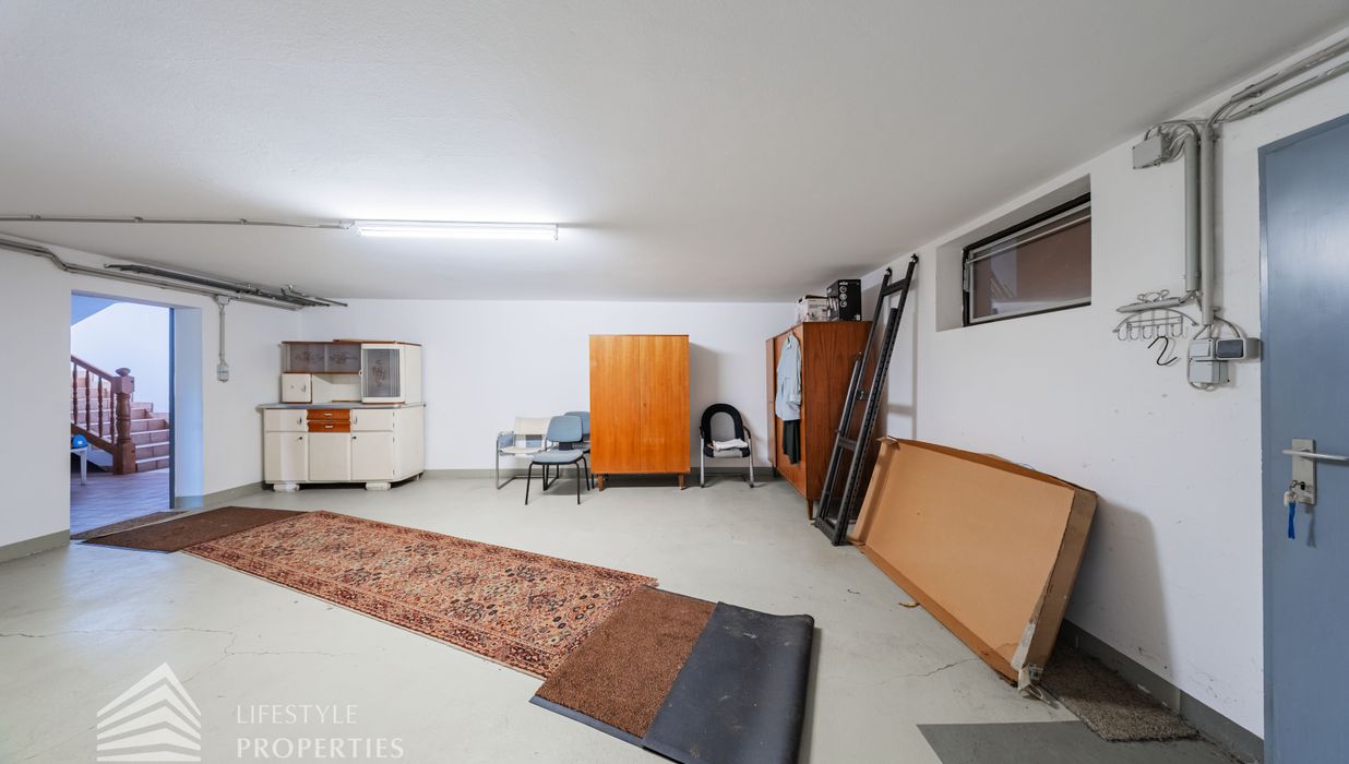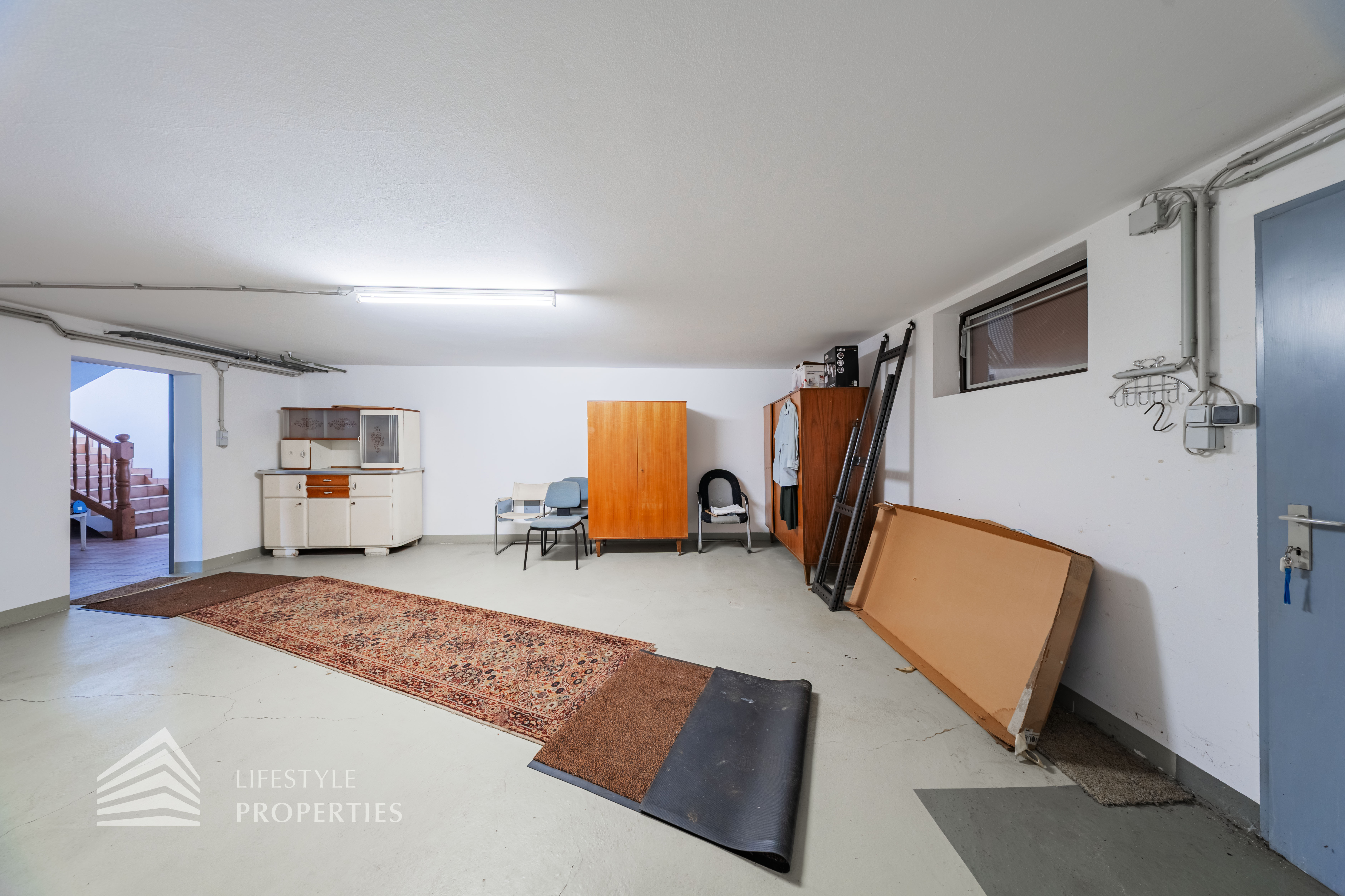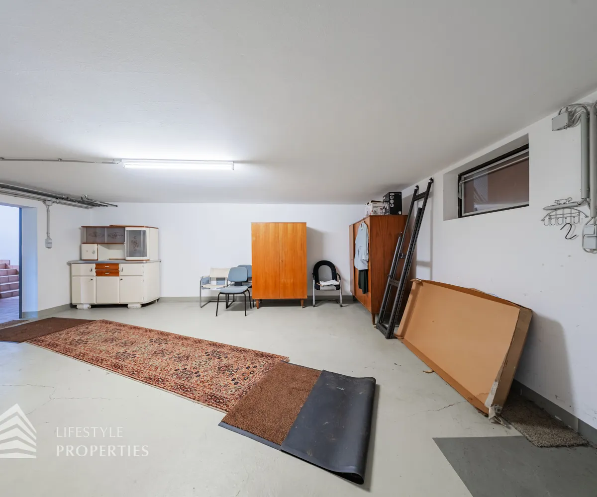 Das Kellergeschoss teilt sich auf in vier Kellerräume, zwei Lagerräume und einen Heizraum.