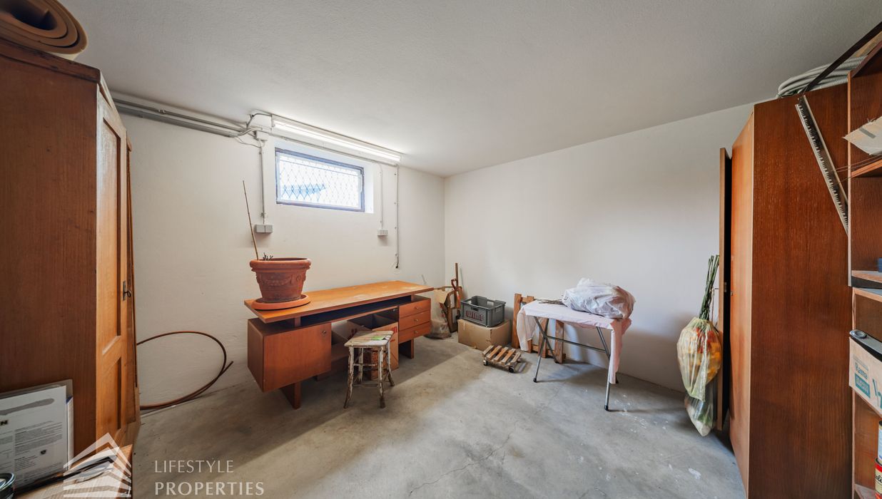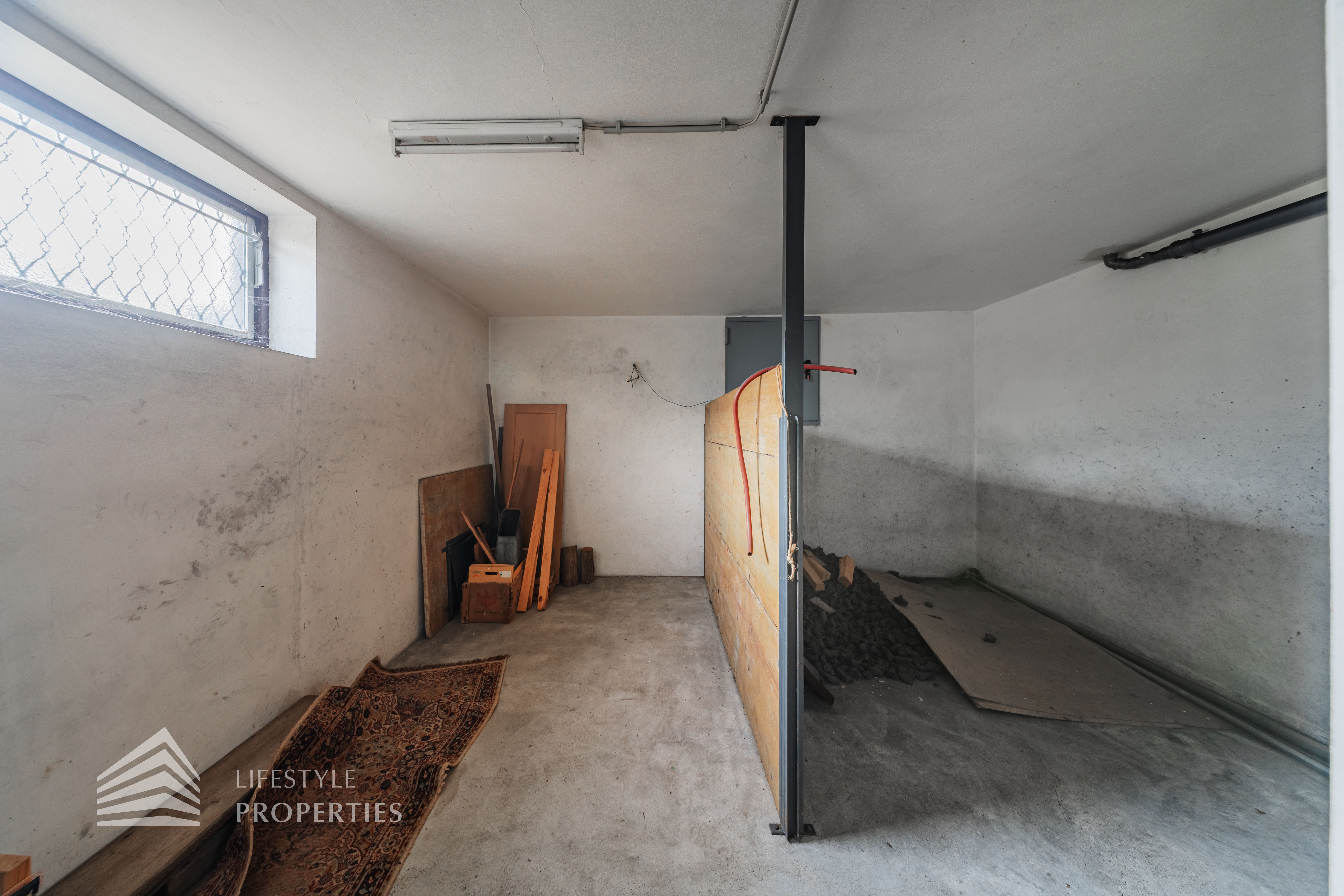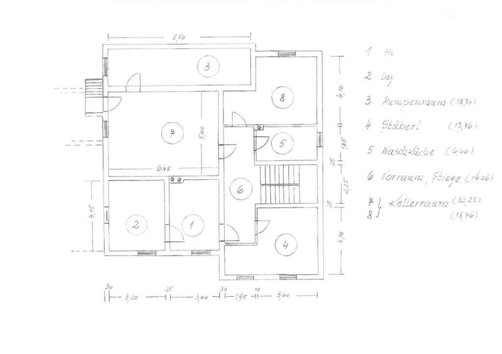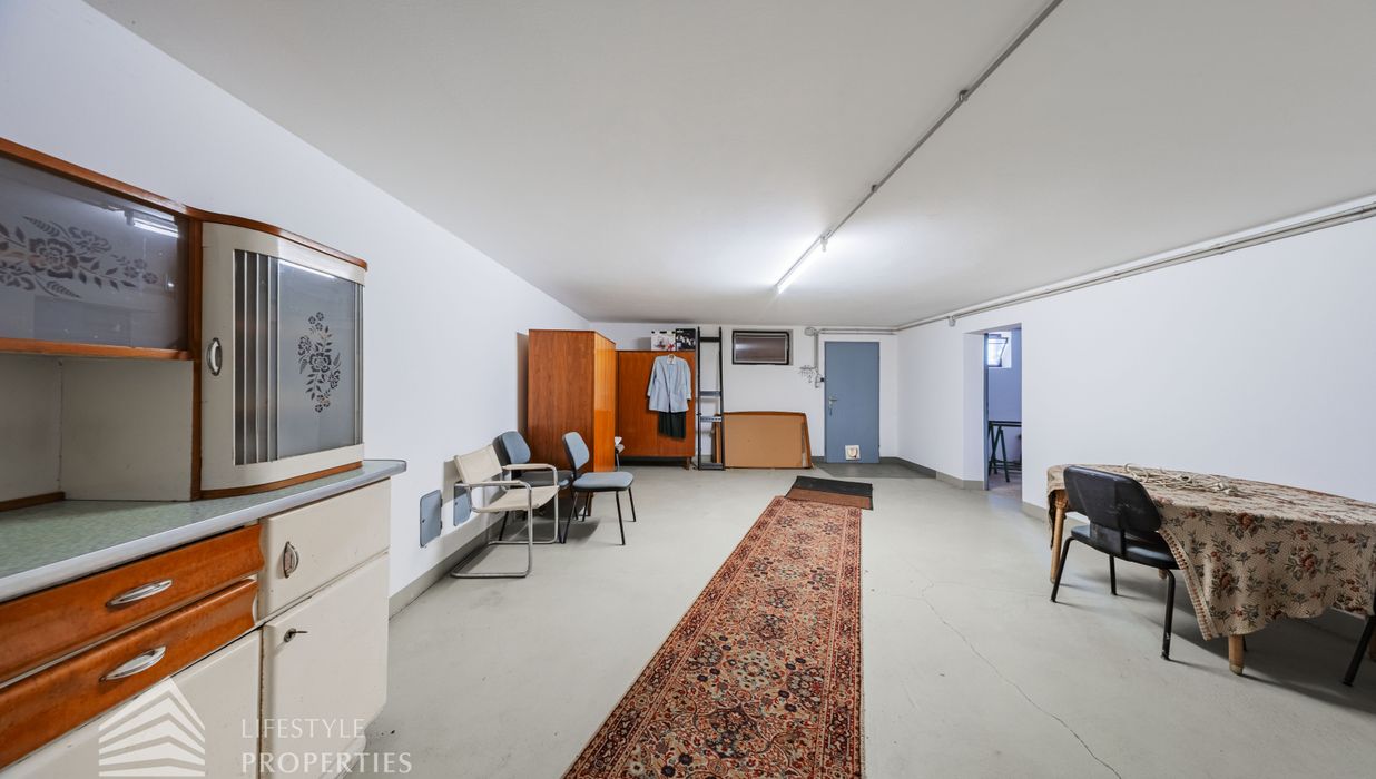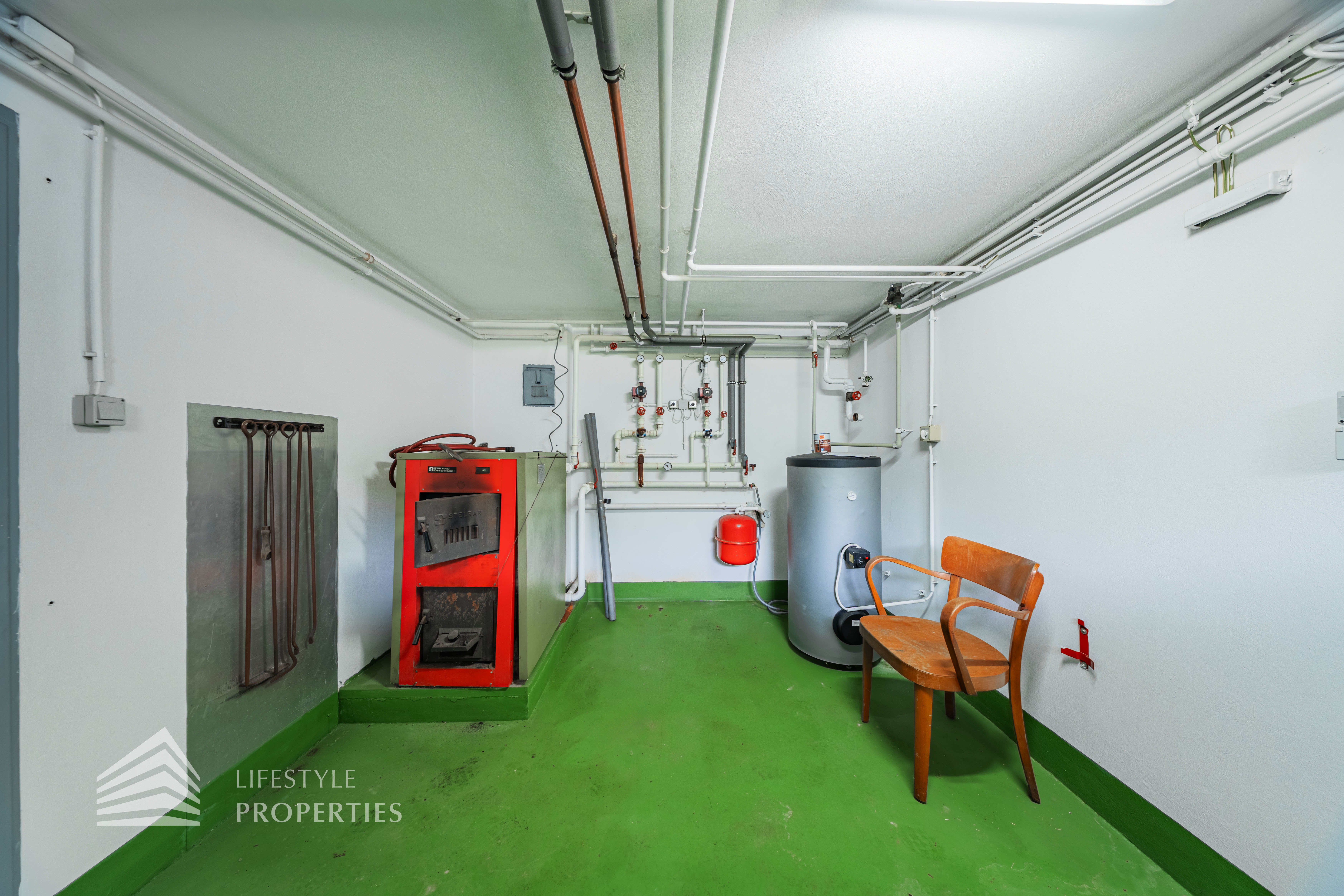 Das Kellergeschoss teilt sich auf in vier Kellerräume, zwei Lagerräume und einen Heizraum.
