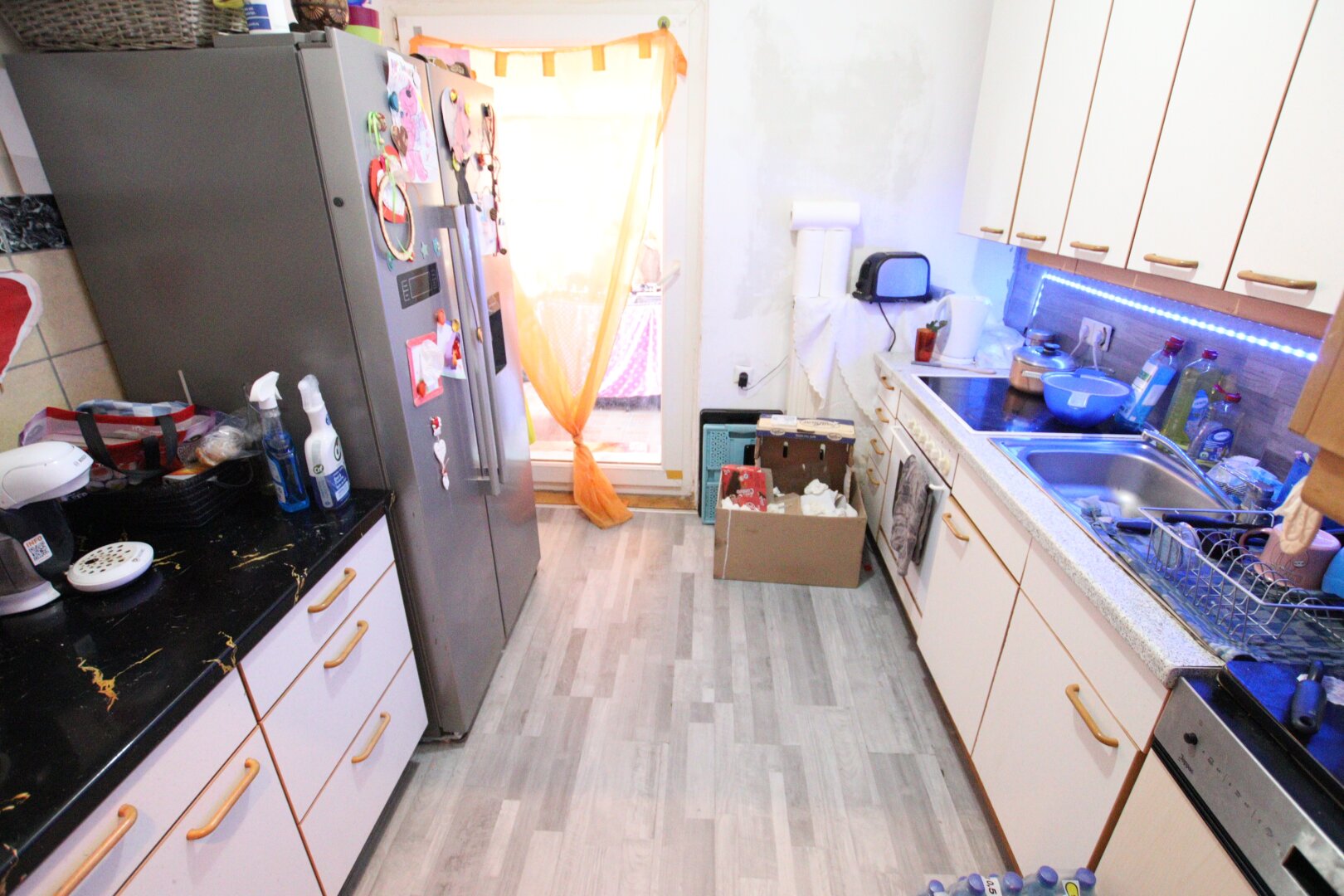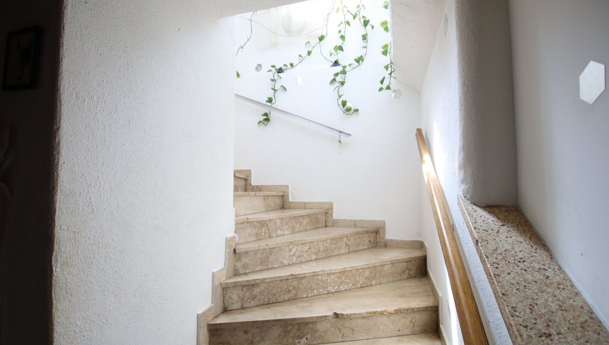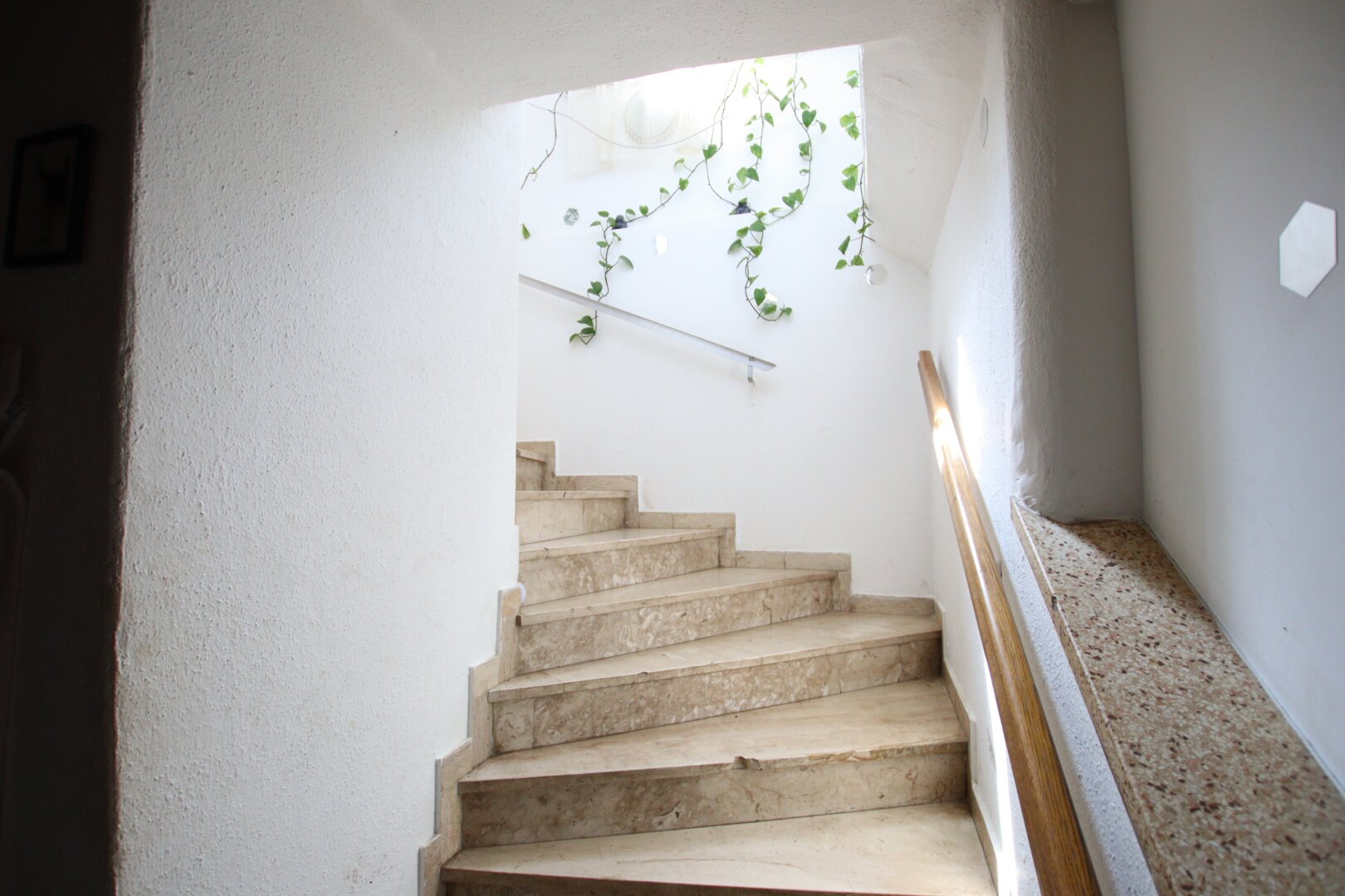 Böden: Fliesen-, ältere Marmor- und Laminatböden.