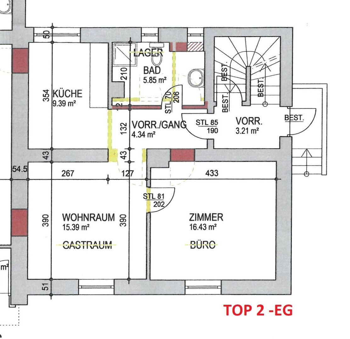 2. OBERGESCHOSS: Wohnung TOP 4 (ca. 100,00m² Nfl.) = bestehend aus Windfang/Diele, 1 großes Wohn-/Esszimmer mit offener Wohnküche, 3 Schlafzimmer, 1 Bad mit Badewanne und WC.