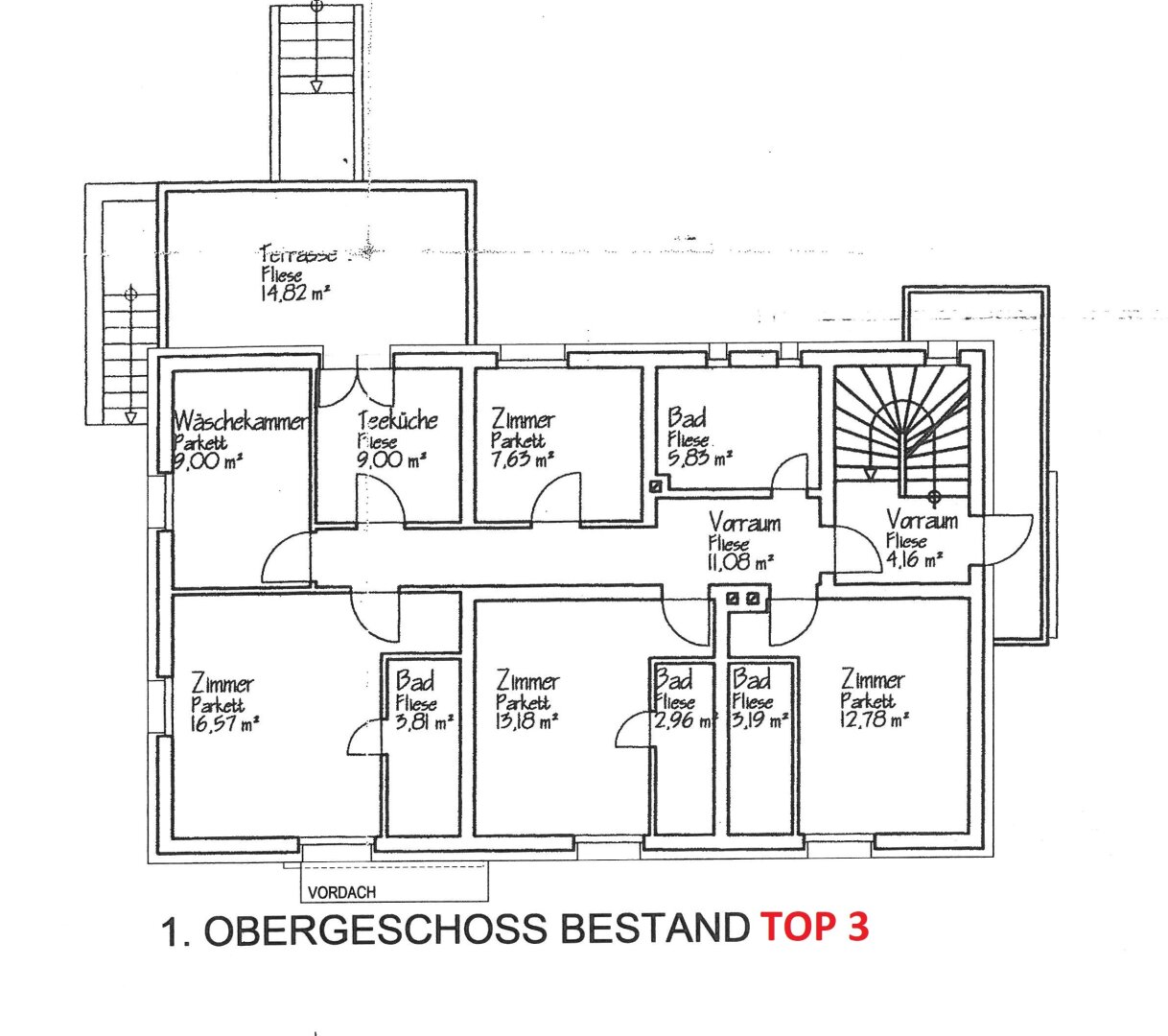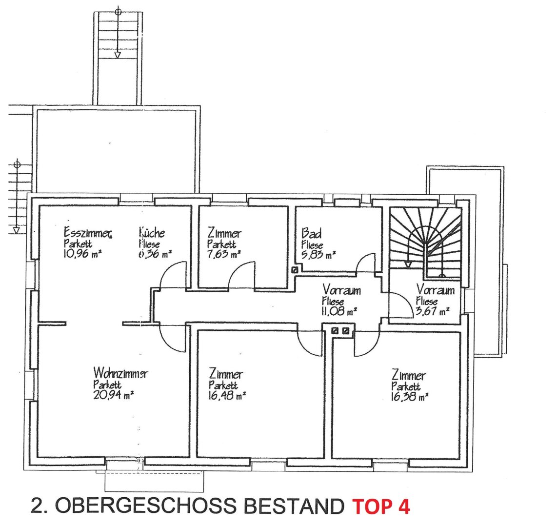 1. OBERGESCHOSS: Wohnung TOP 3 (ca. 96,00m² Nfl.) = bestehend aus Windfang/Diele, 1 Wohn-/Esszimmer, 1 Küche mit Wintergarten, 4 Schlafzimmer und 1 Bad mit WC.