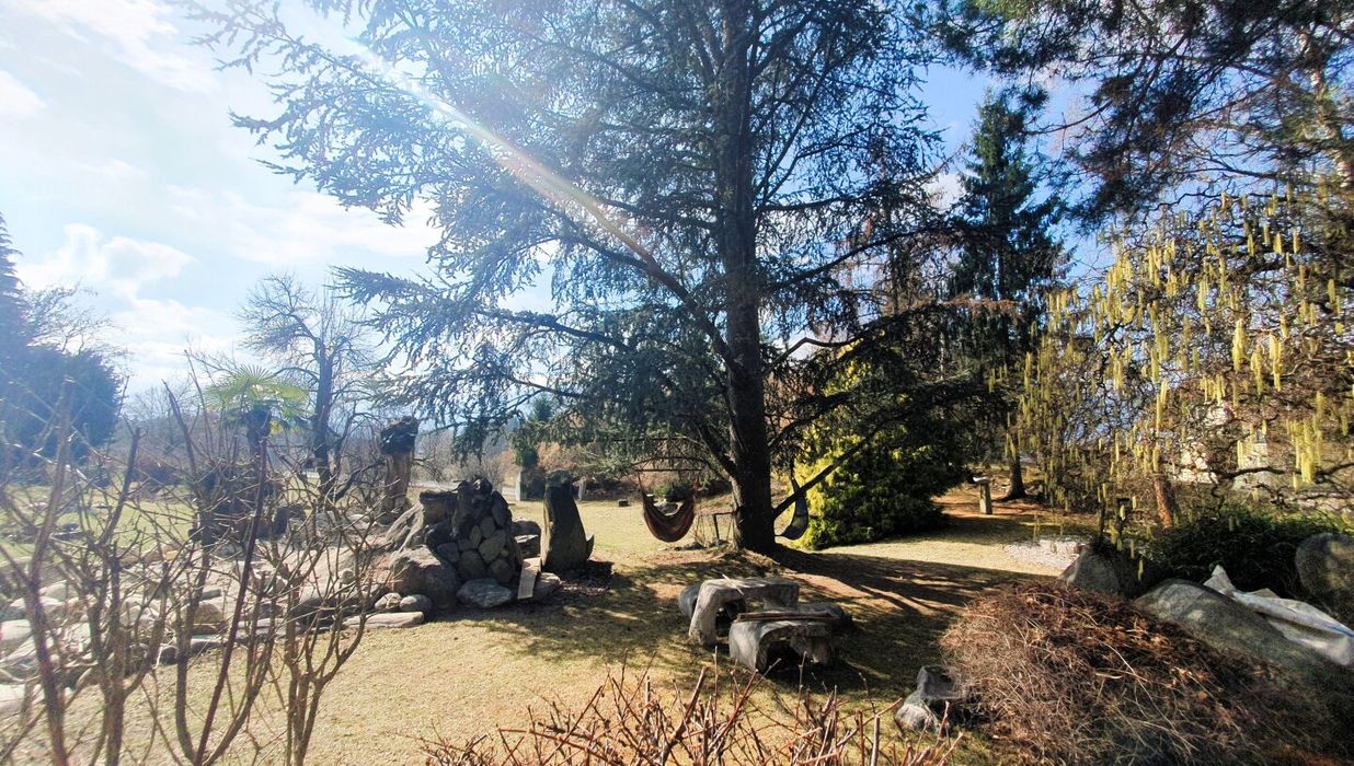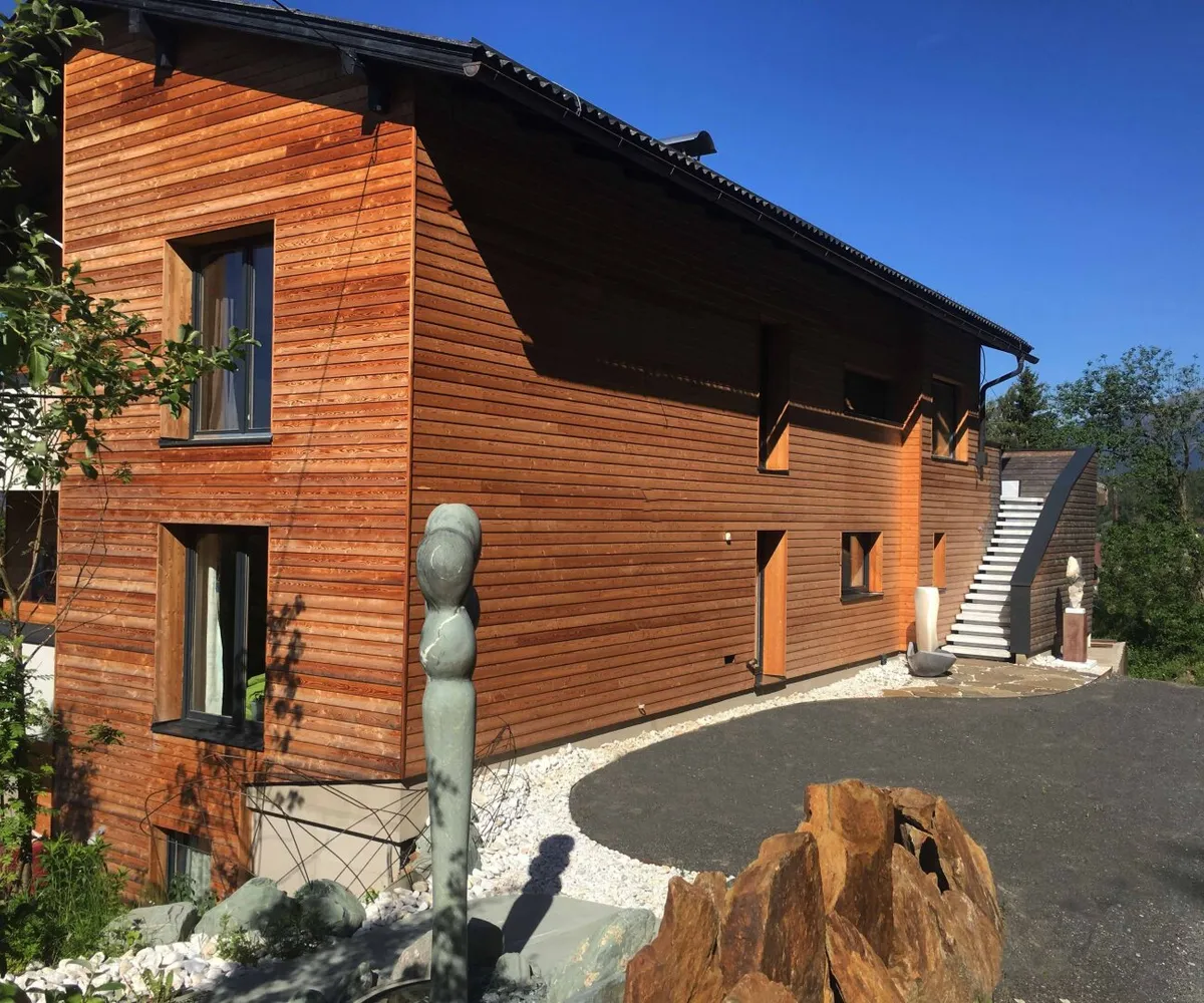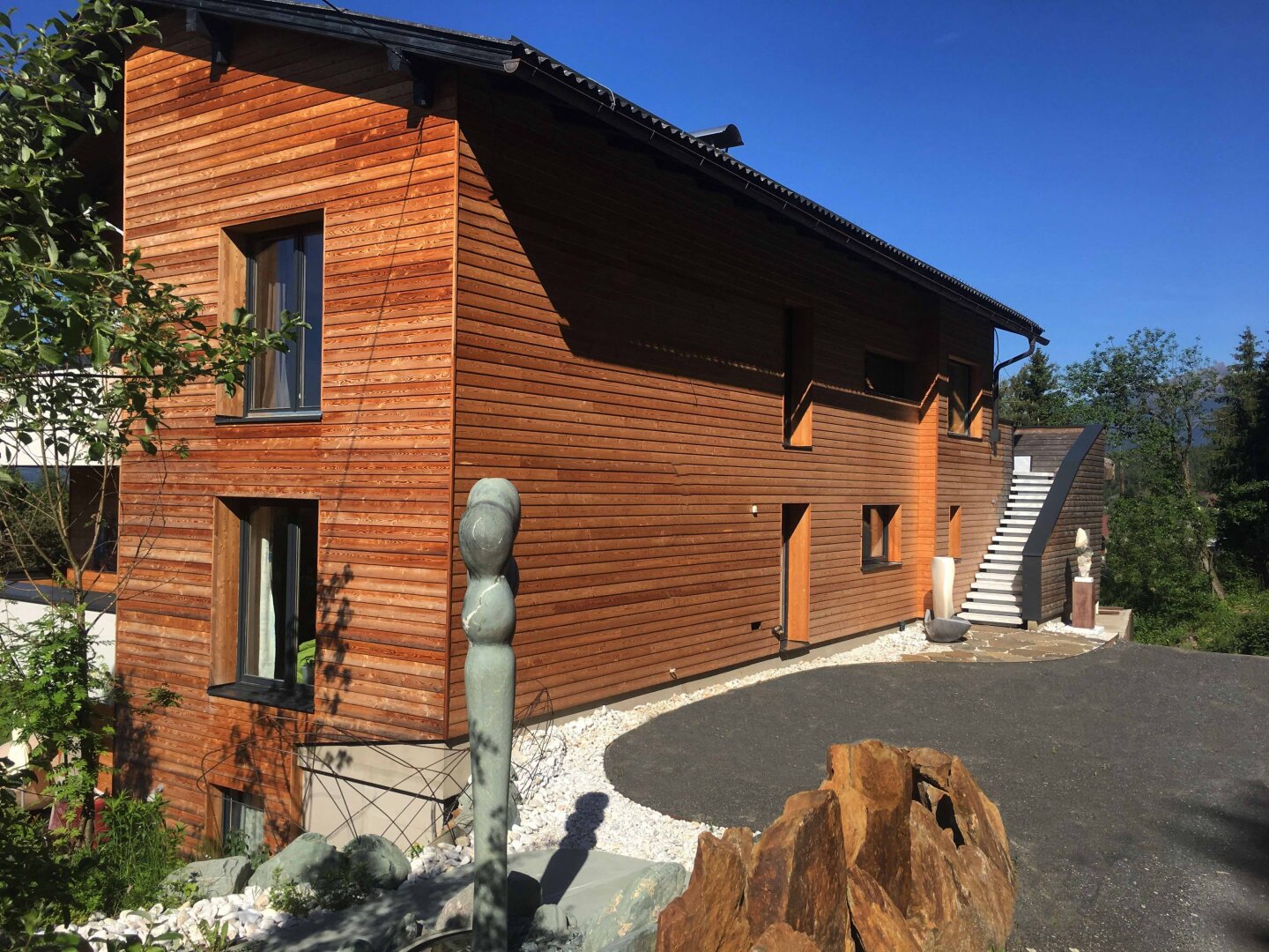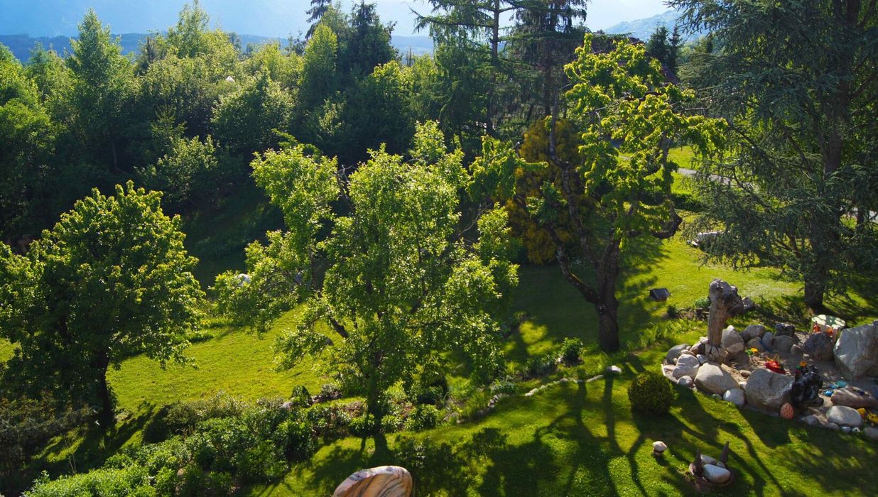 Der Garten ist mehr als Außenfläche – er ist Inszenierung und Rückzugsraum zugleich. Kunstobjekte setzen bewusst Akzente im Grün und rahmen den freien Blick über das rund 90 Kilometer lange Alpenpanorama. Die Skulpturen sind nicht im Kaufpreis enthalten, können jedoch bei ernsthaftem Interesse separat erworben werden.