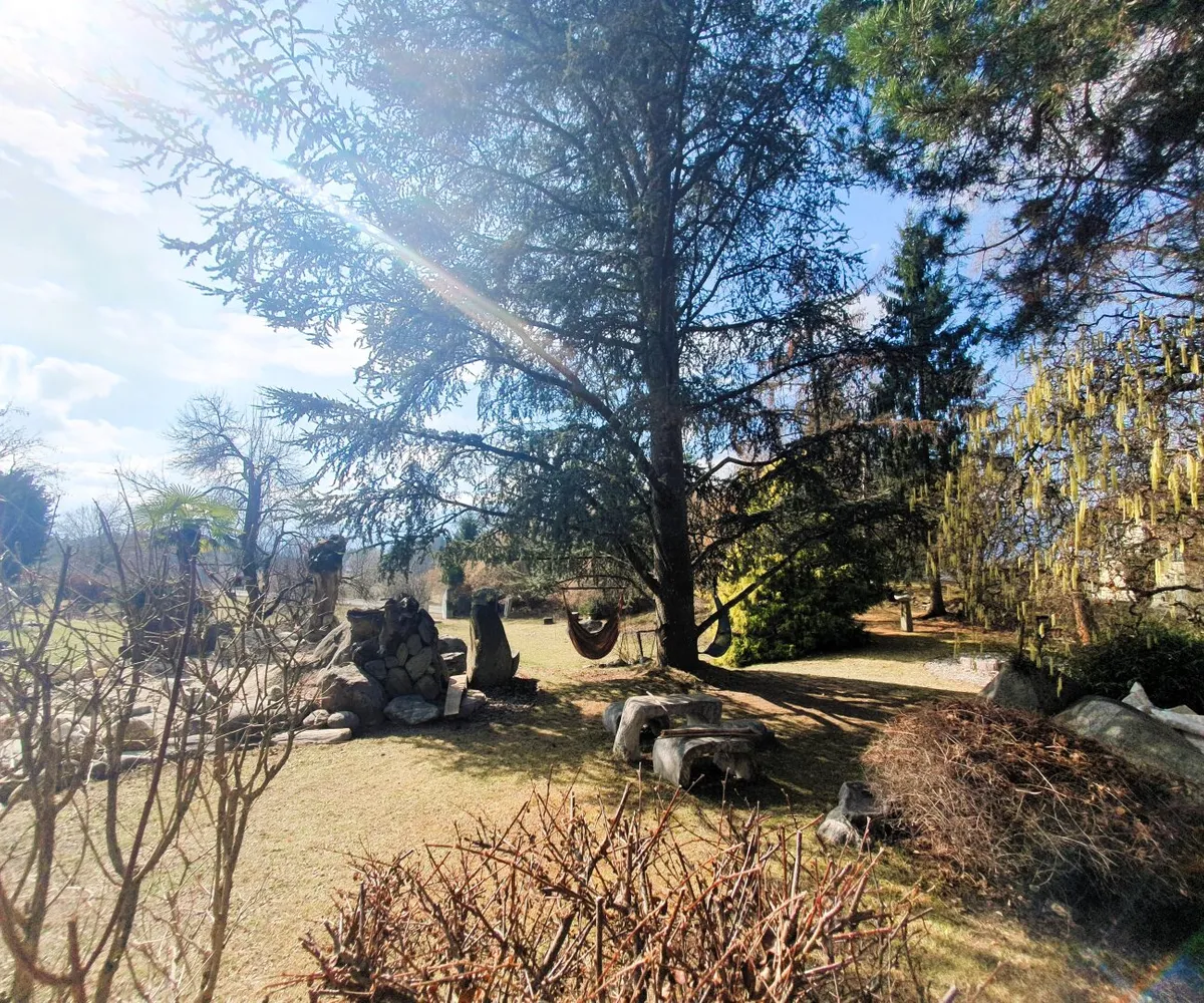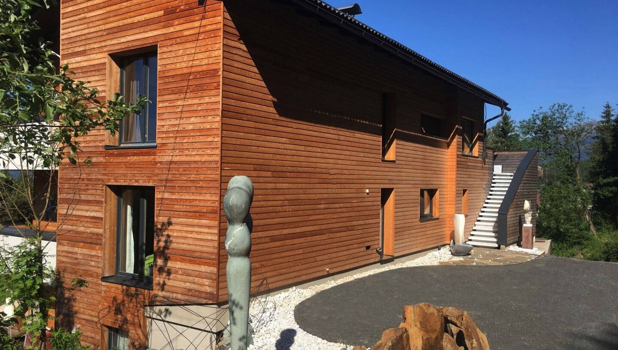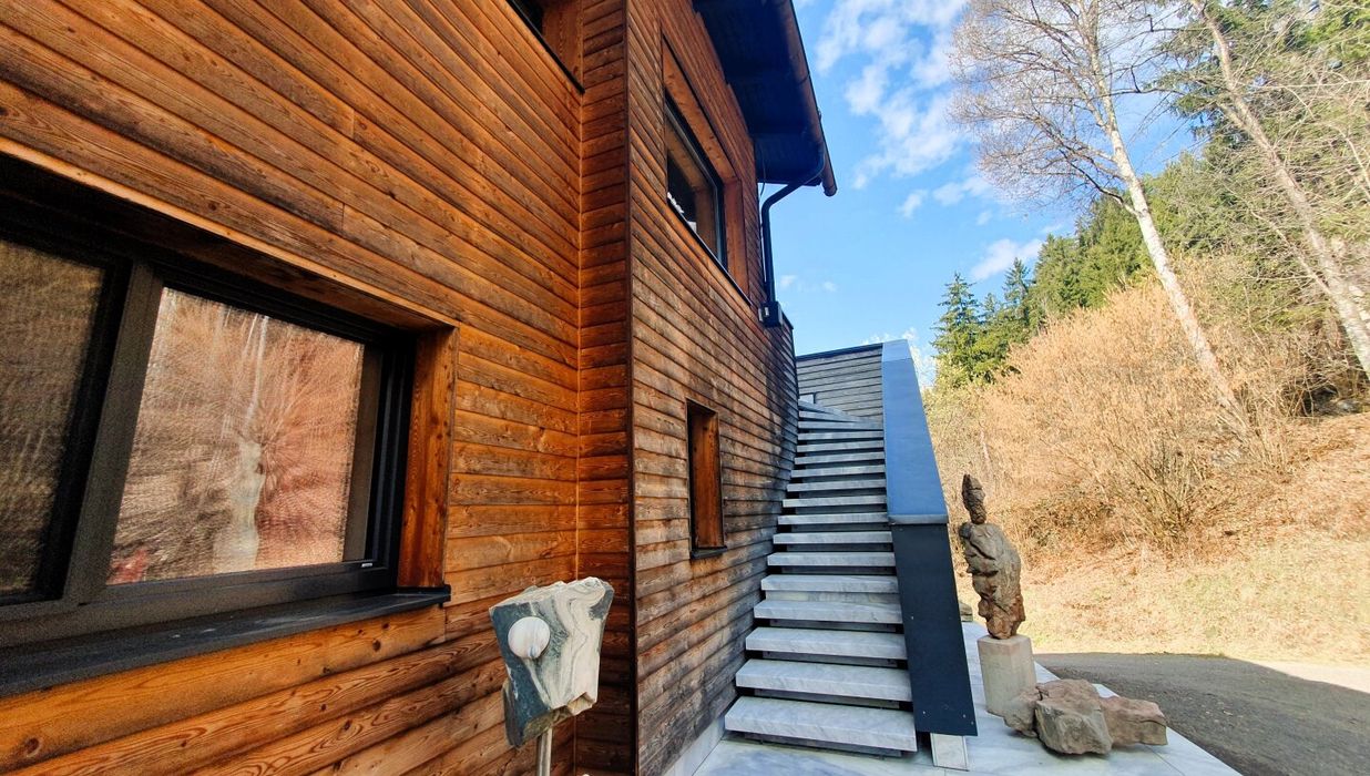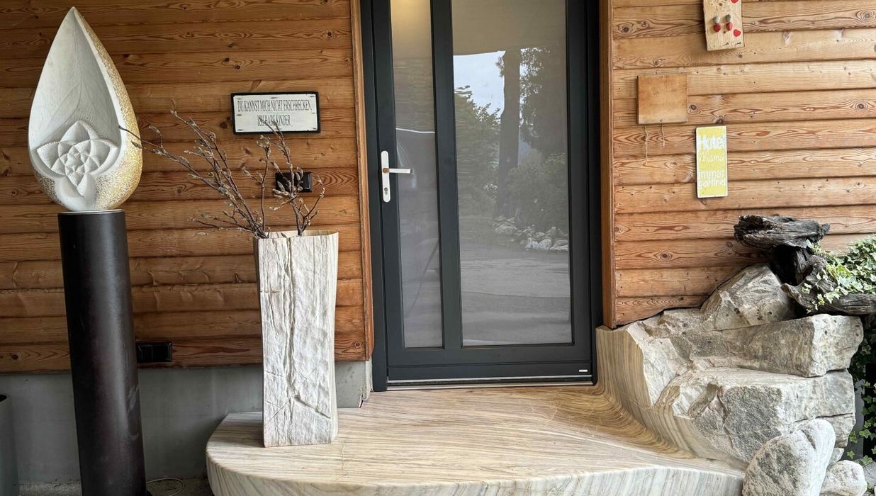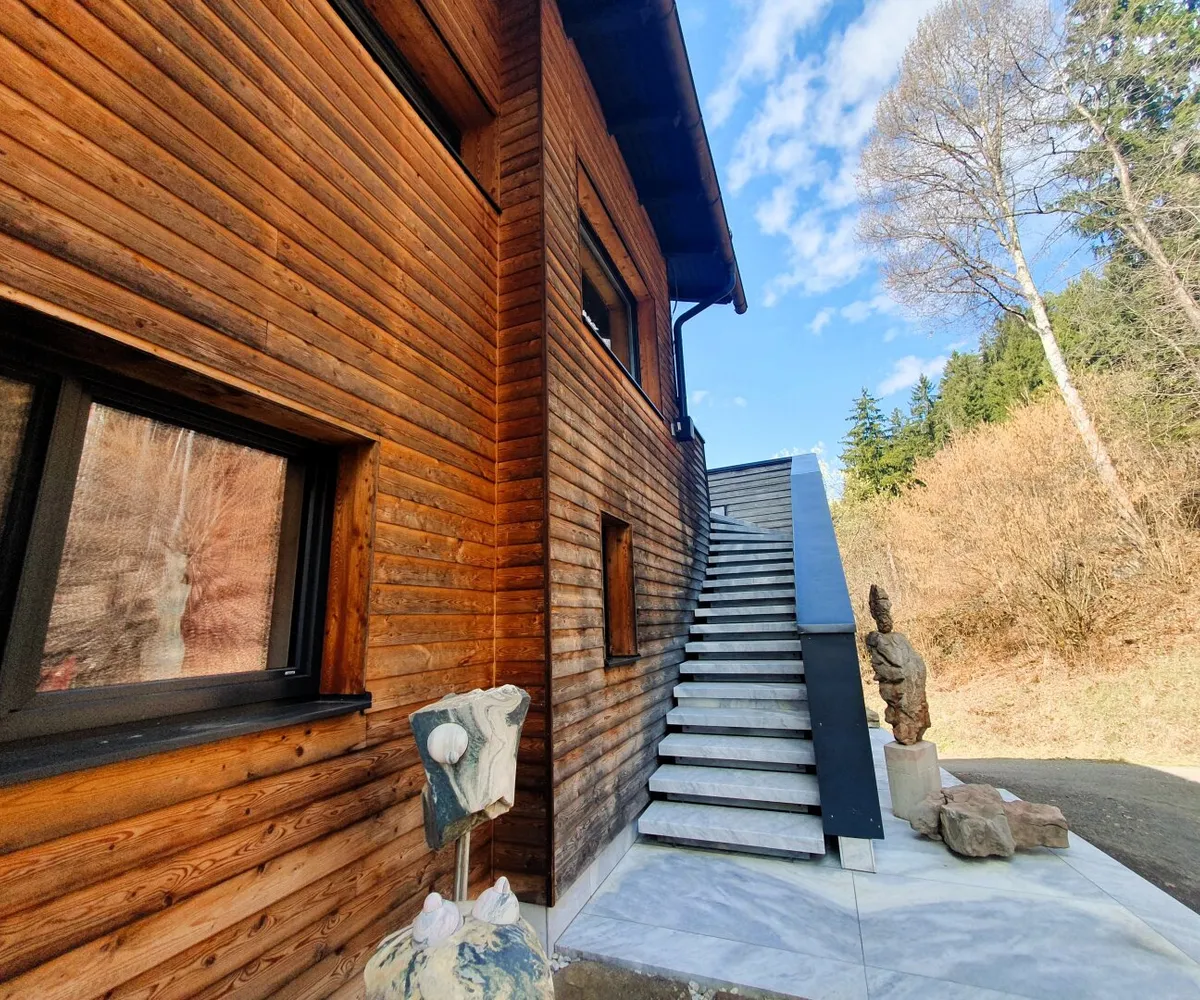 Der Garten ist mehr als Außenfläche – er ist Inszenierung und Rückzugsraum zugleich. Kunstobjekte setzen bewusst Akzente im Grün und rahmen den freien Blick über das rund 90 Kilometer lange Alpenpanorama. Die Skulpturen sind nicht im Kaufpreis enthalten, können jedoch bei ernsthaftem Interesse separat erworben werden.