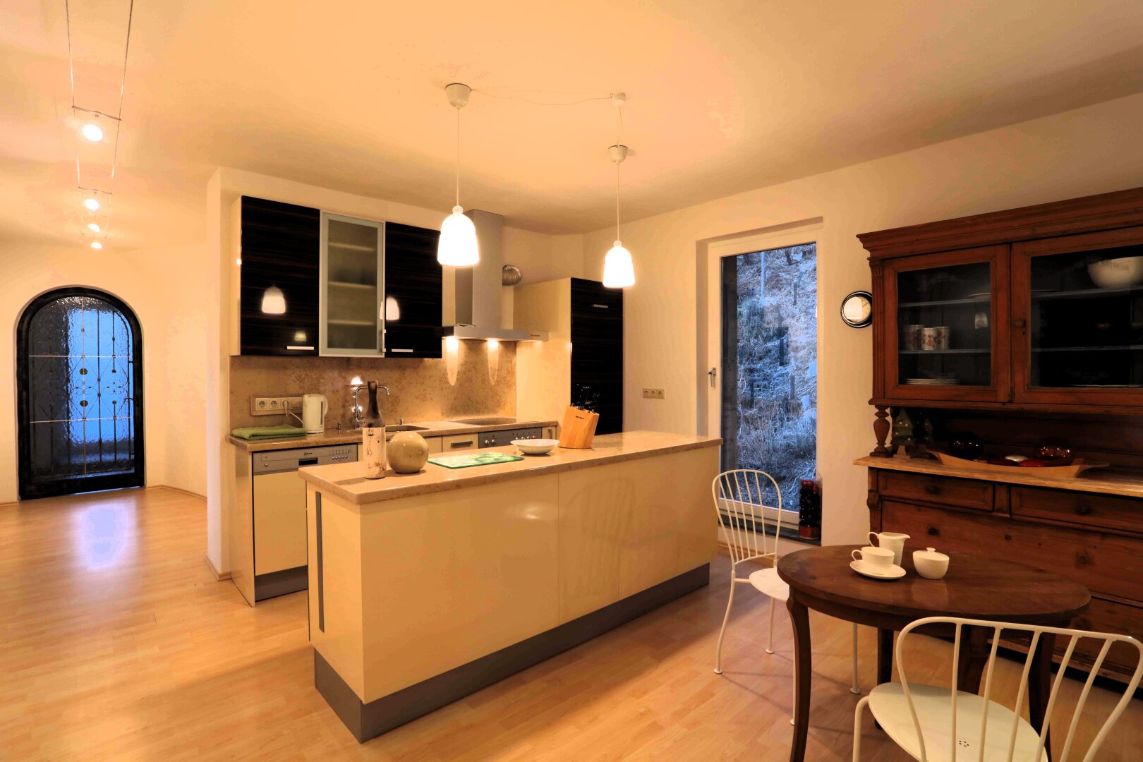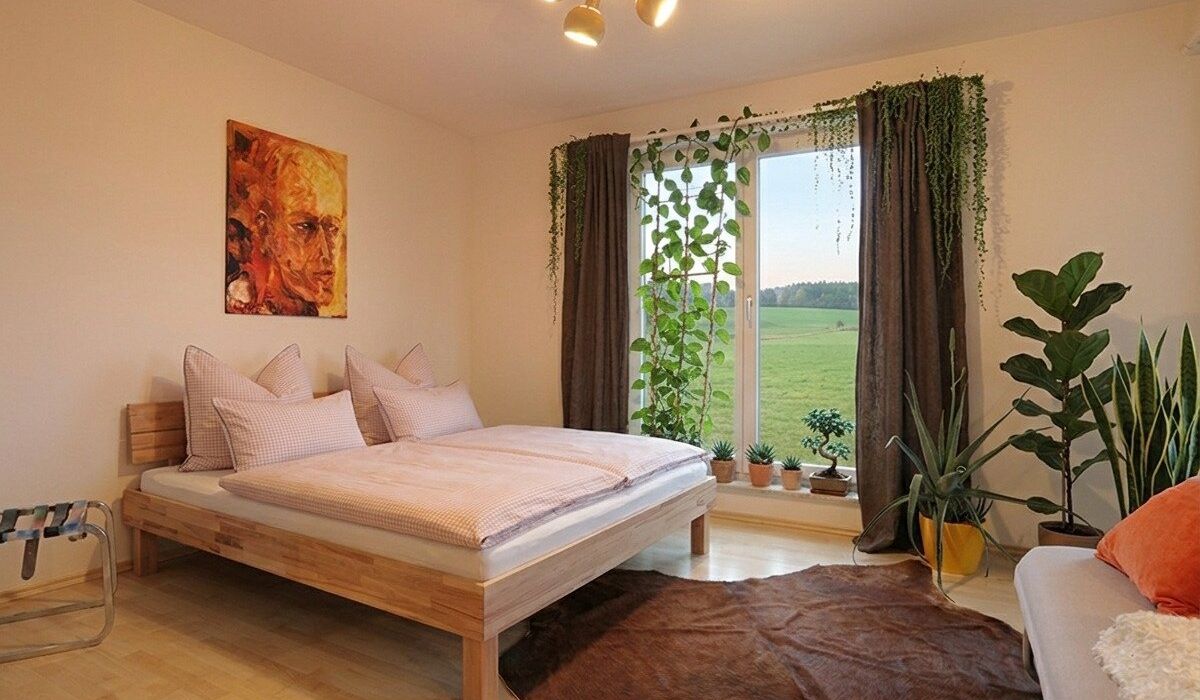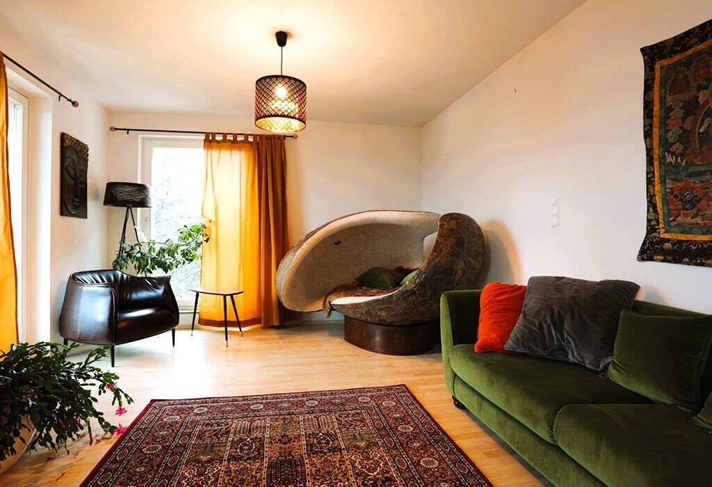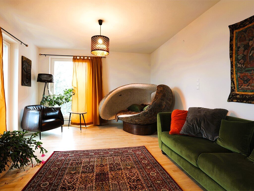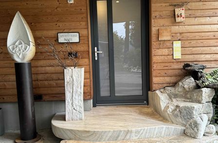 Der Garten ist mehr als Außenfläche – er ist Inszenierung und Rückzugsraum zugleich. Kunstobjekte setzen bewusst Akzente im Grün und rahmen den freien Blick über das rund 90 Kilometer lange Alpenpanorama. Die Skulpturen sind nicht im Kaufpreis enthalten, können jedoch bei ernsthaftem Interesse separat erworben werden.
