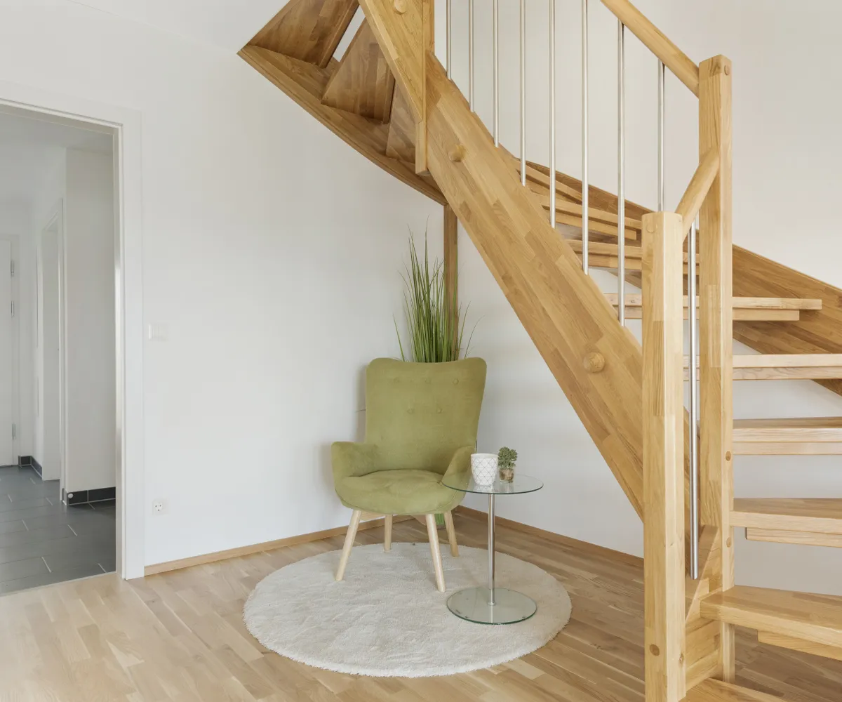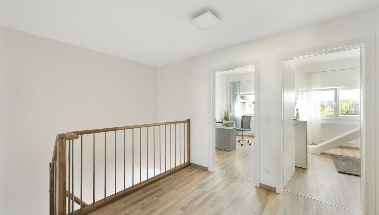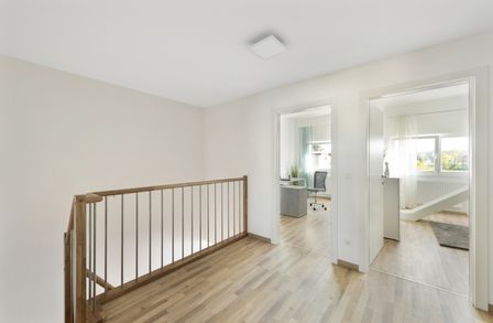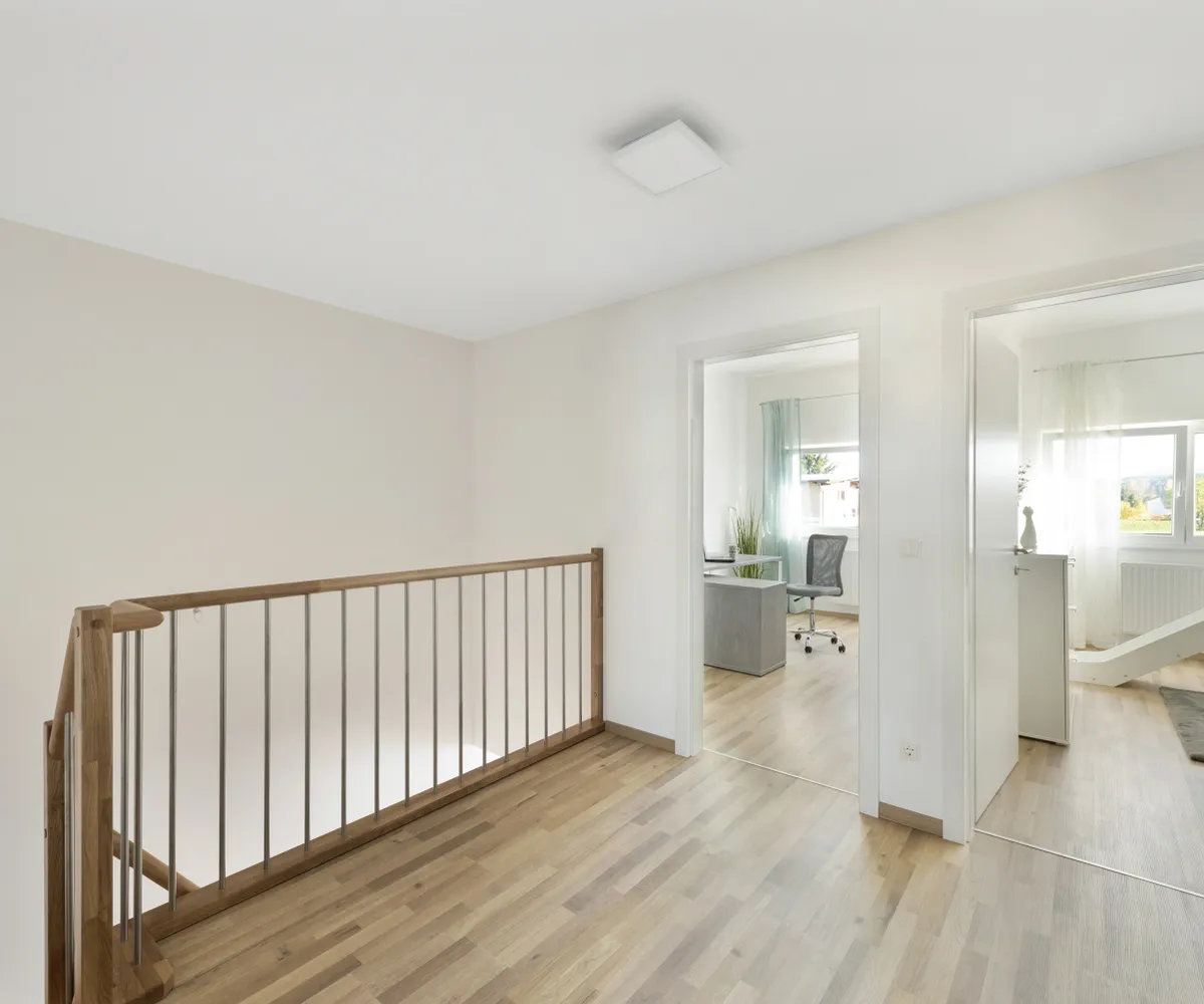 Das Erdgeschoß jeder Einheit besteht aus einem lichtdurchfluteten, offenen Wohn-, Koch- und Essbereich mit Zugang auf die Terrasse und in den Garten. Vorzimmer, ein Gäste-WC, der Technikraum und ein zusätzlicher Abstellraum komplettieren diese Ebene. Eine elegante Holztreppe führt zu Galerie/Vorraum (je nach Haustyp) ins Obergeschoß. Davon abgehend befinden sich drei getrennt begehbare Schlafzimmer sowie in ein geräumiges Badezimmer mit Fenster und WC. Zusätzliche Stellfläche bietet das BIOHORT-Gerätehaus im Garten .