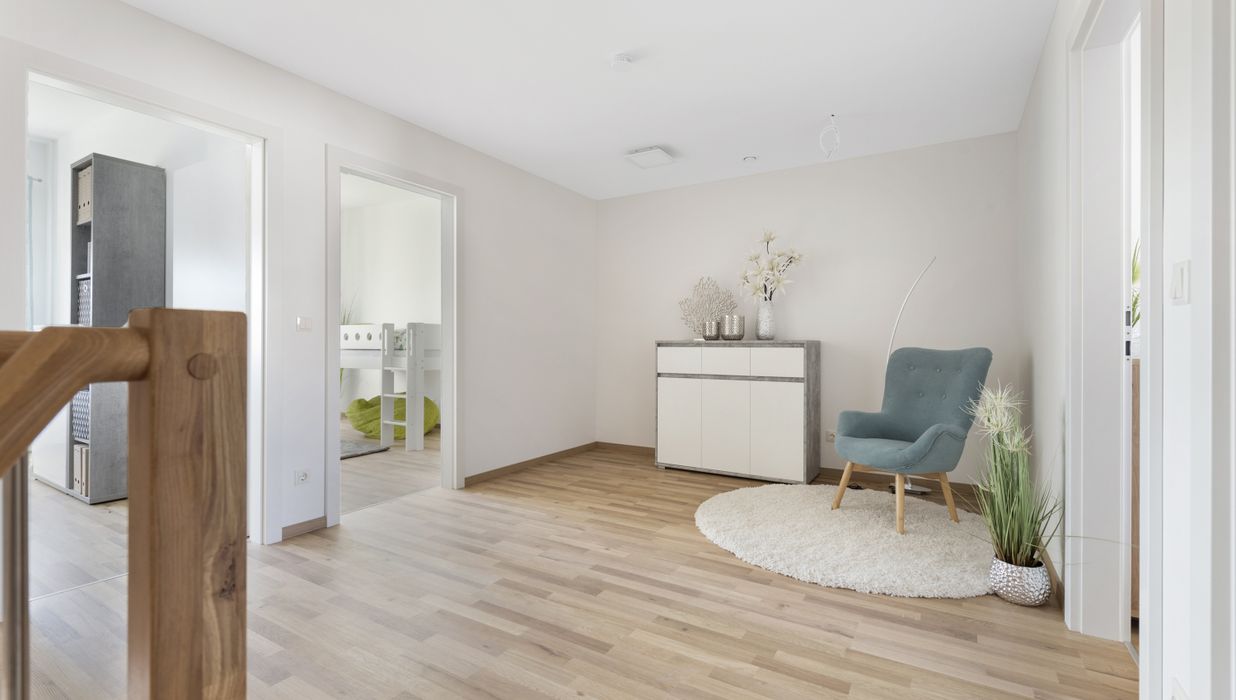 Das Erdgeschoss besteht aus einem lichtdurchfluteten offenen Wohn-, Koch- und Essbereich mit Zugang auf die Terrasse und in den Garten. Vorzimmer, ein Gäste-WC, der Technikraum und ein zusätzlicher Abstellraum komplettieren die Garten-Ebene. Eine elegante Holztreppe führt ins Obergeschoss, wo sich die BewohnerInnen und Gäste in drei getrennt begehbare Schlafzimmer mit einer Galerie oder einem Vorraum je nach Haustyp, sowie in ein geräumiges Badezimmer mit Fenster und einem WC zurückziehen können. Zusätzliche Stellfläche bietet das Gerätehaus im Garten .